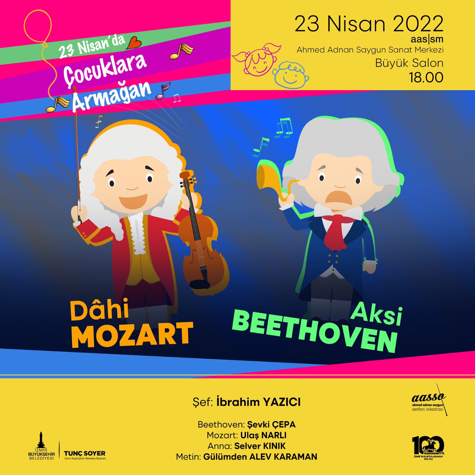 23 Nisan’da Ahmet Adnan Saygun Sanat Merkezi (AASSM) Büyük Salon’da saat 18.00’de AASSM Senfoni Orkestrası’nın 23 Nisan Özel Konseri var. İbrahim Yazıcı yönetimindeki “Dâhi Mozart Aksi Beethoven” konserine Başkan Soyer de katılacak. Geçen aylarda AASSM Küçük Salon’da sergilenen ve biletleri hızla tükenen Bu Ne Biçim Mozart ve Hay Aksi Beethoven gösterilerinin 23 Nisan’a özel bir düzenlemeyle sunulacağı konserde çok bilinen klasik müzik eserlerinin seslendirilmesinin yanı sıra Devlet Tiyatrosu sanatçısı Ulaş Narlı genç Mozart ve Şevki Çepa genç Beethoven rollerinde olacak.