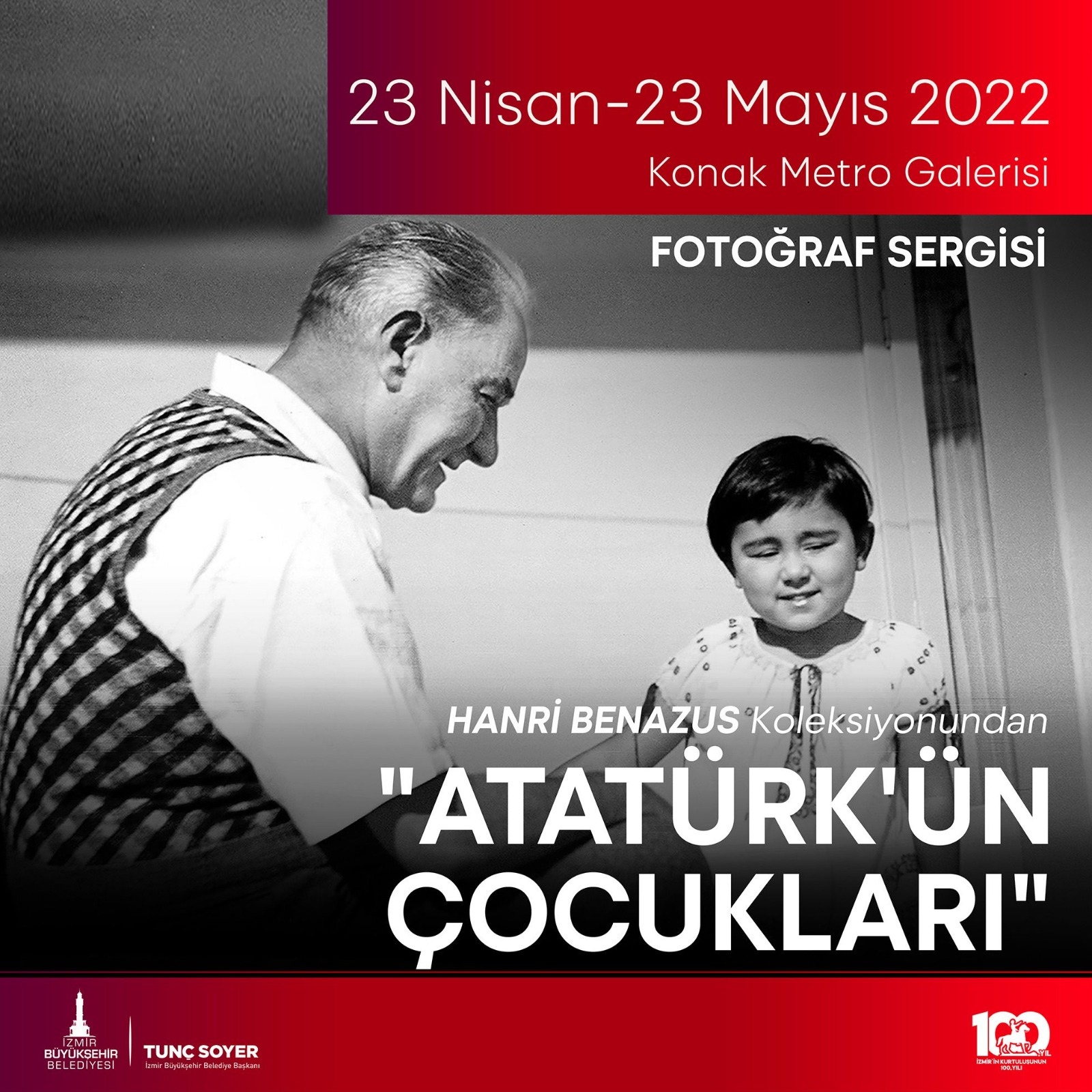 23 Nisan’da Konak Metro Galeri’de Hanri Benazus Koleksiyonu Atatürk ve Çocuk Fotoğrafları Seçkisi isimli sergi açılacak. İzmir’e kazandırılan Konak Metro Galerisi bu etkinlikle sanatseverlerle ilk defa buluşacak. Sergide Mustafa Kemal Atatürk’ün Trablusgarp’ta bulunduğu 1912 yılından 1938 yılına kadar çocuklarla birlikte geçirdiği çok özel anılarından kareler bulunuyor. Açılışa Başkan Tunç Soyer de katılacak.