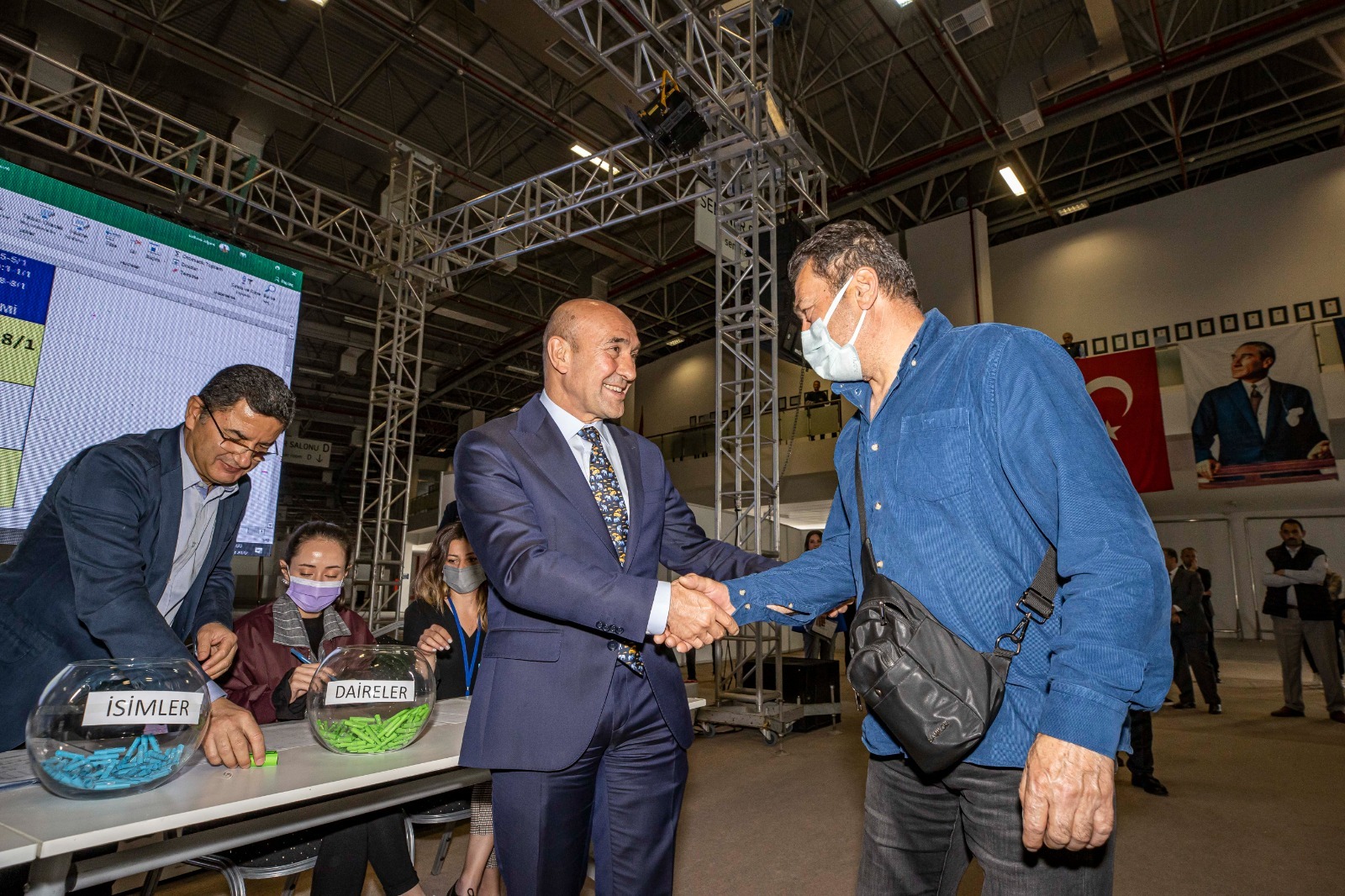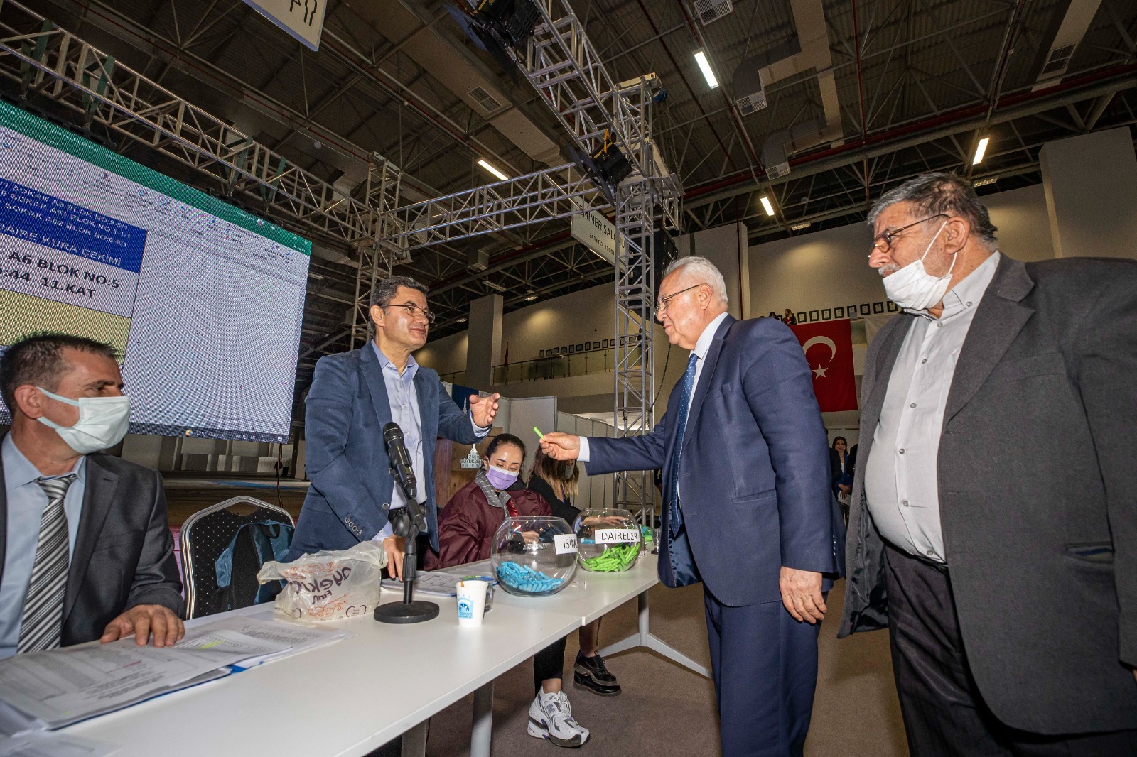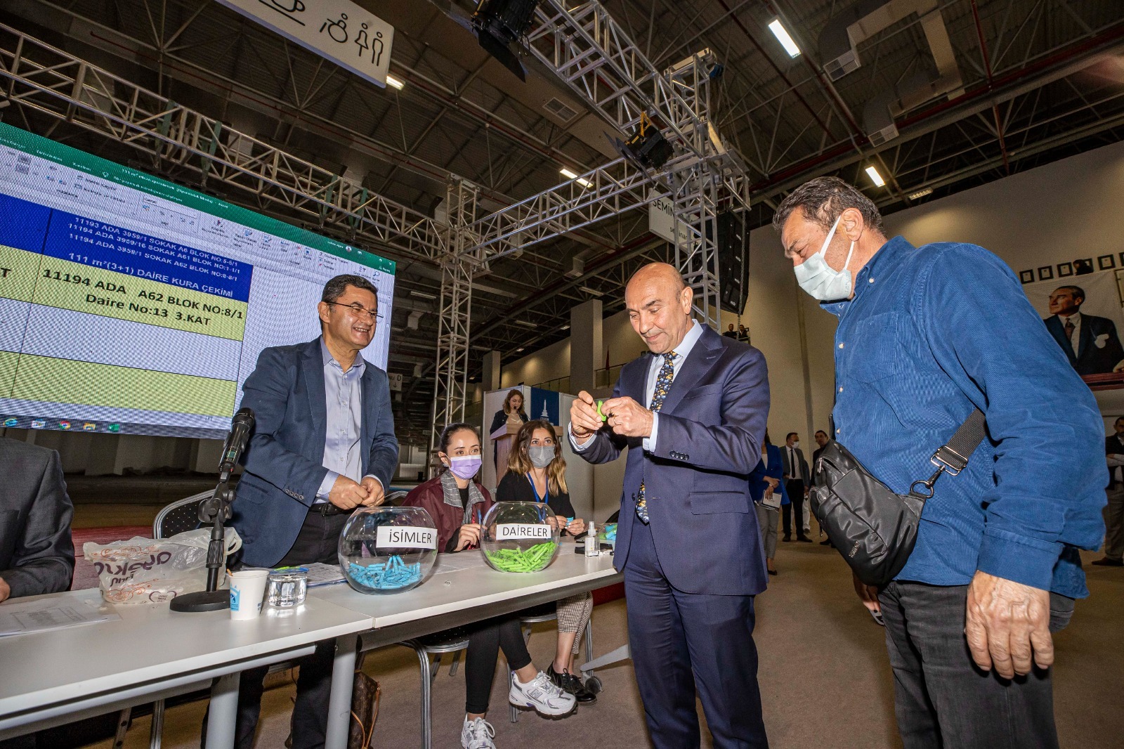 Başkan Soyer konuşmasının ardından hak sahiplerinden Abidin Nişancı, Karabağlar Belediye Başkanı Muhittin Selvitopu ise Mehmet Ali Öleki için kura çekti.