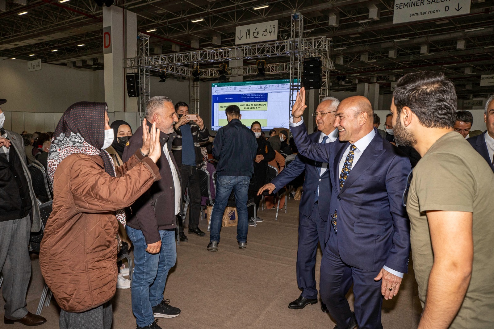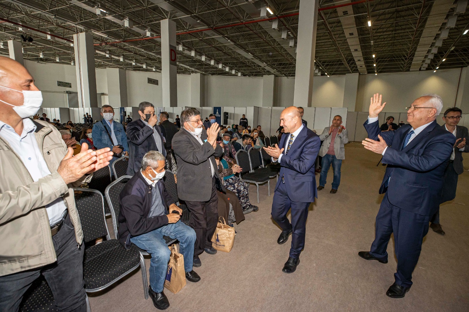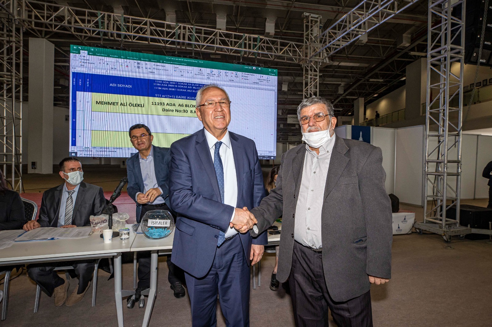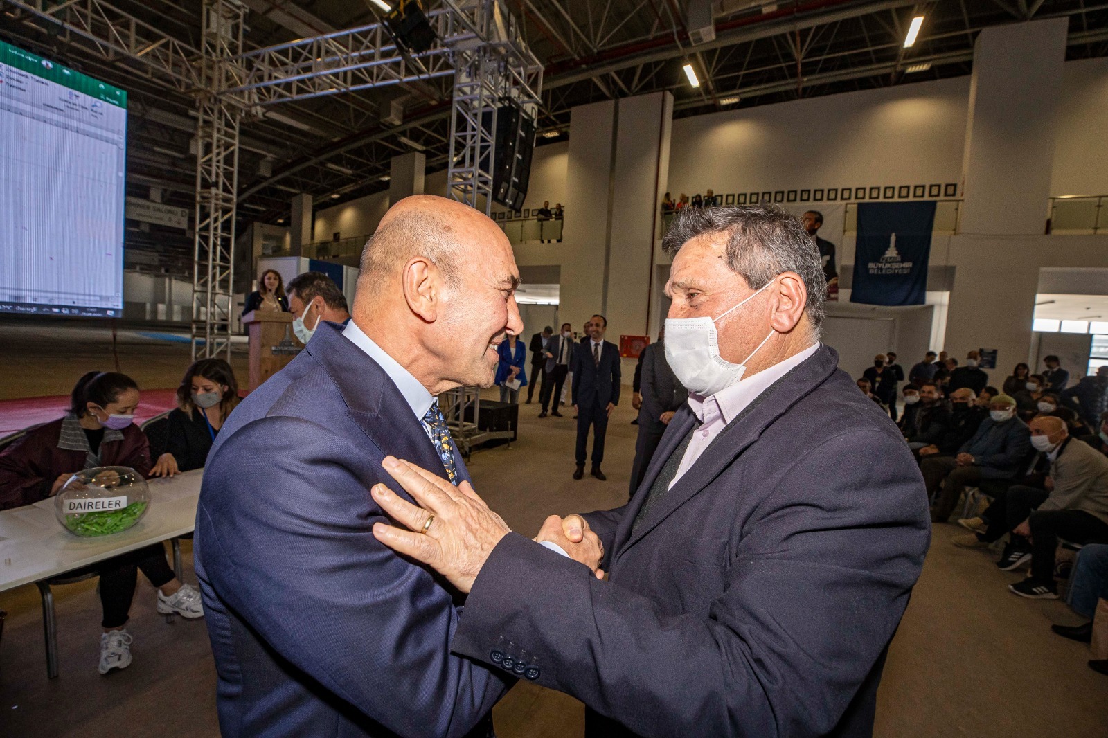 Başkan Soyer konuşmasının ardından hak sahiplerinden Abidin Nişancı, Karabağlar Belediye Başkanı Muhittin Selvitopu ise Mehmet Ali Öleki için kura çekti.