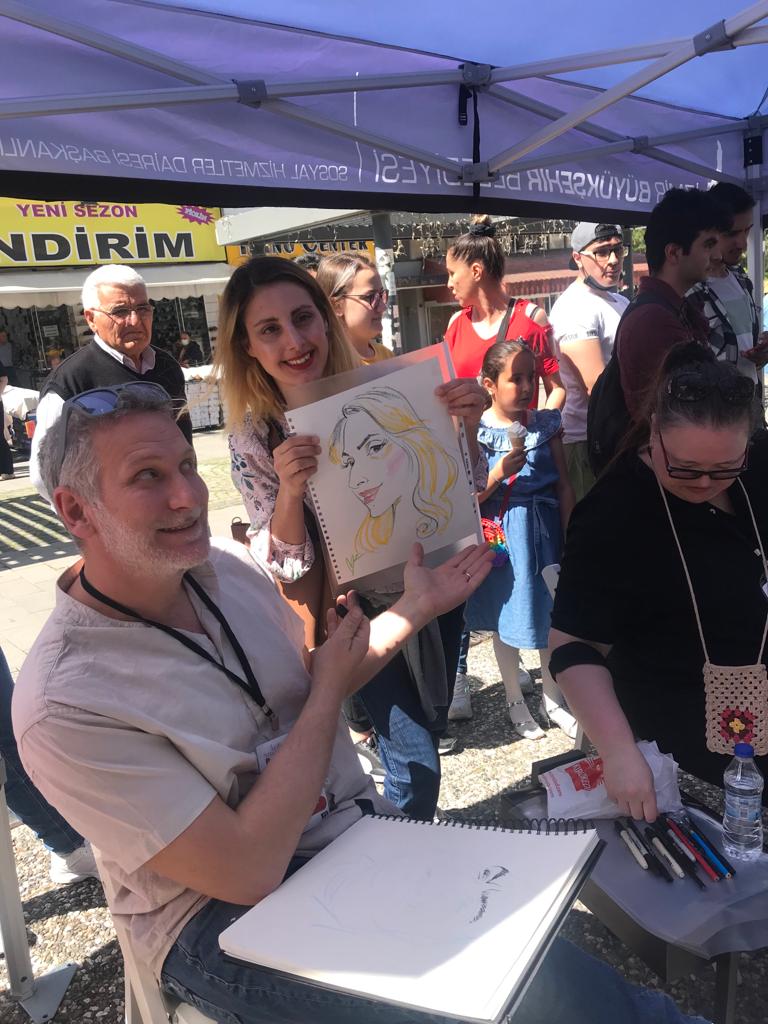 Sanatçı Menekşe Çam’ın küratörlüğünü üstlendiği festivalde 7 ülkeden 12 sanatçının eserlerinden oluşan Portre Karikatür Sergisi, Alsancak Vasıf Çınar Meydanı’nda sanatseverler ile buluştu. Şehrin üç ayrı noktasında kurulan etkinlik alanlarında ücretsiz binlerce porte karikatür çizilirken Konak Metro istasyonunda sanatçıların birbirinden eğlenceli çizimlerinden oluşan anı duvarı oluşturuldu.
