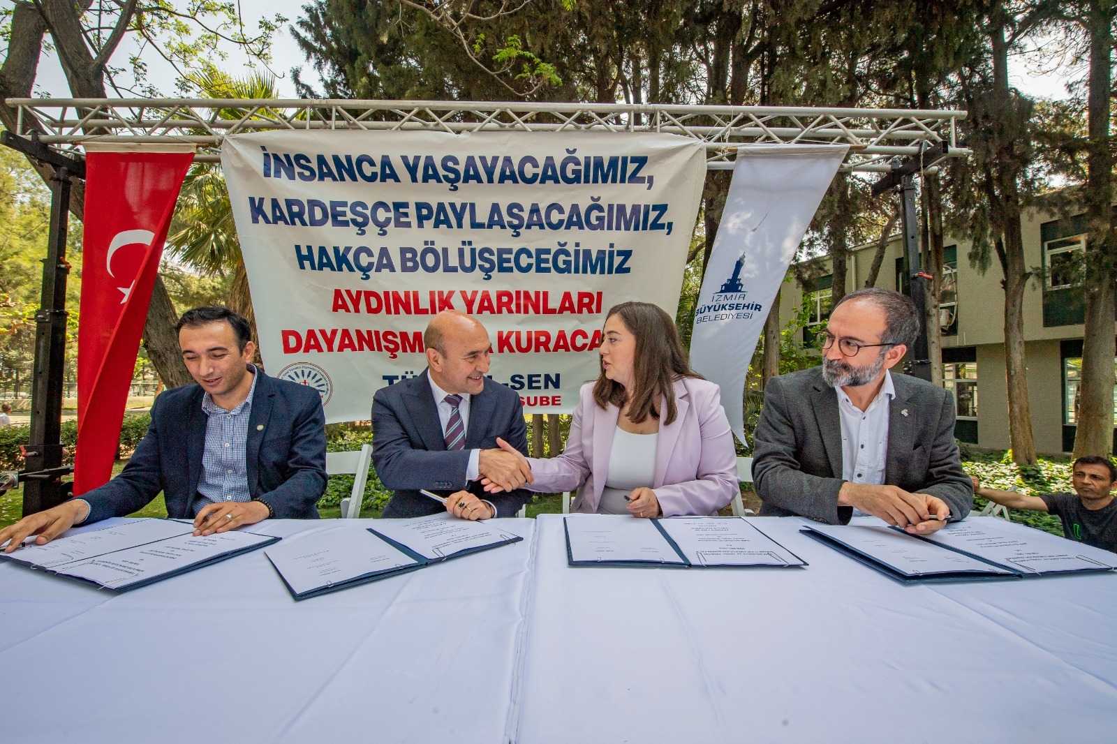 İzmir Büyükşehir Belediye Başkanı Tunç Soyer’in eşit işe eşit ücret ilkesi kapsamında İzmir Büyükşehir Belediyesi ile Tüm Belediye ve Yerel Yönetim Hizmetleri Emekçileri Sendikası (Tüm Bel-Sen) arasında İzmir Büyükşehir Belediyesi, ESHOT ve İZSU’daki 5 bin 850 personeli ilgilendiren toplu iş sözleşmesi imzalandı. İzmir Sanat Merkezi’nin bahçesindeki törende Başkan Tunç Soyer, Tüm Bel-Sen Genel Örgütlenme Sekreteri Bülent Türkmen, Tüm Bel-Sen İzmir 1 No’lu Şube Başkanı Buse Engin, Şube Toplu İş Sözleşmesi ve Hukuk Sekreteri Turgut Angün sözleşmeye imza atan isimler oldu.