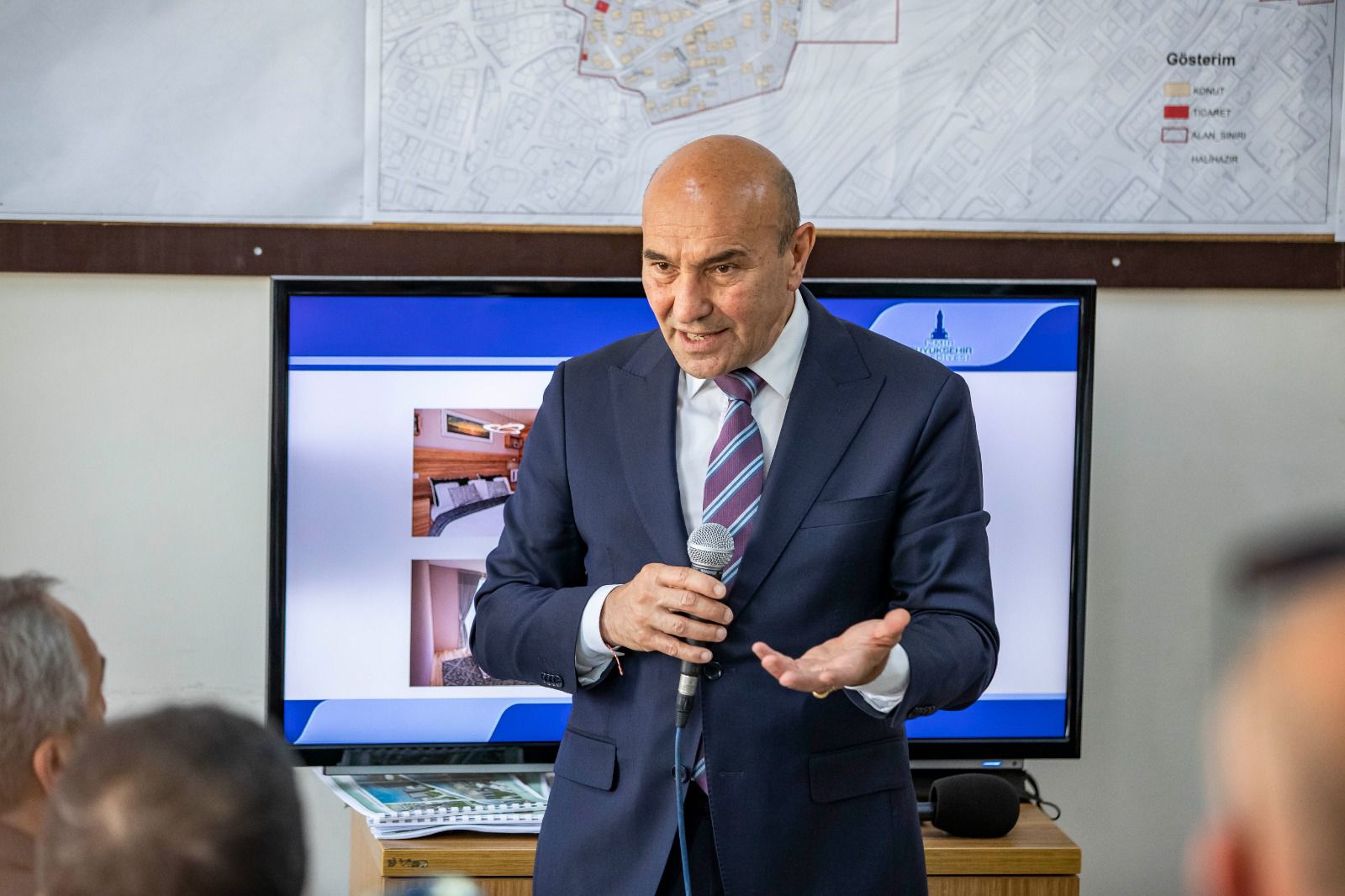 Başkan Soyer toplantıda “Burada gördüğünüz çalışmada özet itibariyle sizlerin önerileriyle, sizlerin talepleriyle ve sizin içinize sinsin diye bu değişiklikler yapıldı. Bir kere öncelikle binaların konumlandırılması değiştirildi. Eğime göre, vadinin konumuna göre ve manzaraya göre değişti. İkincisi, vaziyet planında bloklarda 7 daire vardı, bu sizlerden gelen talepler doğrultusunda 4’e indirildi ve metrekareler biraz daha büyütüldü. Ev içindeki mutfaklar da açık mutfak olmaktan çıktı. Kısacası yapılan tüm çalışmalar sizin istekleriniz doğrultusunda yeniden yapıldı” diye konuştu.