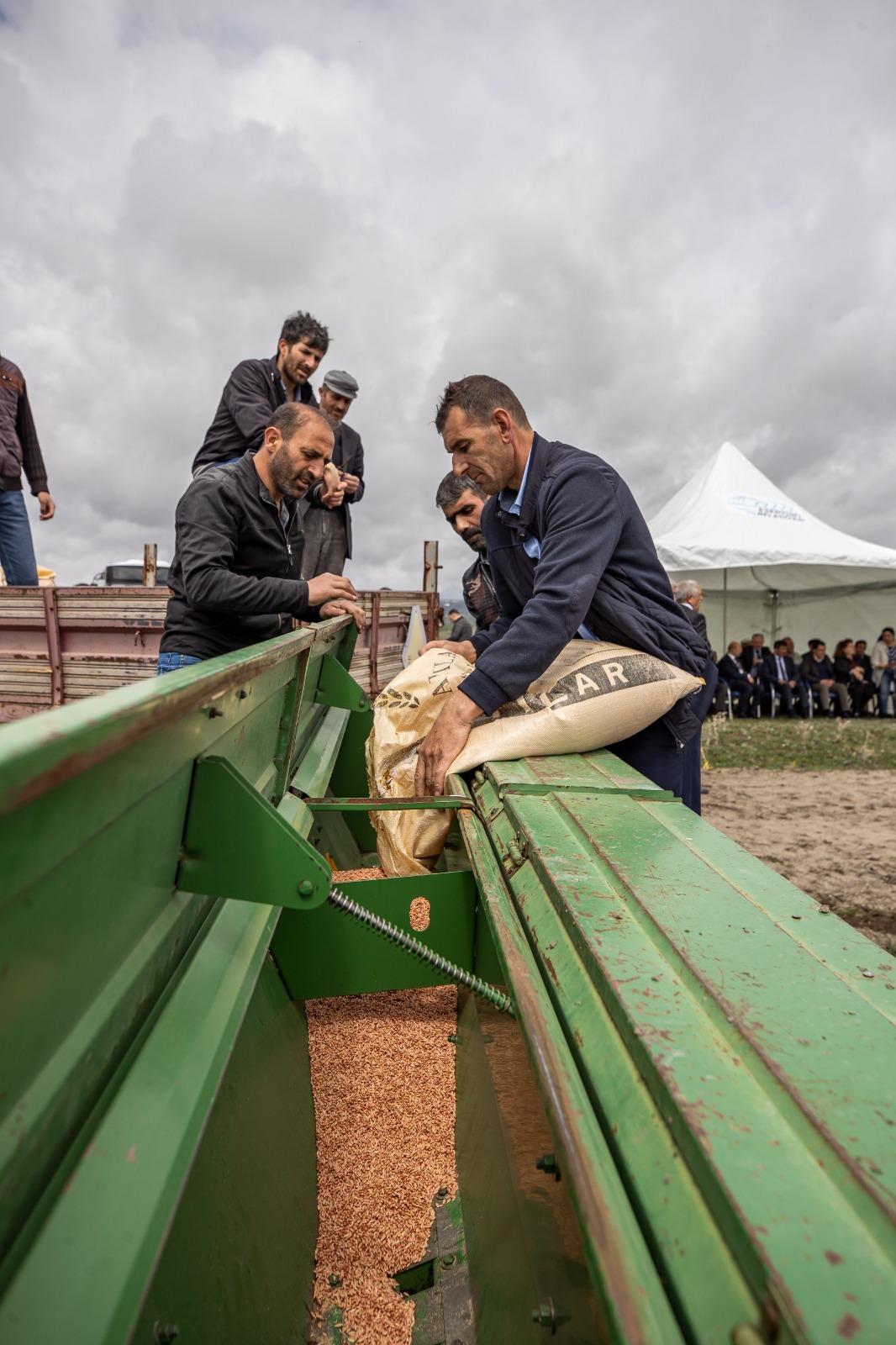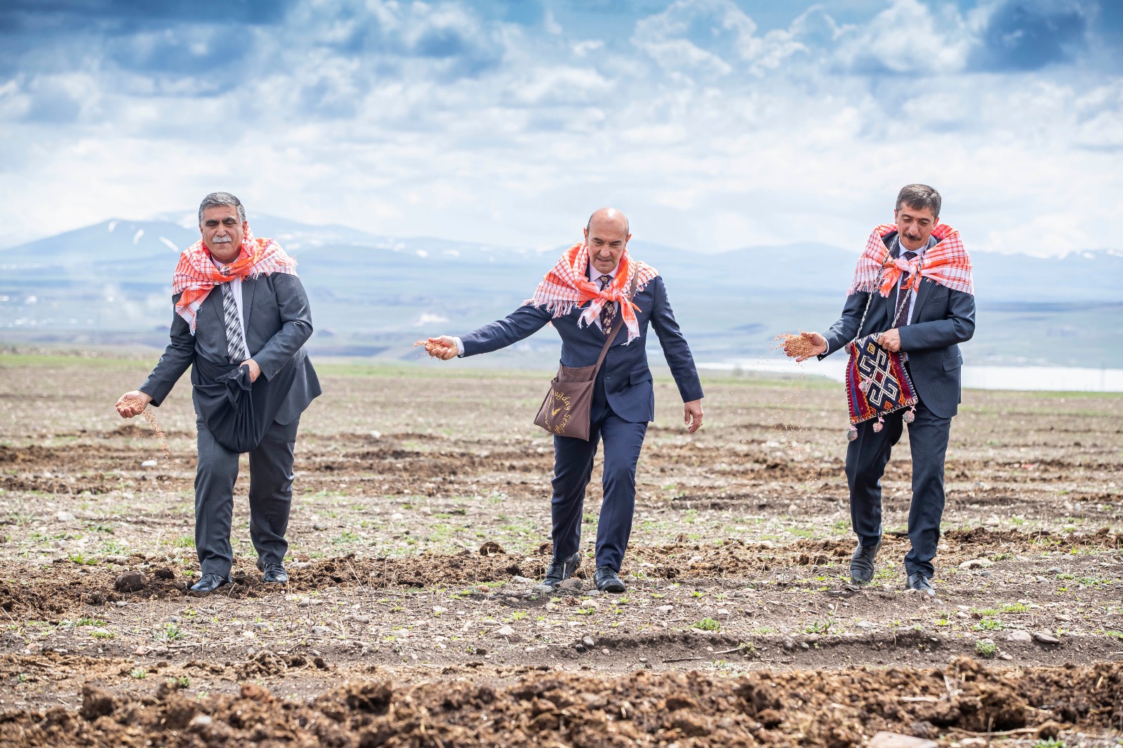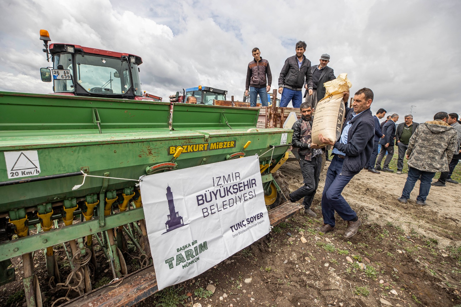 Dağıtımın ardından ekim yapılacak tarlaya gidildi. Burada konuşan İzmir Büyükşehir Belediye Başkanı Tunç Soyer, “Yaptığımız şey bugün biraz daha bayrama ve kutlamaya dönüştü. Gerçekten Anadolu öyle bir coğrafya ki biz İzmir’de hasada hazırlanıyoruz burada ekime geldik. Bir tarafta hasat bir tarafta ekim yapılabilen olağanüstü bir coğrafyada yaşıyoruz. Ve bu yoksulluk bu kuraklık hiçbirimizin hak etmediği bir tablo. Emin olun ki bu bir kader değil. Çünkü bu bereketli toprakların bereketini birileri hortumlasın diye onlara aktardılar. Buradaki küçük üreticiyi yoksullaştırdılar. Bu bir politik, siyasi bir tercihti. Bu tercihin sonuçlarını yaşıyoruz bugün Anadolu’da. Karşılaştığımız yoksulluk, kuraklık tamamen yanlış tarım politikalarının sonucudur, bir kader değildir. Onun için 'başka bir tarım mümkün' diyoruz. Bu bereketli toprakların bereketiyle karnını doyuran, yüzlerce yıldır atasından devraldığı topraklarda huzurlu yaşamını devam ettiren, sağlıklı, güle oynaya hayatını devam ettiren köylümüz, üreticimiz artık üretimden vazgeçme noktasına, hayvanını kesme noktasına gelmiştir. Biz buğday ve arpa tohumu getirirken aslında buraya umudu yeşertmeye geldik buraya. Çünkü biliyoruz ki bu mümkün. El ele verirsek başarırız. Bu yanlış tarım politikalarını değiştirip küçük üreticiden, köylüden yana uygulama yaparsanız işte bu mümkün. Ne demiş Mustafa Kemal Atatürk? Köylü milletin efendisidir. Neden demiş? Çünkü bilmiş ki eğer kendi kendine yeten bir ekonomi yaratabilirse bir memleket dışarıya muhtaç olmaz ve o zaman kalkınmanın, büyümenin önü açılır. Ne yaptık köylümüzü? Tunuslu, Faslı, Kanadalı üreticinin önünde ezdirdik. Mercimeği Kanada’dan sıfır vergiyle ithal ediyoruz. Sen niye buradaki üreticinin vergisini sıfırlamıyorsun? Bu nasıl bir kafa, nasıl bir tercih? Bunların hepsi değişecek. Bunların hepsini değiştirmeye muktediriz. 'Başka bir tarım mümkün'. Yine bu topraklarda kadim kültürün evlatları olarak güler yüzle, sağlıkla, huzurla yaşayacağımız günleri hep beraber kuracağız” açıklamasını yaptı.