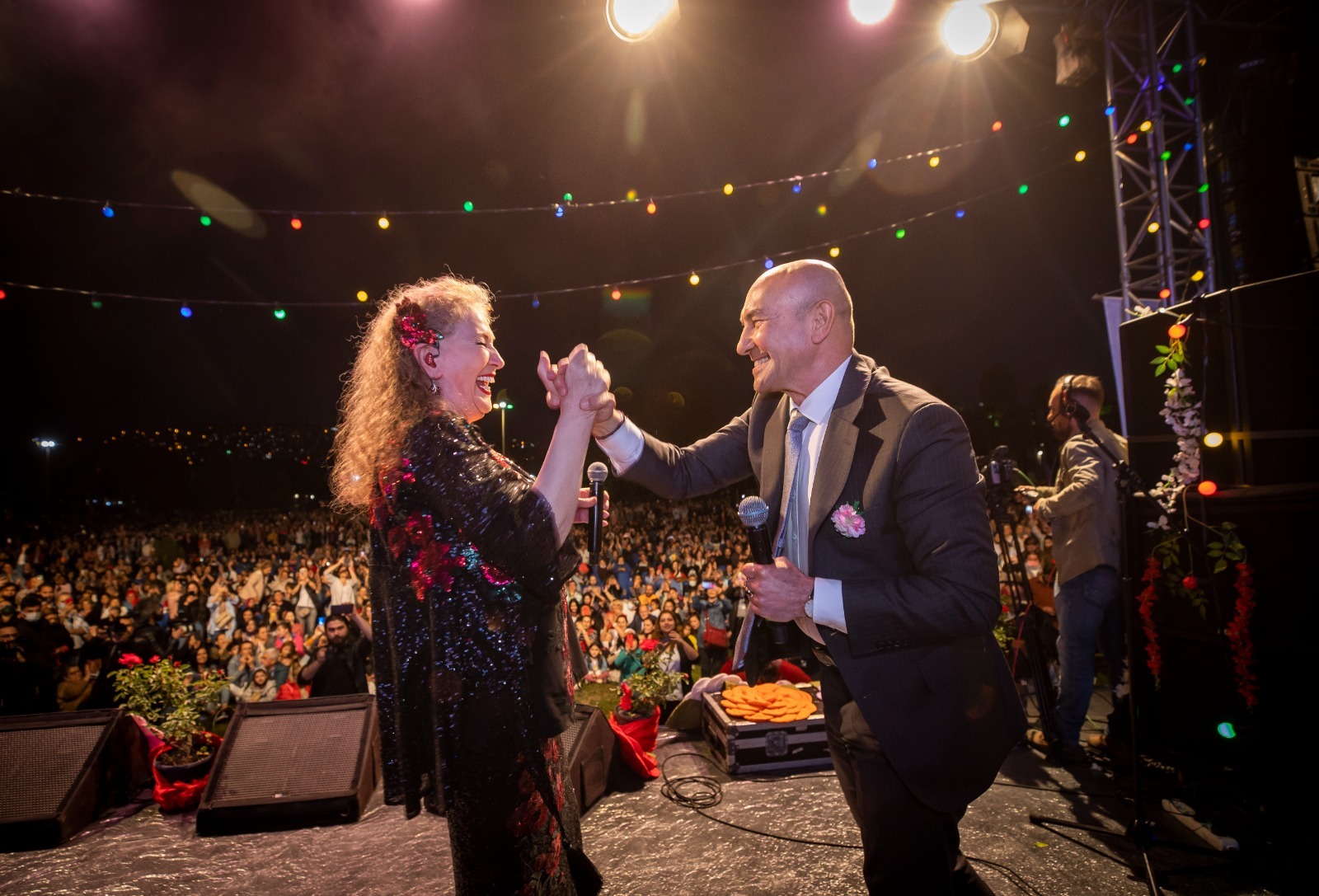 Hıdırellez Şenlikleri’nde eğlence Suzan Kardeş konseri ile devam etti. Binlerce İzmirli, Kültürpark çim alan üzerinde kurulan alanı doldurdu ve şarkılara hep bir ağızdan eşlik etti. Başkan Tunç Soyer ile eşi Neptün Soyer, CHP İzmir Milletvekili Özcan Purçu, İzmir Büyükşehir Belediyesi Genel Sekreter Yardımcısı Ertuğrul Tugay da konseri izledi. İzmir’de İzmirlilerle birlikte olmaktan mutluluk duyduğunu belirten Suzan Kardeş, Başkan Tunç Soyer’i sahnede “en sevdiğim” diyerek karşıladı. Soyer, “Şahanesiniz, güzel İzmirliler bu akşam bütün dilekleriniz gerçek olsun. İyi ki varsınız, iyi ki İzmirliyiz. Suzan Kardeş, bizi çok mutlu ettin, sen kültür taşıyıcısısın. İyi ki geldin ve bizimlesin” dedi. Başkan Soyer ile Suzan Kardeş birlikte İzmir Marşı’nı söyledi, alanda bulunan binlerce yurttaş da marşa eşlik etti.
