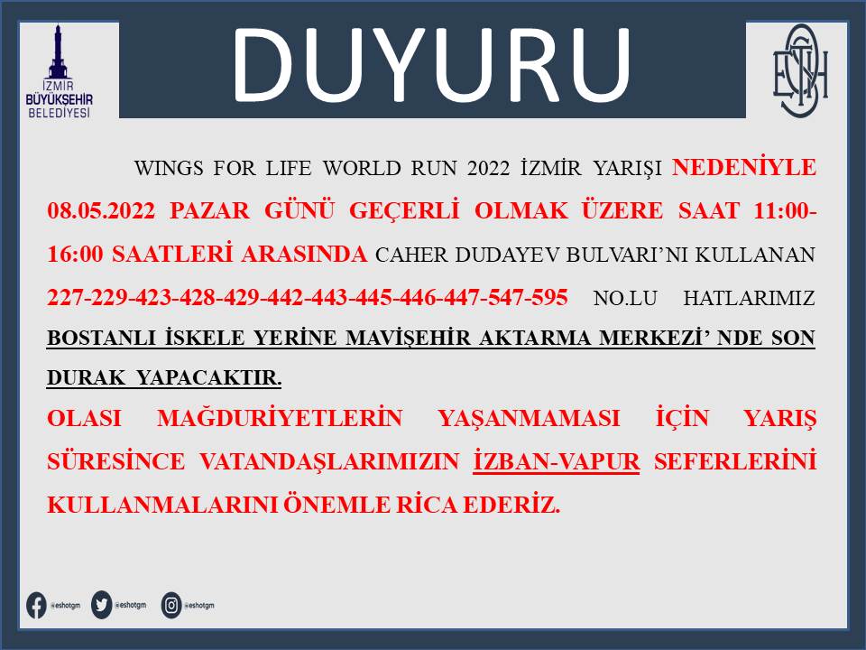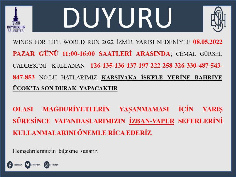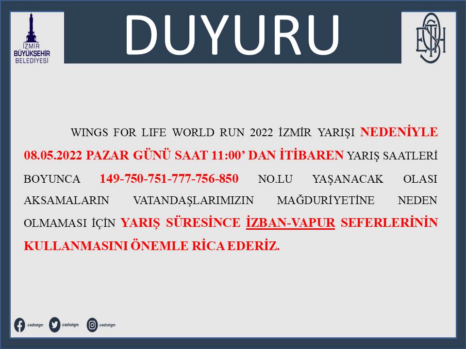 İzmir Büyükşehir Belediyesi omurilik felcine çare bulacak araştırmaları desteklemek için düzenlenen uluslararası spor etkinliği “Wings For Life World Run” nedeniyle ulaşımda önlem aldı. 8 Mayıs Pazar günü saat 11.00-16.00 itibaren parkur içindeki caddeler yarış süresi boyunca kademeli olarak trafiğe kapatılacak. Kültürpark’tan başlayarak Karşıyaka ve Menemen istikametine doğru devam edecek güzergahtaki otobüs hatları için düzenleme yapıldı.
