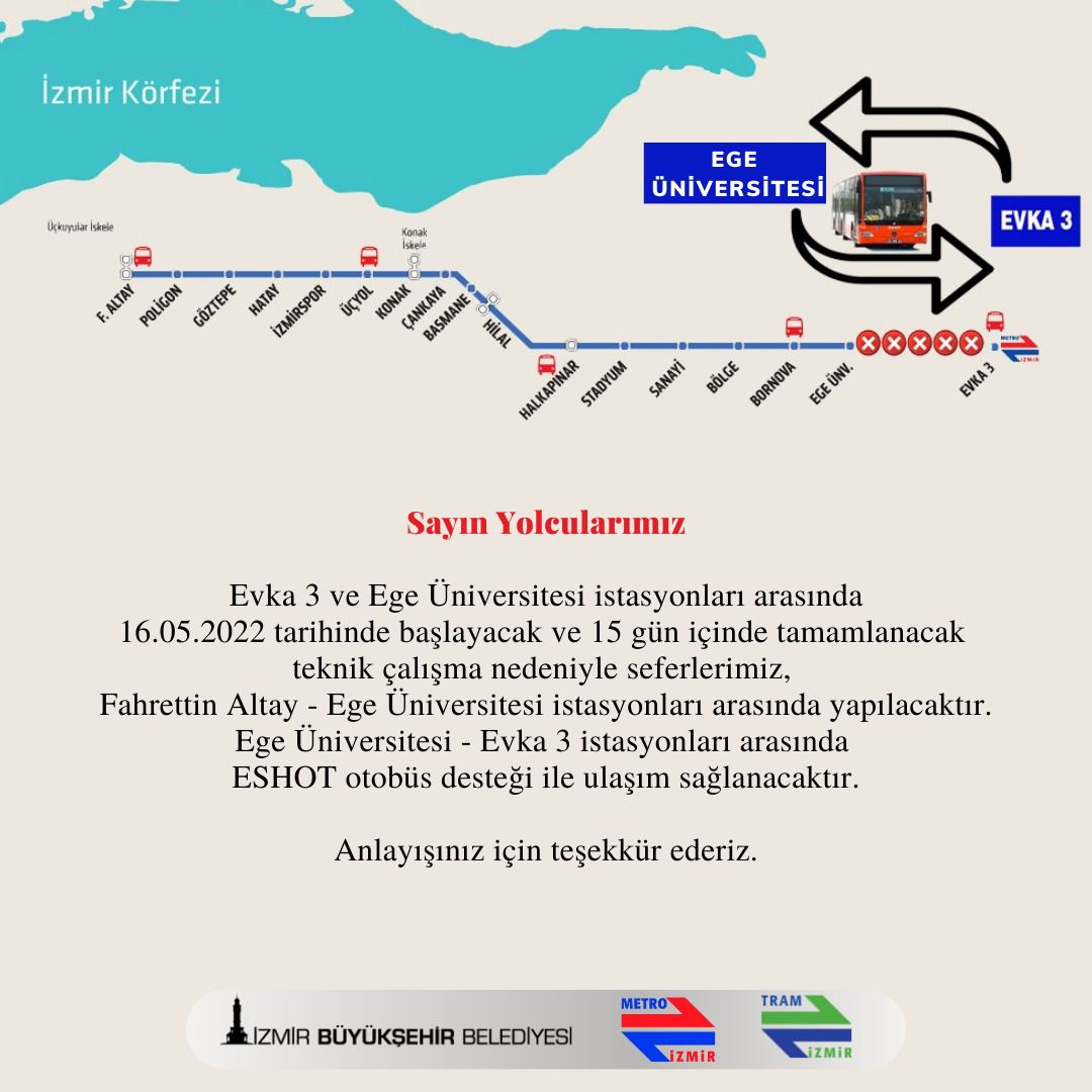 İzmir Büyükşehir Belediyesi’ne bağlı İzmir Metro A.Ş. planlı teknik bir çalışma nedeniyle Ege Üniversitesi – Evka 3 istasyonları arasında geçici süreyle sefer yapılamayacağını duyurdu. Çalışmanın, 16 Mayıs Pazartesi günü başlayacağı ve en geç 15 gün içinde bitirileceği belirtildi.