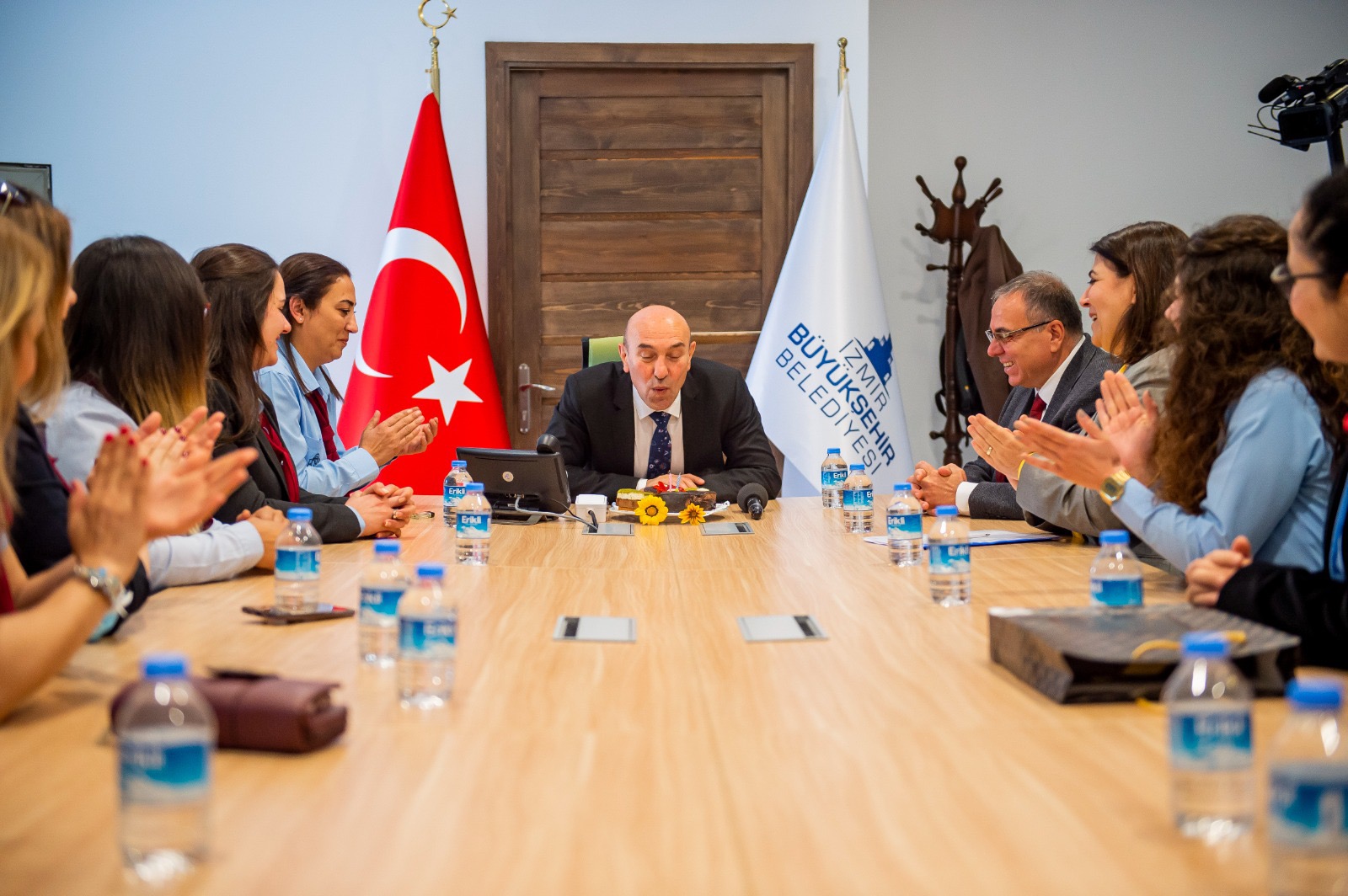 İzmir Büyükşehir Belediye Başkanı Tunç Soyer, İzmir Sanat Merkezi’nde bulunan çalışma ofisinde ESHOT’ta görevli 13 kadın şoförü ağırladı. Ziyarete ESHOT Genel Müdürü Erhan Bey ile Genel Müdür Yardımcısı Kader Sertpoyraz da katıldı. Nezaket ziyaretinde bulunan kadın şoförler Başkan Tunç Soyer’e doğum günü sürprizi yaparak pasta getirdi. En güzel doğum günü hediyesinin çalışanlarının mutluluğu olduğunu ifade eden Başkan Soyer, “Bizim iftihar sebebimizsiniz. Sizin bu vefakarlığınız beni çok mutlu ediyor. Birlikte uzun yıllar geçirmek dileğiyle. Siz sadece İzmir’e değil tüm Türkiye’ye örnek oldunuz. Bugün sizlerin sayesinde geldiğimiz nokta içimizi ferahlatıyor. Ama asla yeterli değil. Sizin sayesinde birçok kadının da yolunu açacağız. Bunun gerçek bir yolculuğa dönüşmesi için kadın şoför sayısını giderek artıracağız. İzmir’de her başarılı erkeğin arkasında bir kadın var, bunu hep söylüyorum” dedi.