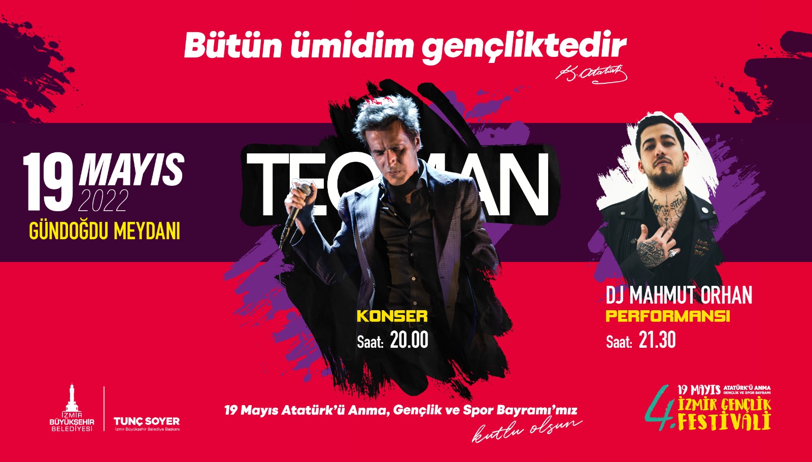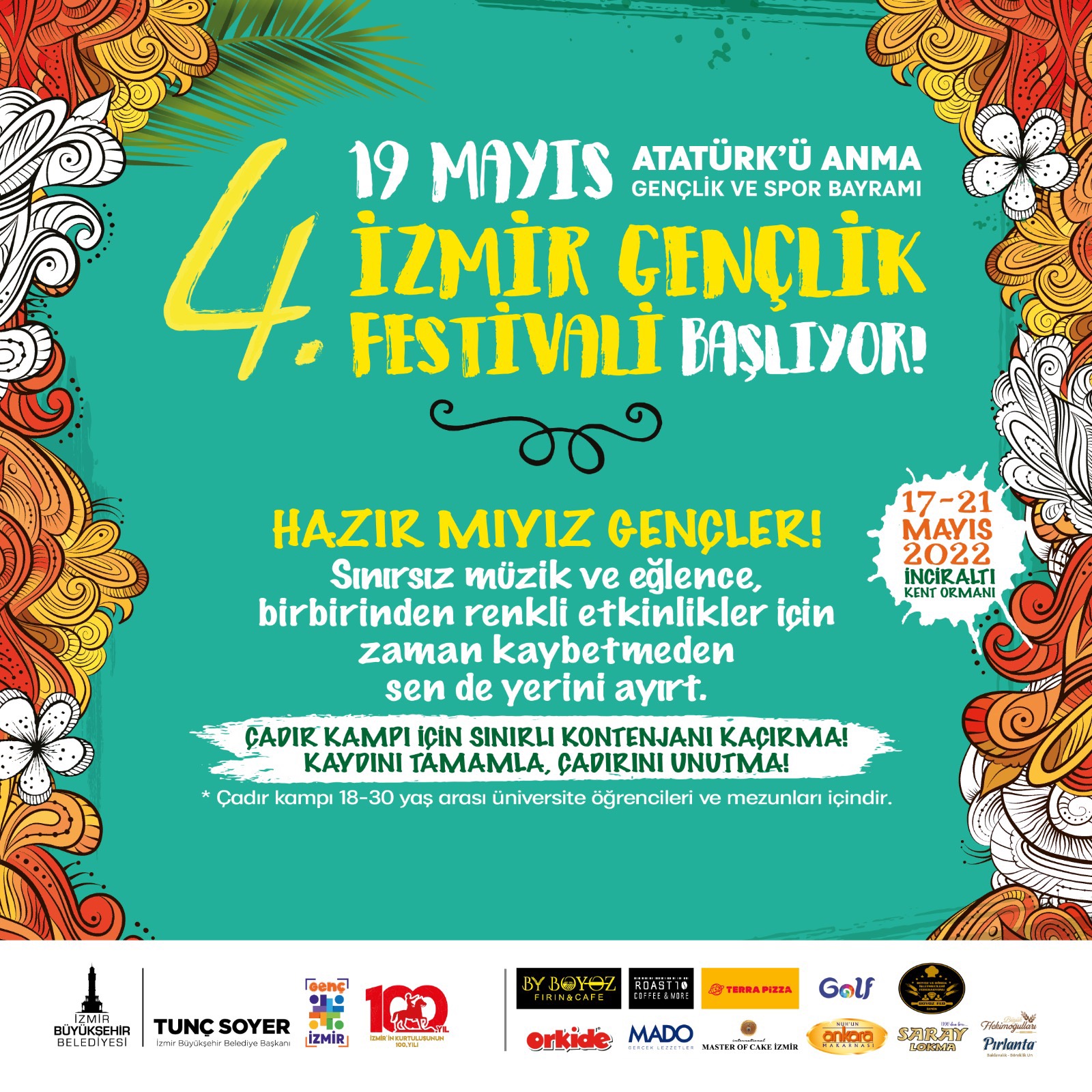 Büyükşehir Belediyesi, Milli Mücadele’nin 103’üncü yılının kutlanacağı 19 Mayıs Atatürk’ü Anma, Gençlik ve Spor Bayramı’nda Gençlik Festival’i düzenliyor. 17-21 Mayıs tarihleri arasında İnciraltı Kent Ormanı’ndaki festivalin ilk gününde saat 17.00’de İzmir Büyükşehir Belediye Başkanı Tunç Soyer, gençlik projelerini anlatacağı ve yeni projelerinin müjdesini vereceği bir tanıtım toplantısına ev sahipliği yapacak. Toplantının ardından 18.00’de ise Başkan Tunç Soyer, ünlü televizyoncu Okan Bayülgen’le gençlik buluşmasına katılacak. Kampın ilk gününde program 21.00’de Madrigal konseriyle devam edecek. Beş gün sürecek festival kapsamında 19 Mayıs 20.00’de ise Gündoğdu Meydanı’nda Teoman sahne alacak.