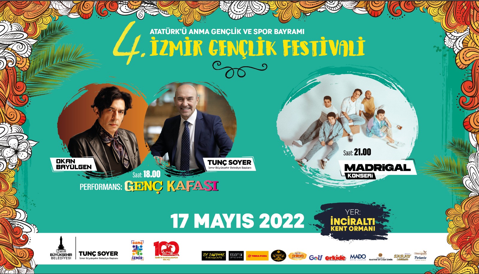 İzmir Büyükşehir Belediyesi, 19 Mayıs’ı Gençlik Festivali’yle kutlamaya hazırlanıyor. 17-21 Mayıs tarihleri arasında İnciraltı Kent Ormanı’nda düzenlenecek festivalin ilk gününde İzmir Büyükşehir Belediye Başkanı Tunç Soyer, gençlere yönelik yeni projelerinin müjdesini vereceği bir tanıtım toplantısına ev sahipliği yapacak. Toplantının ardından Başkan Soyer Okan Bayülgen’le gençlik buluşmasına katılacak. Kampın ilk günü Madrigal konseriyle son bulurken gençler 19 Mayıs’ta Teoman ile coşacak.