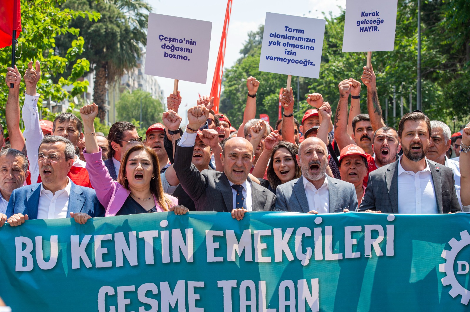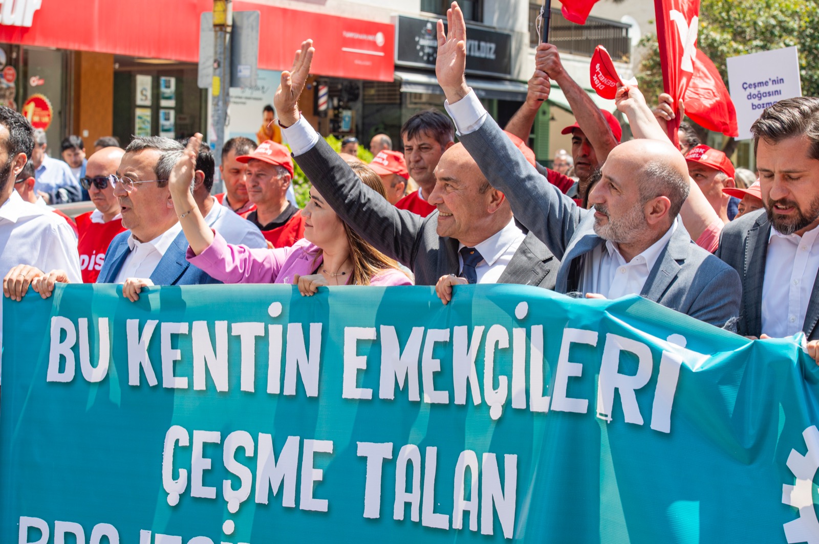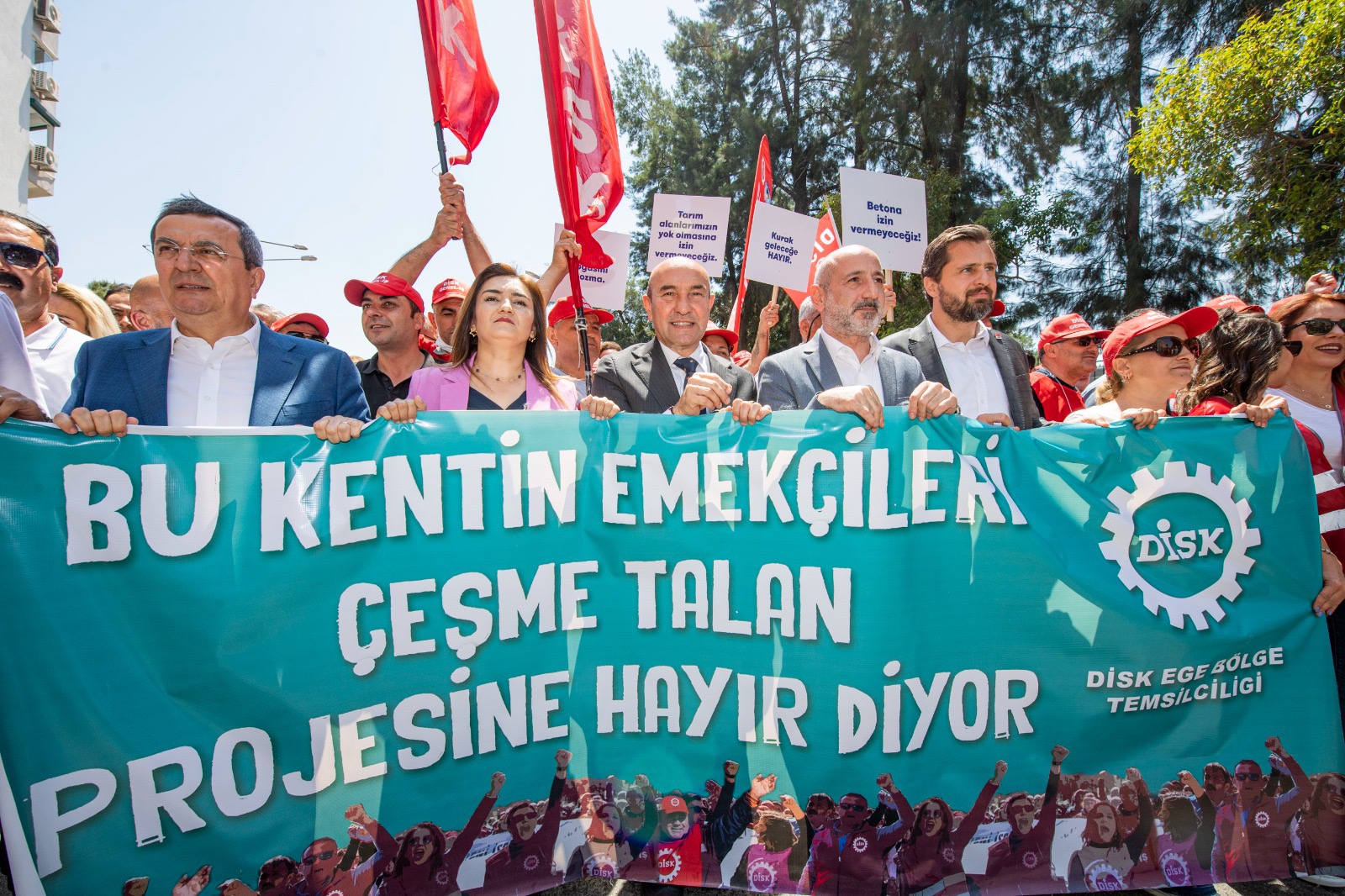 Cumhuriyet Halk Partisi (CHP) Genel Başkan Yardımcısı Ali Öztunç, İzmir Büyükşehir Belediye Başkanı Tunç Soyer, CHP İzmir Milletvekili Sevda Erdan Kılıç, Konak Belediye Başkanı Abdül Batur ve CHP İzmir İl Başkanı Deniz Yücel, meslek odaları, sendikalar ve sivil toplum kuruluşlarının temsilcileri ile Kültürpark Lozan Meydanı’nda buluştu. “Bu kentin emekçileri Çeşme talan projesine hayır diyor” pankartının arkasında kortej Cumhuriyet Meydanı’na yürüdü. Yürüyüşte sık sık “İzmir Çeşme’ye sahip çık”, “Kurtuluş yok ya hep beraber ya hiç birimiz” sloganları atıldı.