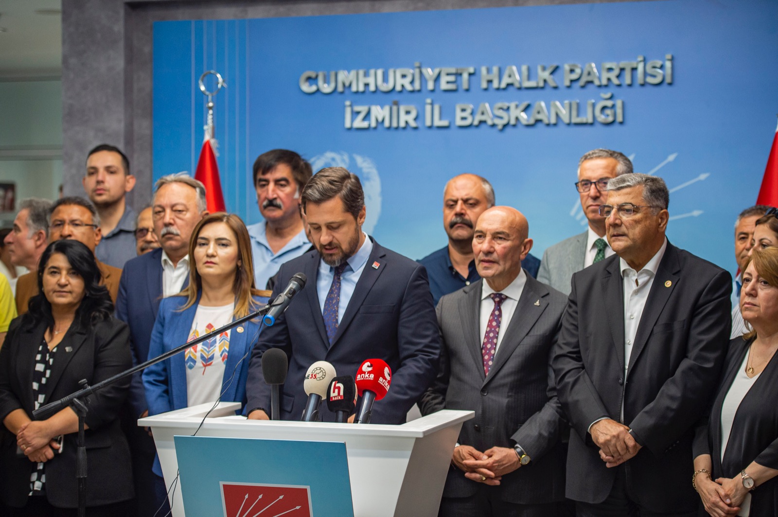 İzmir Büyükşehir Belediye Başkanı Tunç Soyer, Yargıtay tarafından hapis cezası onanan Cumhuriyet Halk Partisi (CHP) İstanbul İl Başkanı Canan Kaftancıoğlu’na destek olmak için 81 ilde eş zamanlı düzenlenen basın açıklamasına katıldı. CHP İzmir İl Başkanlığı’nda yapılan açıklamada CHP İzmir İl Başkanı Deniz Yücel, CHP İzmir milletvekilleri Tacettin Bayır, Kamil Okyay Sındır, Sevda Erdan Kılıç, Özcan Purçu, Menderes Belediye Başkanı Mustafa Kayalar, Konak Belediye Başkanı Abdül Batur, Gaziemir Belediye Başkanı Halil Arda, Çiğli Belediye Başkanı Utku Gümrükçü, il yönetim kurulu üyeleri, CHP ilçe başkanları, örgüt üyeleri de yer aldı.