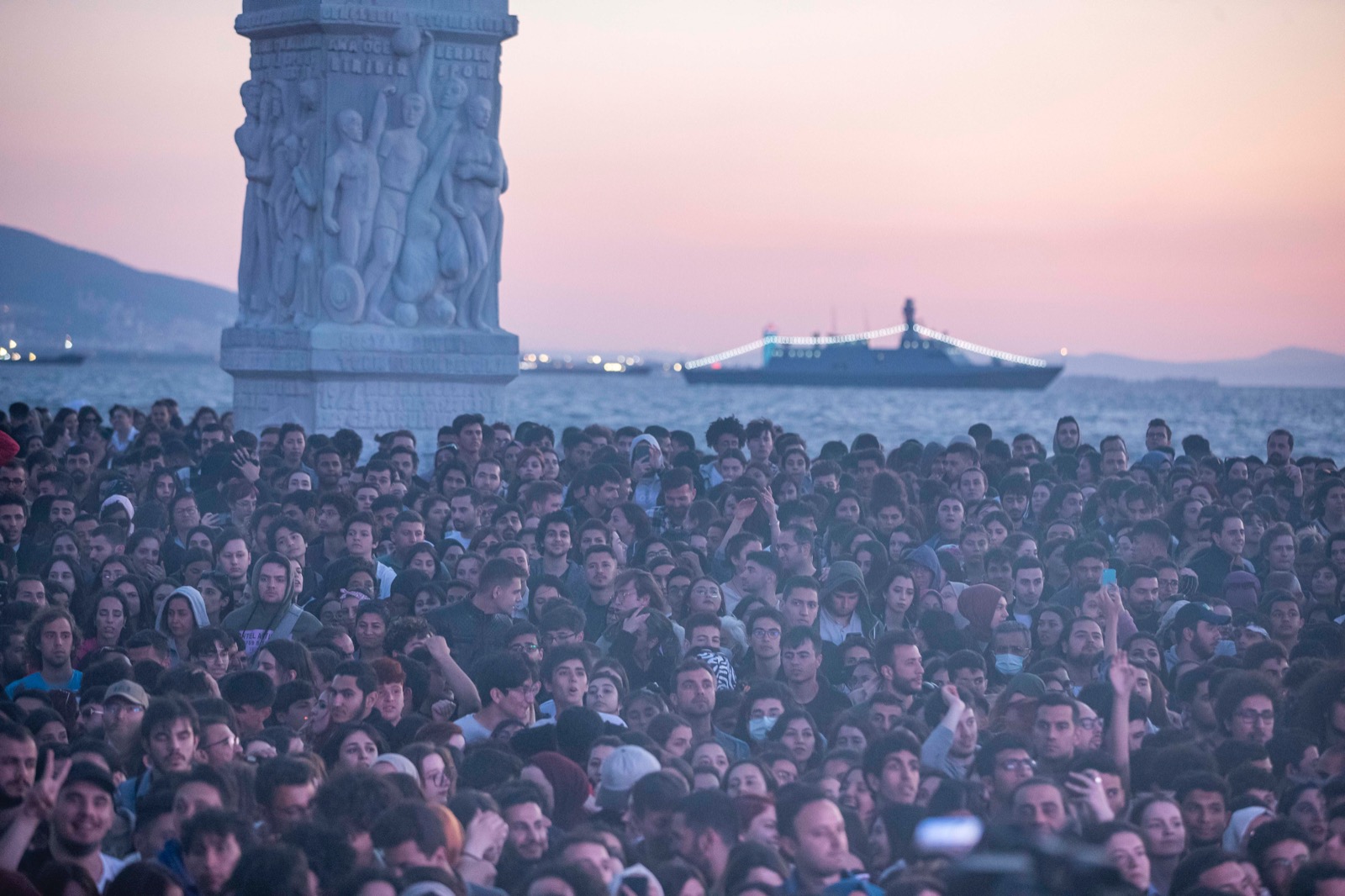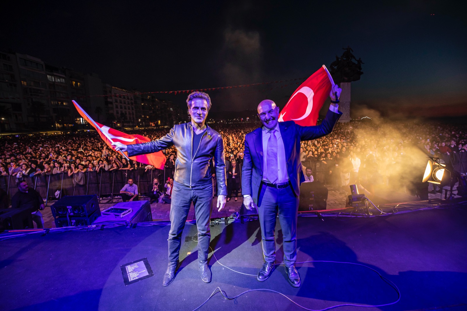 Gençlik Yürüyüşü'nün ardından rock müziğinin sevilen ismi Teoman, Gündoğdu Meydanı’nda gençlerle buluştu. Başkan Soyer sahneye çıkarak Teoman’a İzmirliler adına çiçek takdim etti.
