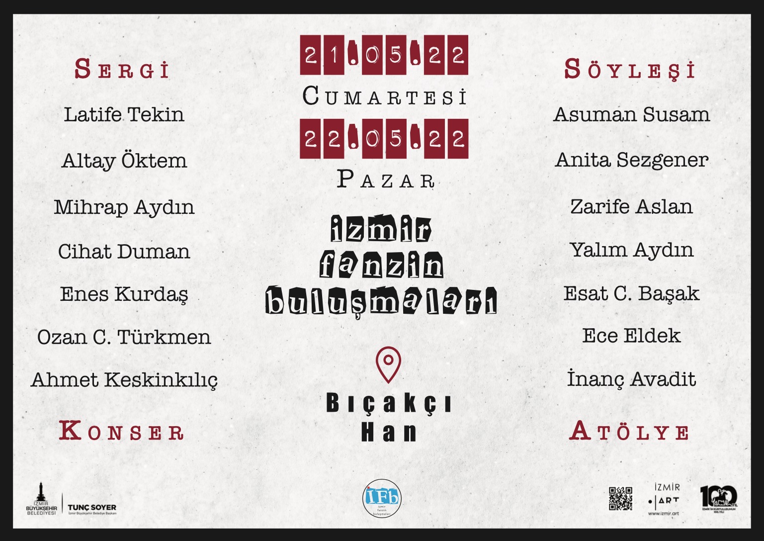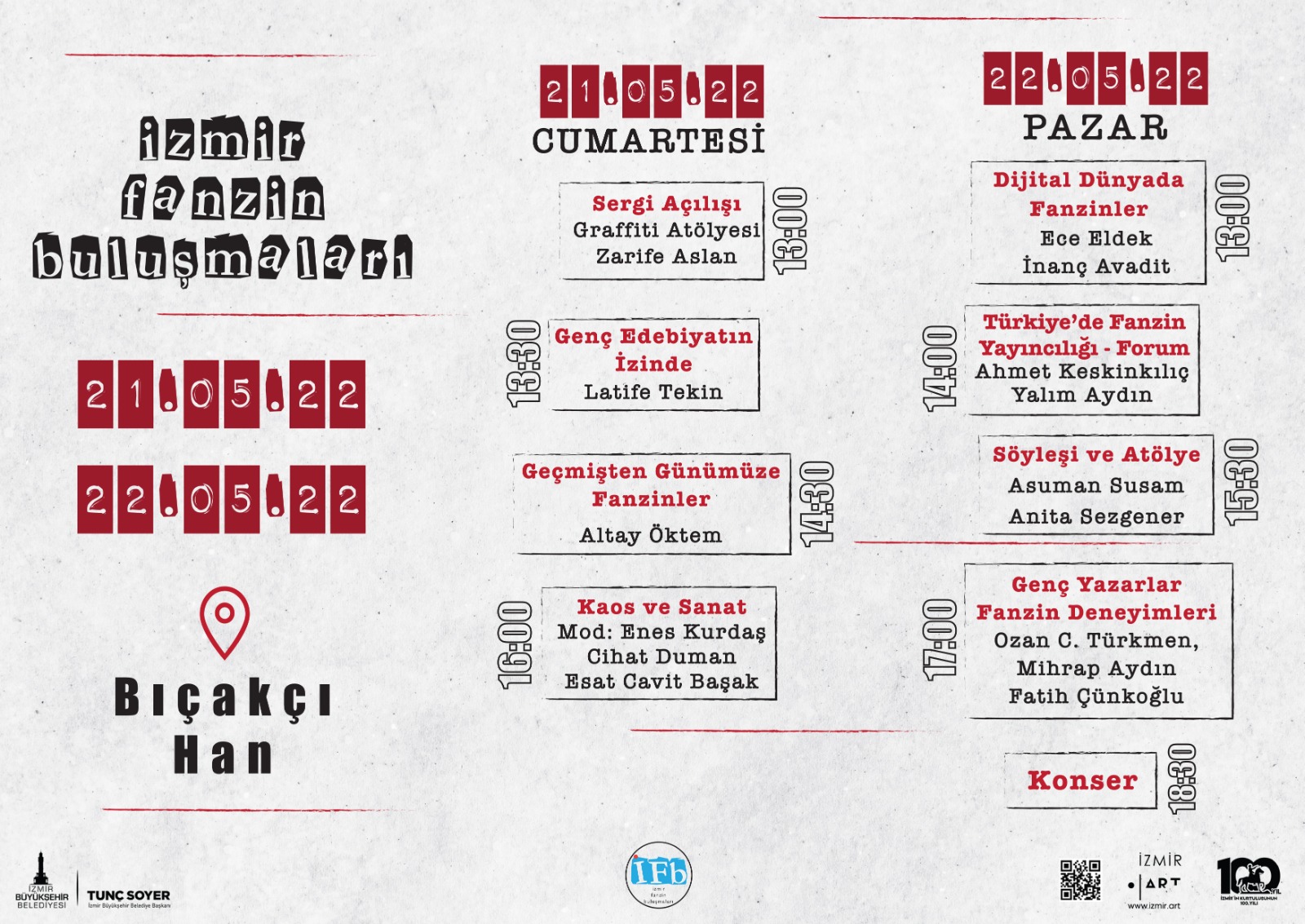 İzmir Büyükşehir Belediyesi tarafından 21-22 Mayıs tarihlerinde Bıçakçı Han’da düzenlenecek İzmir Fanzin Buluşmaları’nda gençler usta yazarlarla bir araya geliyor. Etkinlikle eski teknoloji ve alışkanlıkların değiştiği bir çağda, fanzinler ve fanzin yayıncılığı masaya yatırılacak. Festival boyunca fanzin ne anlama gelir, bağımsız bir fanzin-dergi politik olarak neyi ifade eder, bir fanzin içeriği oluşturmanın ve yayınlamanın yolları nelerdir gibi sorulara cevap aranacak.