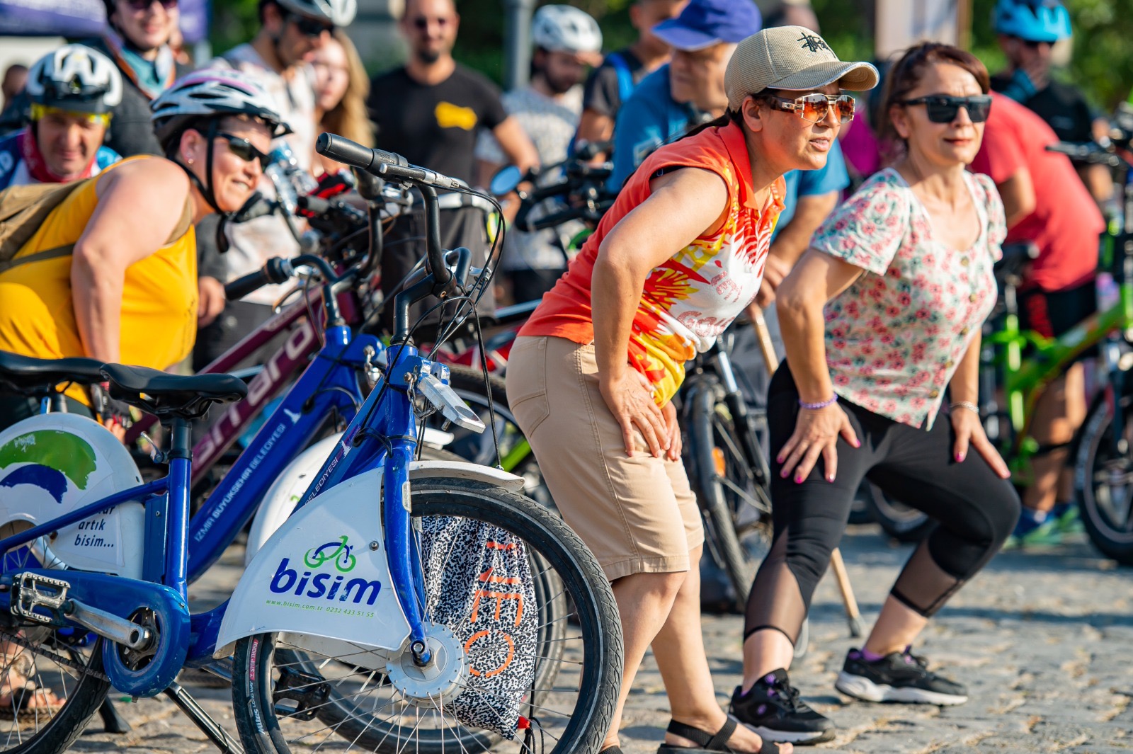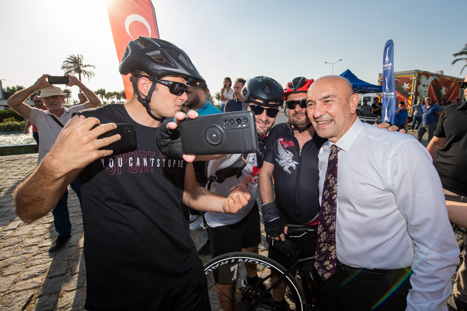 Konuşmasının ardından Başkan Tunç Soyer, İzmir Büyükşehir Belediyesi Ulaşım Dairesi Başkanı Sibel Özgür ve Bisiklet Yaya Erişimi ve Planlama Şube Müdürü Özlem Taşkın Erten ile toplu sürüşün startını verdi.