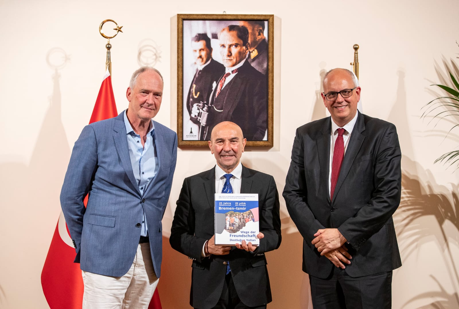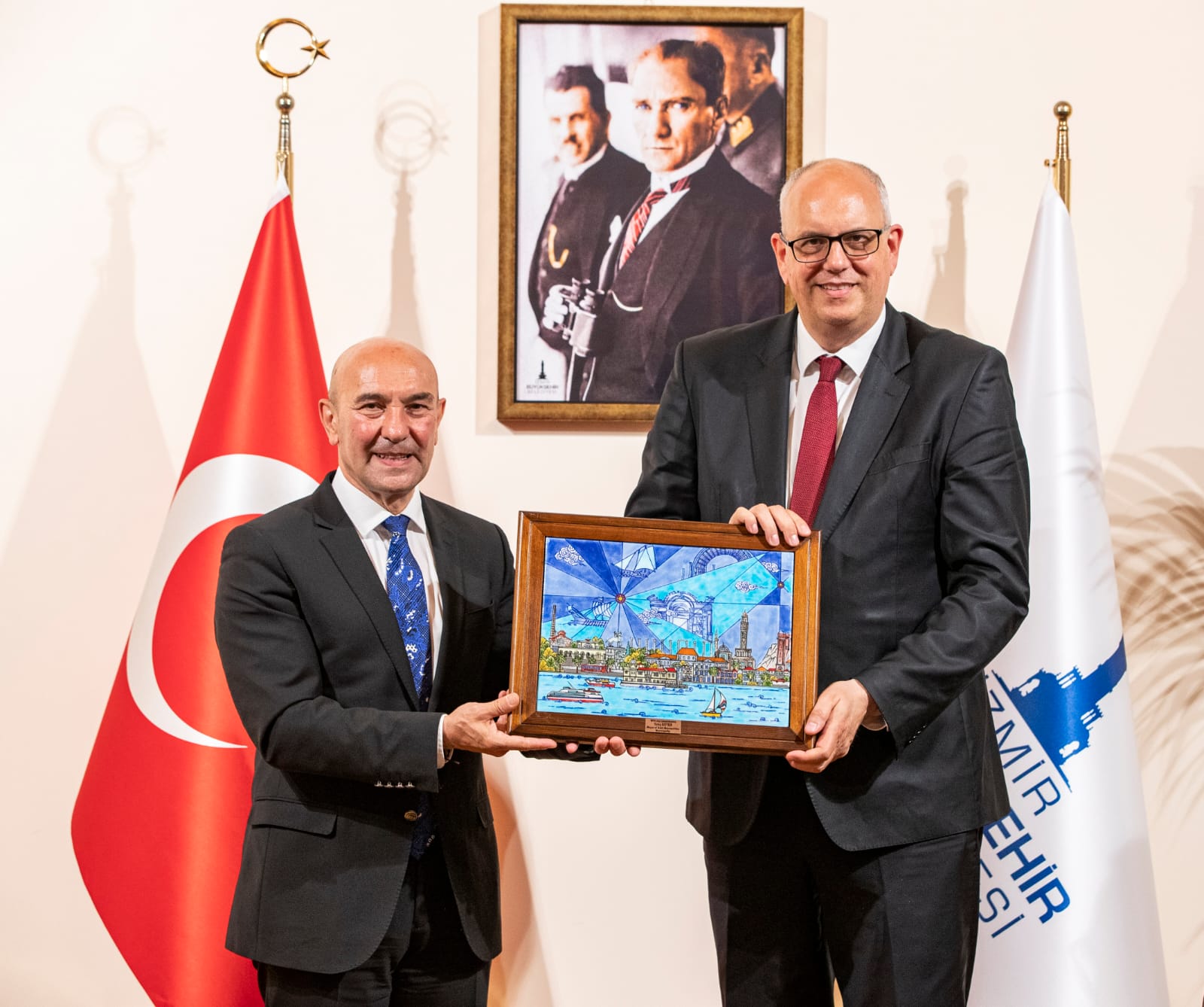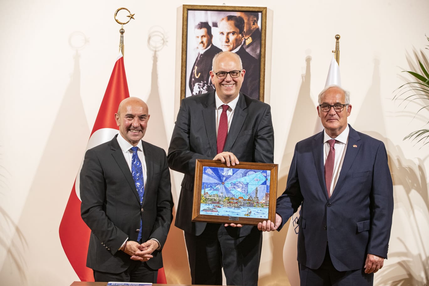 Almanya İzmir Başkonsolosu Dr. Detlev Wolter, Dünya Kenti İzmir Derneği (DİDER) Bremen Ofis Başkanı Ali Eliş, Bremen Parlamento Üyesi ve Almanya Sosyal Demokrat Partisi Sözcüsü Mustafa Güngör ve misafirlerden oluşan heyet tarafından Büyükşehir Belediye Başkanı Soyer’e ‘25 yıllık Bremen-İzmir Dostluğun Yolları’ adlı kitap hediye edildi. Başkan Soyer de Almanya heyetine İzmir’in simgelerinden flamingo biblosu ve çini tablo hediye etti.