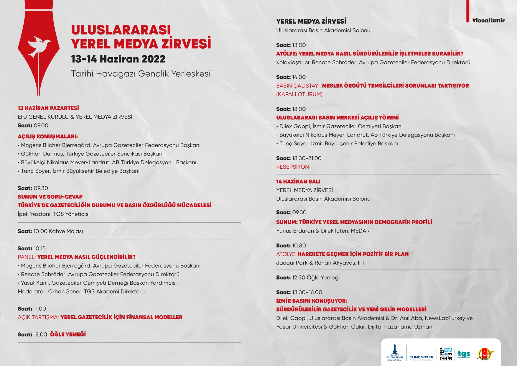 SAAT 09.00: İzmir Büyükşehir Belediyesi’nin ev sahipliğinde düzenlenen Uluslararası Yerel Medya Zirvesi kapsamında Avrupa Gazeteciler Federasyonu’nun genel kuruluna Başkan Tunç Soyer açılış konuşması yapmak üzere katılacaktır.