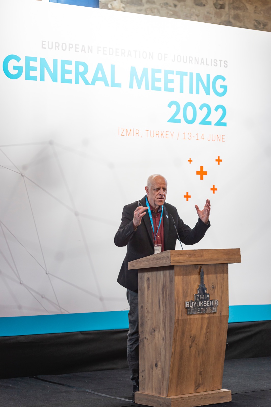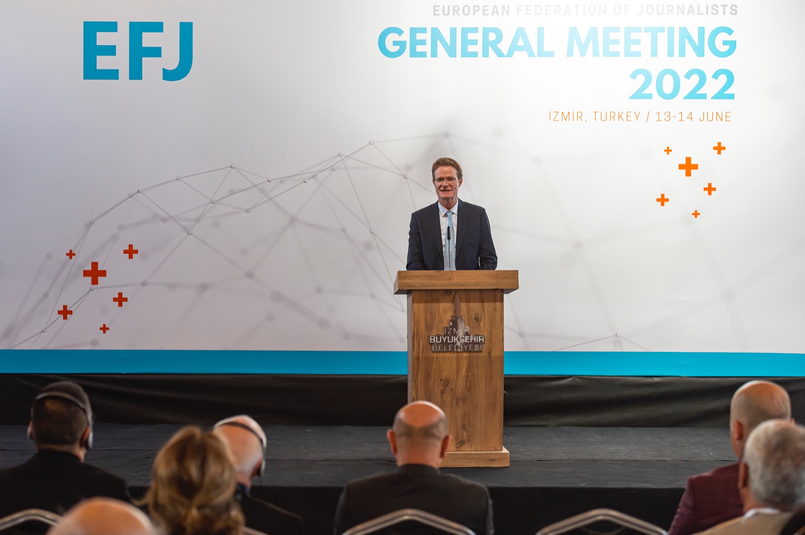 Avrupa Gazeteciler Federasyonu Başkanı Mogens Blicher Bjerrega§rd ise, “Pandeminin ardından sizlerle bir araya gelmek bizim için büyük bir mutluluk. İzmir’de olmaktan çok mutluyuz. Burada hep birlikte İzmir’in güzelliklerini yaşıyoruz. Türkiye’deki gazetecilerin yaşadığı davalarda buradaydım. Tüm gazetecilere sokaklarda kamuoyunda büyük bir destek vardı. Burada gazetecilere verilen değerin ne kadar olduğunu gördük. Türkiye’de bunları görmek gerçekten umut verici. Sizler Türkiye’de gazeteciler olarak yargılandınız. Zamanınızı gazetecilik yerine mahkemelere çıkarak harcadınız. Bu gazetecilere yapılmaması gereken bir şey. Binlerceniz defalarca mahkemelere çağırıldınız. Ülkenizde çok başarılı işler yaptınız. Biliyoruz ki daha yapılacak çok iş var ve biz de bu yüzden buradayız” dedi.