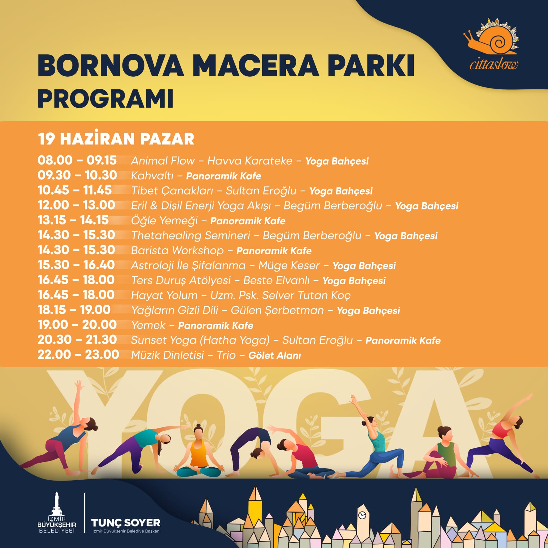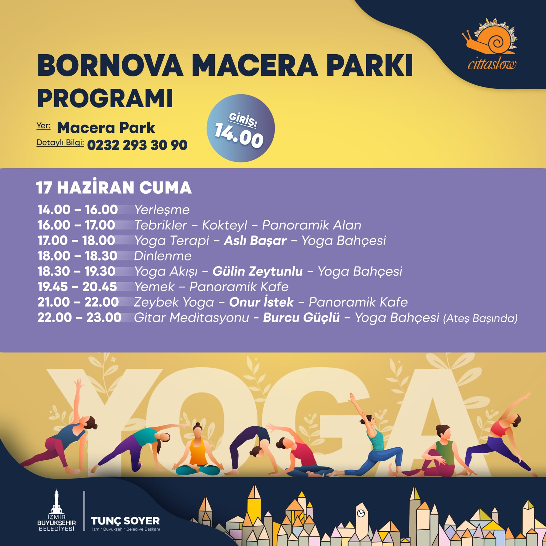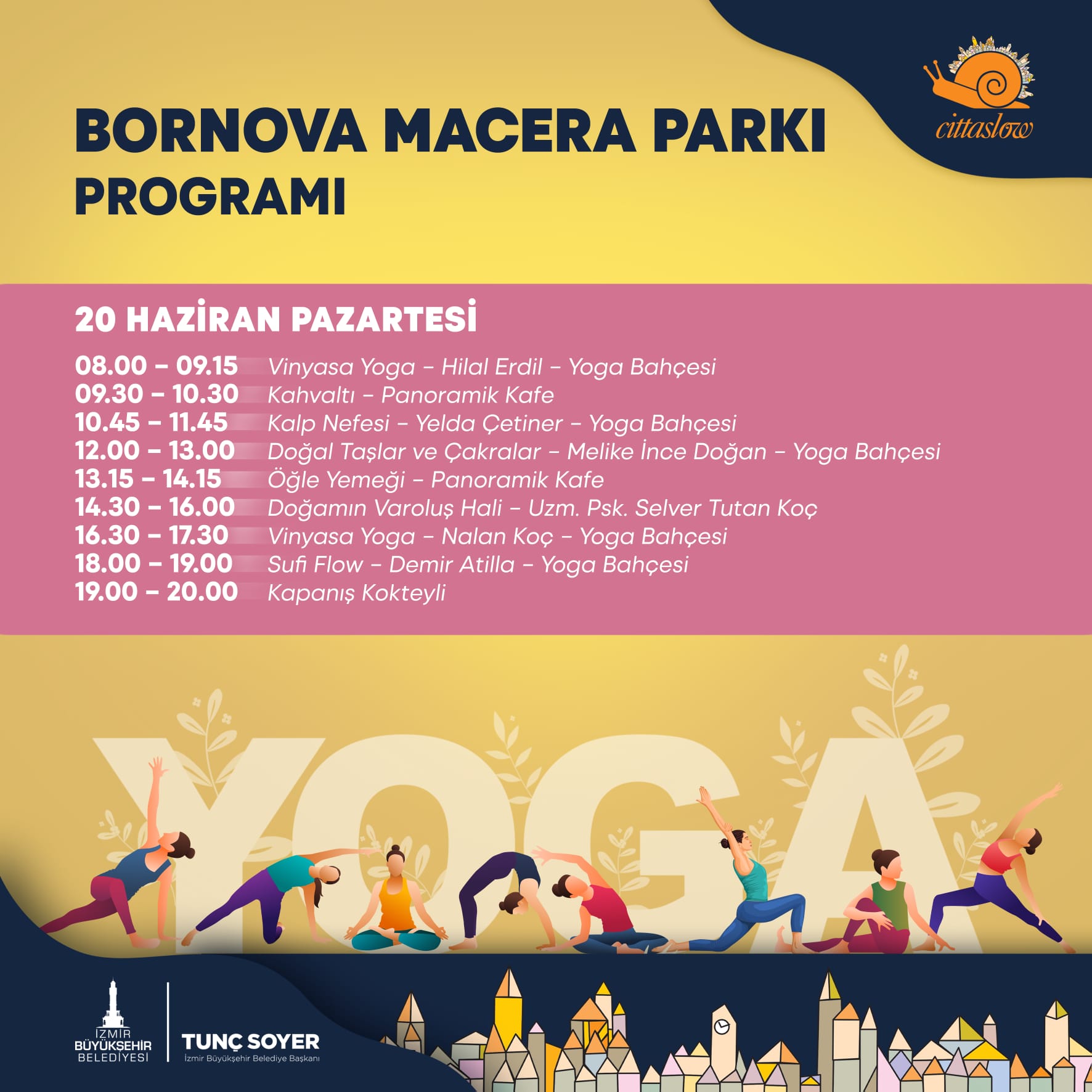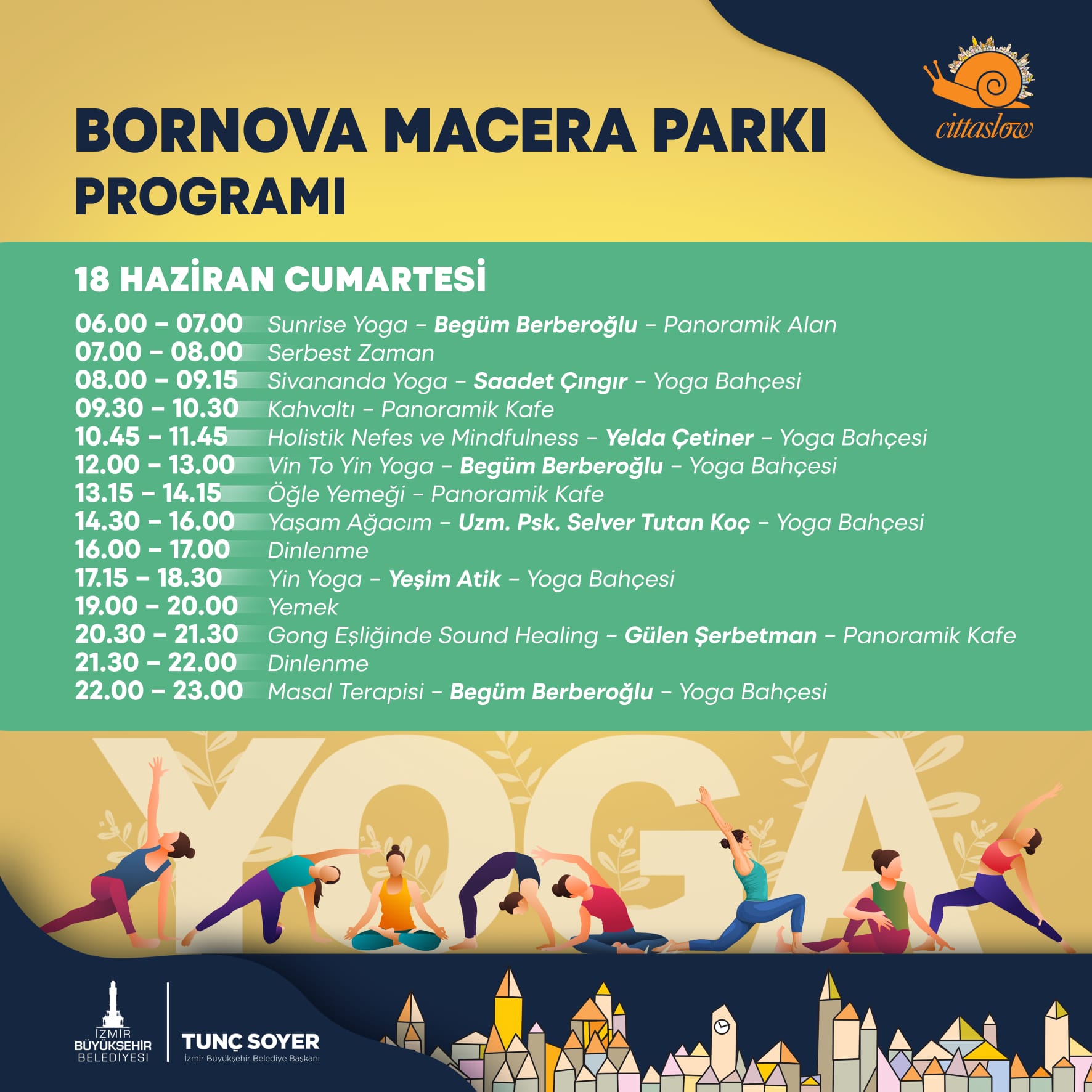 İzmir Büyükşehir Belediyesi Bornova’daki Macera Parkı’nda “Matını ve çadırını al gel” sloganıyla 17-20 Haziran tarihleri arasında yoga kampı düzenliyor. İzmir Yoga Festivali kapsamında 19-21 Haziran’da ise Kültürpark Ahşap Sahne’de gün boyu pratik ve aktiviteler yapılacak.