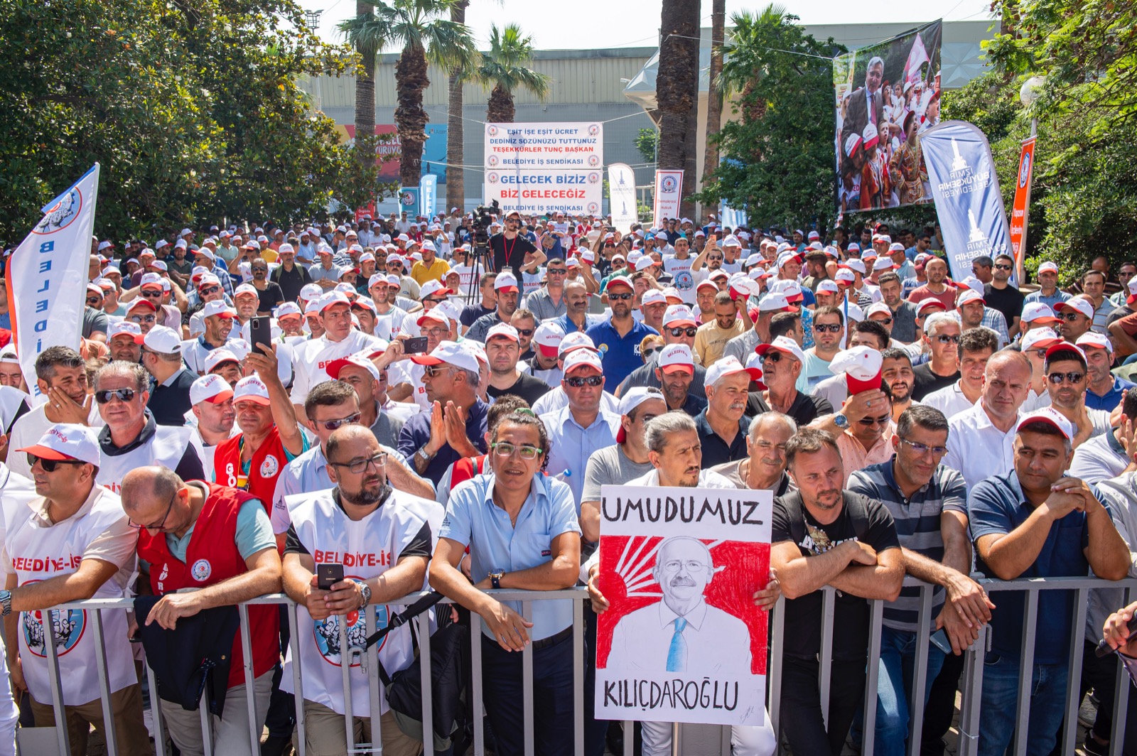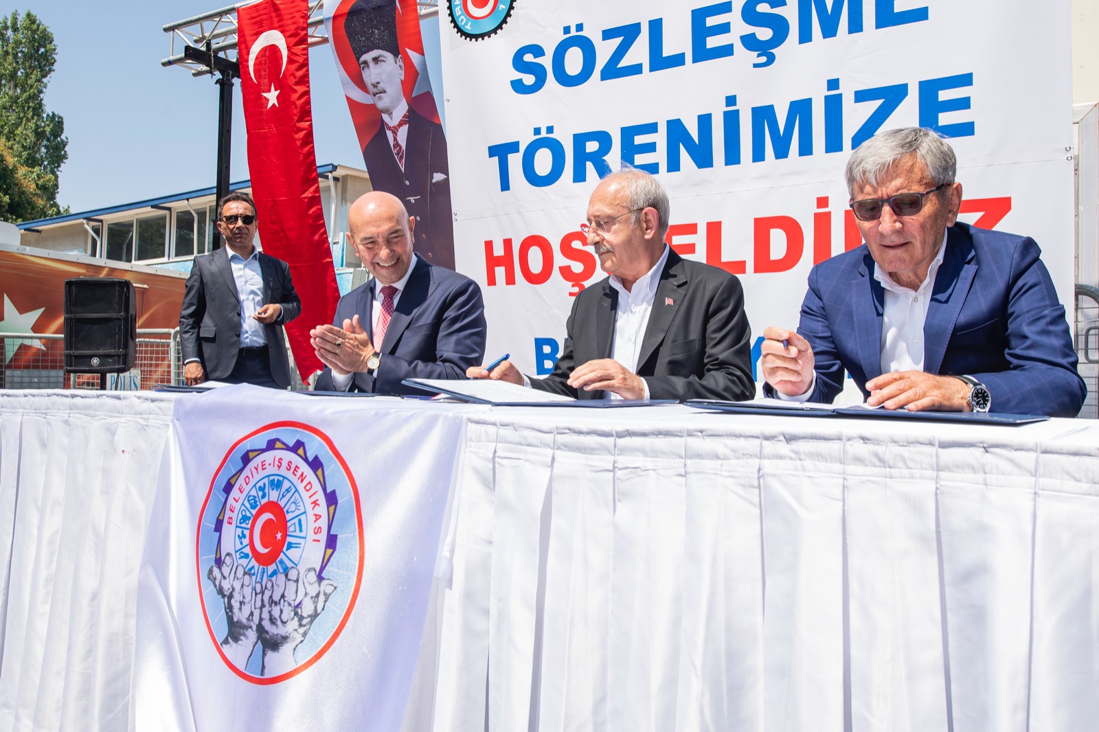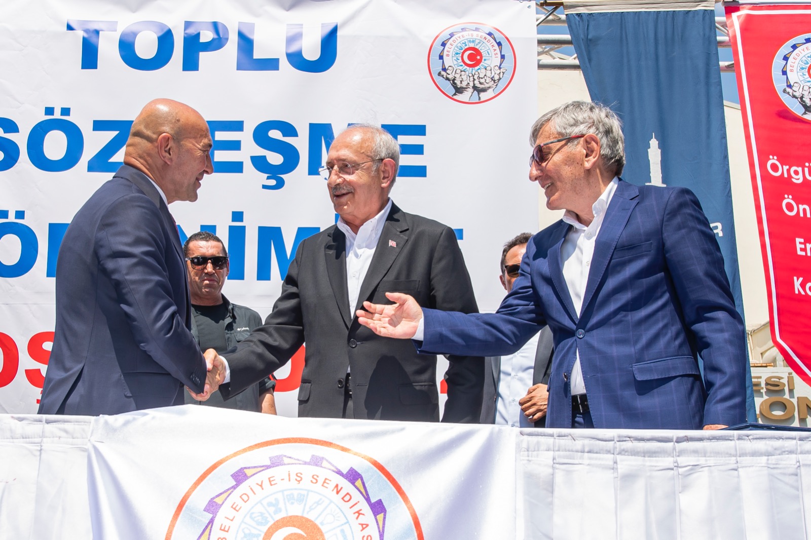 Celal Atik Spor Salonu’nun bahçesinde düzenlenen imza törenine CHP Genel Başkanı ve İzmir Milletvekili Kemal Kılıçdaroğlu, İzmir Büyükşehir Belediye Başkanı Tunç Soyer, Belediye İş Sendikası Başkanı Nihat Yurdakul katıldı. İşçilerin alın terine, emeklerine sonsuz saygı duyduğunu söyleyen CHP Genel Başkanı Kemal Kılıçdaroğlu, “100 binin üzerinde taşeron işçisi vardı ve hiç birisinin doğru düzgün sosyal güvencesi yoktu. Hiç birisinin doğru dürüst gelecek güvencesi yoktu. Erzurum’dan başlayarak örgütledik işçileri. Önce dernekler kurduk. Sokak sokak mücadelesini verdik. Ve yüz binlerce kişiye kadro vermek zorunda kaldılar. Şu an da yine on binlerce taşeron işçisi var. Hakkı hukuku savunmak zorundayız. Örgütlü olduğunuz için güçlüsünüz. Bölünüp ayrışırsanız hakkınız aranmaz bu tuzağa düşmeyin. Yüz binler açlık sınırının altında gelir alıyor. TÜİK’in önüne giderken sadece işçinin hakkını değil dul ve yetimlerin, memurun, emeklinin hakkını savunmaya gittim. Sorunu çözeceğiz kararlıyım. Ne yaparlarsa yapsınlar, hangi baskıyı yaparlarsa yapsınlar asla yolumuzdan dönmeyeceğiz. Sizden sadece sandığa giderken elinizi vicdanınıza koyup oy kullanmanızı istiyorum. Yeni bir değişime ve dönüşüme ihtiyacımız var. Yeni sözleşmeniz hayırlı olsun. Darısı milyonlarca işçiye darısı dul ve yetimlere” dedi.