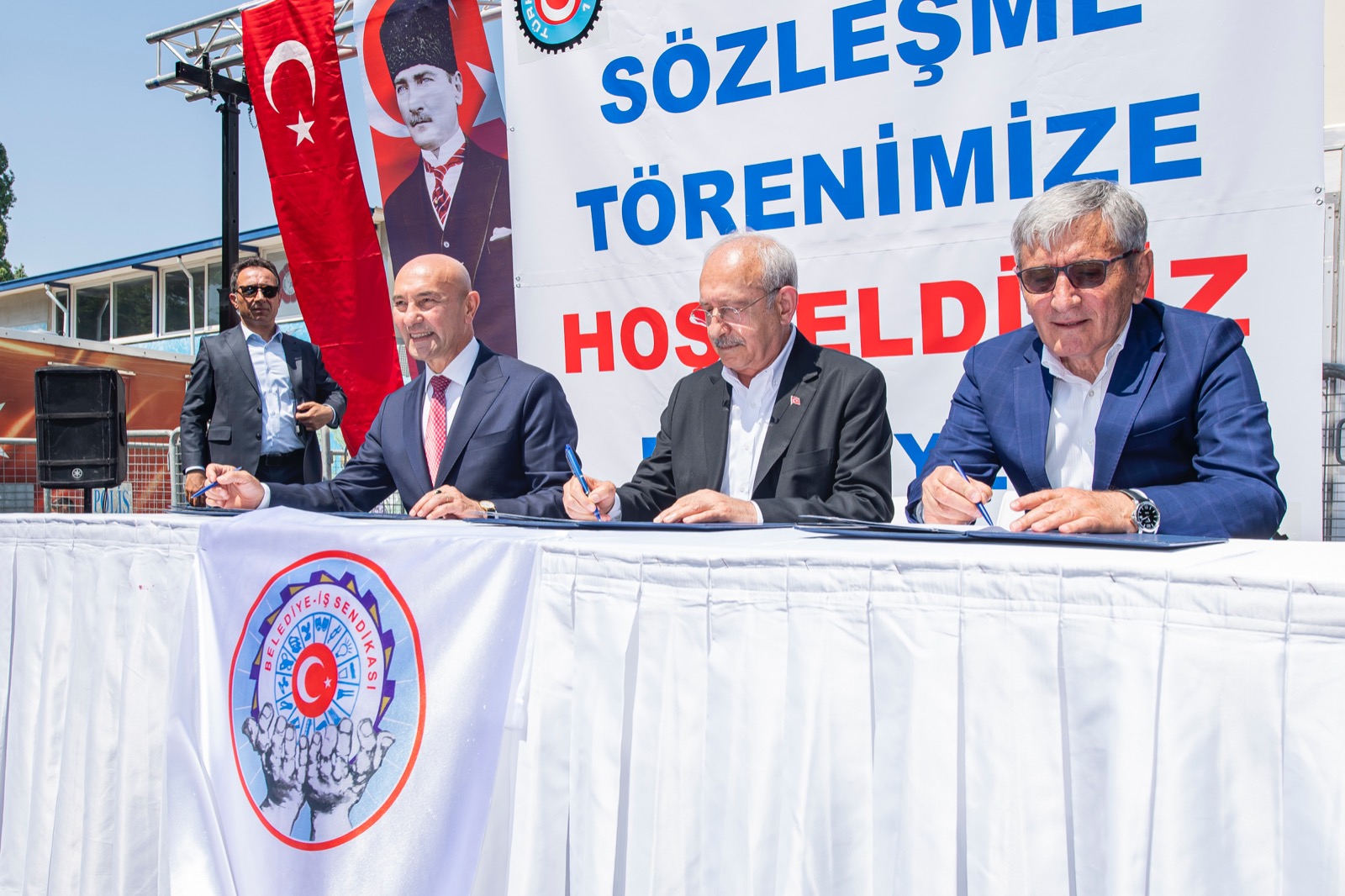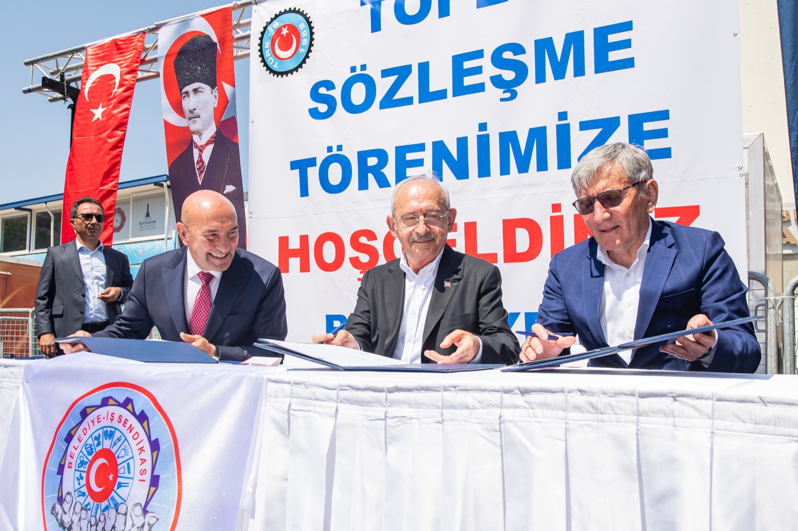 İzmir Büyükşehir Belediyesi ile Türkiye Belediyeler ve Genel Hizmetler Sendikası arasında 5 bin 248 personeli ilgilendiren toplu iş sözleşmesi CHP Genel Başkanı Kemal Kılıçdaroğlu'nun da katıldığı törenle imzalandı. Törende konuşan Başkan Soyer, “Bu dönemde yan yana, tek yürek olarak yol yürüdük, yürümeye de devam edeceğiz” dedi.