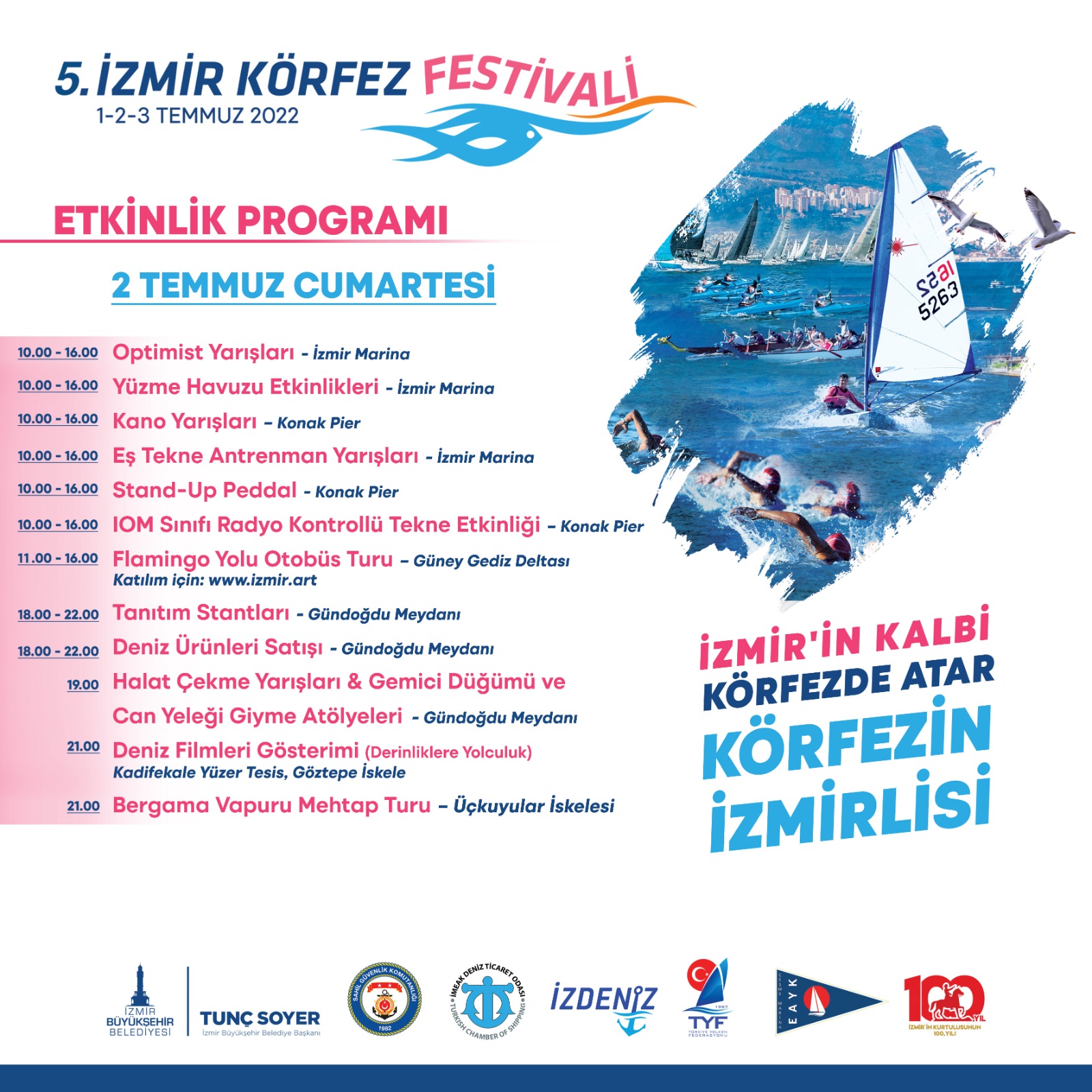 “İzmir’in Kalbi Körfez’de Atar” sloganıyla yapılacak İzmir Körfez Festivali İzmir Marina ve Konak Pier’deki su sporları etkinliklerinin yanı sıra Gündoğdu Meydanı’nda konser, atölye, yarış ve gösterilere sahne olacak. Festival kapsamında söyleşiler, film gösterimleri, sergi ve geziler de olacak. İzmirliler www.izmir.art üzerinden kaydolmak koşuluyla 2 ve 3 Temmuz tarihlerinde ücretsiz Flamingo Yolu otobüs turuna da katılabilecek.