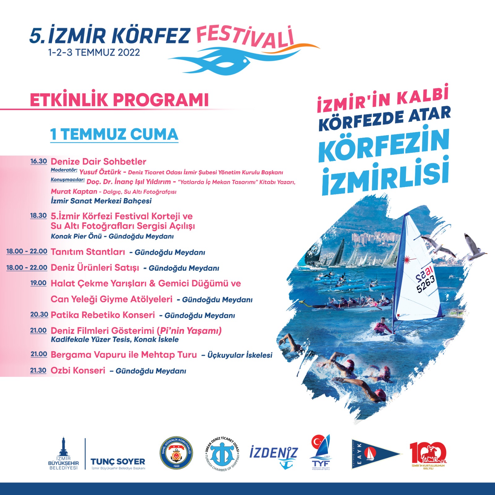 Festival 1 Temmuz’da hem karada hem denizde Konak Pier önünden başlayıp Gündoğdu Meydanı’nda sona erecek. Gündoğdu Meydanı’ndaki festival alanında aynı gün 20.30’da Patika Rebetiko grubu, 21.30’da ise Ozbi sahne alacak. Konserlerin yanı sıra uzman denizci personel tarafından gemici düğümü bağlama ve can yeleği giyme atölyeleri ile halat çekme yarışları da düzenlenecek. Ayrıca İzmirliler, Gündoğdu Meydanı’nda kurulacak stantlarda hem deniz ve denizcilikle ilgili ürünleri tanıma hem de deniz ürünlerinden oluşan lezzetleri satın alma imkanı bulacak.