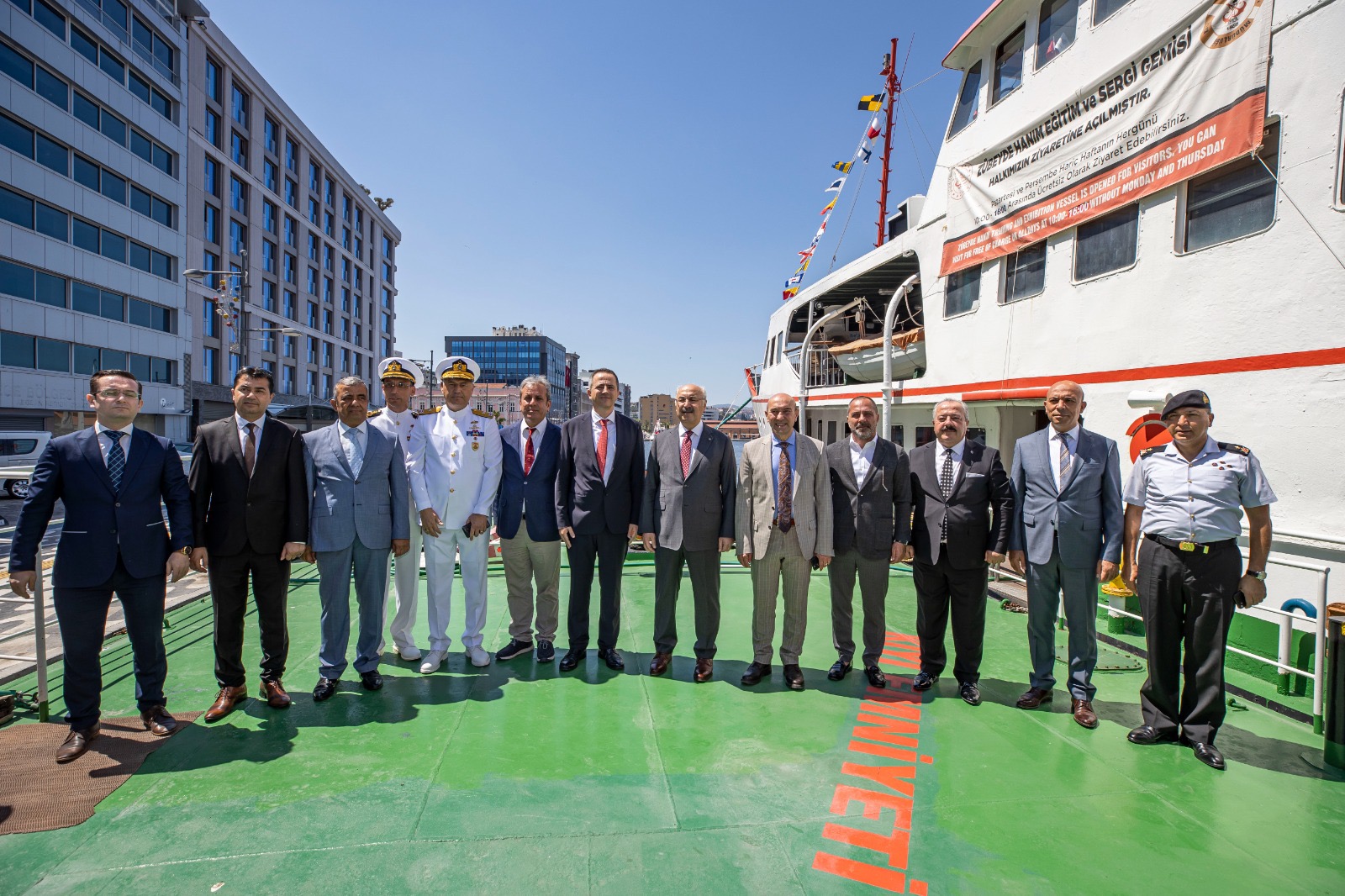 İzmir Büyükşehir Belediyesi’nin restore ettiği tarihi Bergama Vapuru ile yapılan tura Başkan Tunç Soyer’in yanı sıra İzmir Valisi Yavuz Selim Köşger, Sahil Güvenlik Ege Deniz Bölge Komutanı Tuğamiral Sayın Serkan Tezel, İzmir Emniyet Müdürü Mehmet Şahne, İZDENİZ Yönetim Kurulu Başkanı Osman Hakan Erşen, İZDENİZ Genel Müdürü Ümit Yılmaz, Deniz Ticaret Odası İzmir Şubesi Yönetim Kurulu Başkanı Yusuf Öztürk ve İzmir Liman Başkanı Ünal Hakan Atalan, çeşitli sivil toplum kuruluşlarının başkanları ile temsilcileri katıldı.
