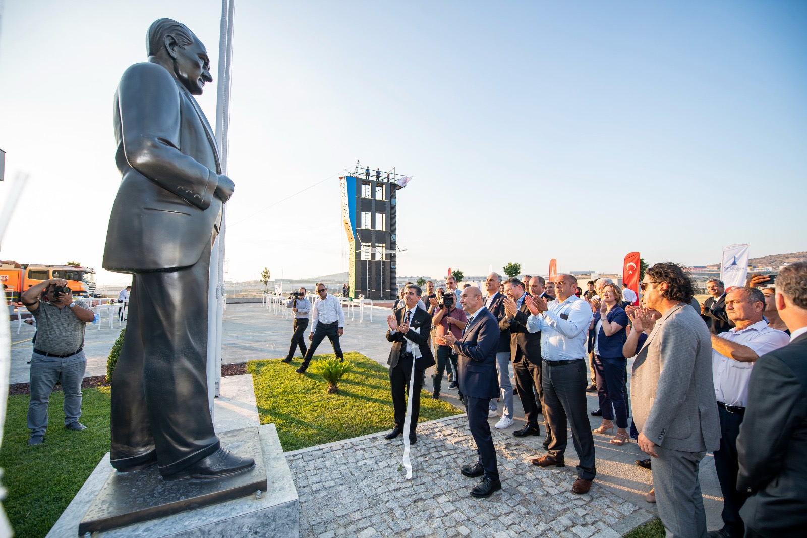 Programda Atatürk büstünün açılışı da yapıldı. Başkan Soyer ve beraberindeki heyet itfaiye merkezini gezdi ve yangın tatbikatını izledi.