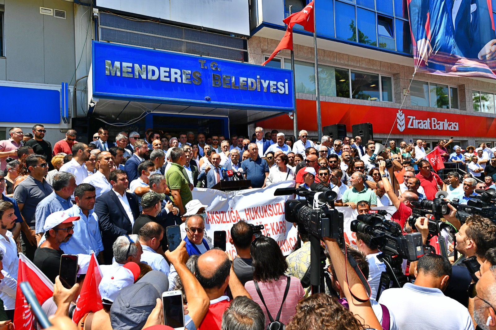 İzmir Büyükşehir Belediye Başkanı Tunç Soyer, İçişleri Bakanlığı kararıyla Menderes Belediye Başkanlığı görevinden uzaklaştırılan Mustafa Kayalar için düzenlenen basın açıklamasına katıldı. Kararı “siyasi ve keyfi” olarak niteleyen Başkan Soyer, İzmirlilere seslenerek “Bize güvenen hiçbir İzmirlinin başını öne eğecek bir iş yapmayacağız. Görevimizin son anına kadar, son nefesimize kadar alnımız açık başımız dik” dedi.