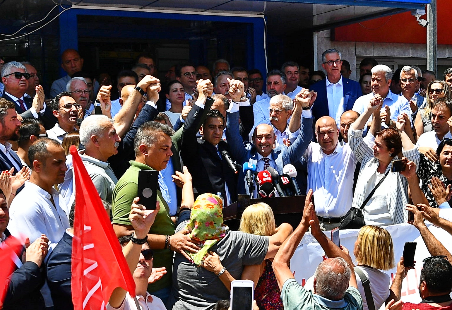 İzmir Büyükşehir Belediye Başkanı Tunç Soyer, “Bugün yine sözcüklerin boğazımıza düğümlendiği çok sıkıntılı bir gündeyiz. Haksızlığa uğramanın öfkesi içindeyiz. Son 20 yılda bu ülkede adalet çok hasar gördü. Türkiye Cumhuriyeti tarihinin hiçbir döneminde hak hukuk adalet bu kadar değersizleşmedi. Halkın hukuka güveni kalmadı. Hukuk her partiden, her siyasi görüşten, toplumun her kesiminden her bireye ve kuruluşa eşit mesafede durmayı gerektirir. Hukuk adalet gerektirir. Daha ortada kanıtlanmış bir iddia, ortaya çıkmış bir yargı kararı yokken, üstelik tutuklama talebi bile söz konusu değilken belediye başkanı arkadaşımızın görevden alınması siyasi ve keyfi bir karardır. Elbette bir gün gerçekler ortaya çıkacak. Halkın iradesini entrikalarla alaşağı etmeye çalışan bu zihniyet hak ettiği yeri bulacak. Asla umutsuzluğa, yılgınlığa yer yok. Bugün burada milletvekili ve belediye başkanı arkadaşlarımızla huzurunuzdayız. Size söz veriyorum kardeşlerim; bize güvenen hiçbir İzmirlinin başını öne eğecek bir iş yapmayacağız. Görevimizin son anına kadar, son nefesimize kadar alnımız açık başımız dik İzmirlinin bize verdiği desteğe layık olmak için canla başla aşkla çalışmaya devam edeceğiz” ifadelerini kullandı.