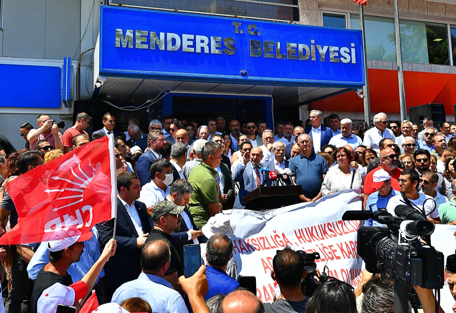 İzmir Büyükşehir Belediye Başkanı Tunç Soyer, hakkında tutuklama ve yargı kararı olmaksızın İçişleri Bakanlığı tarafından görevden uzaklaştırılan Menderes Belediye Başkanı Mustafa Kayalar için düzenlenen basın açıklamasına katıldı. Cumhuriyet Halk Partisi (CHP) İzmir İl Başkanlığı tarafından Menderes Belediyesi’nin önünde düzenlenen açıklamada sık sık “Mustafa Kayalar yalnız değildir”, “Hak hukuk adalet” sloganları atıldı. Açıklamaya CHP İzmir İl Başkanı Deniz Yücel, CHP Parti Meclisi (PM) Üyesi ve İzmir Milletvekili Ednan Arslan, CHP Yüksek Disiplin Kurulu (YDK) Üyesi ve İzmir Milletvekili Mahir Polat, CHP İzmir milletvekilleri Kani Beko, Atilla Sertel, Murat Bakan, Bedri Serter ve Tacettin Bayır, ilçe belediye başkanları, CHP'nin il ve ilçe örgütü temsilcileri, sendika temsilcileri, belediye personeli ve yurttaşlar katıldı.