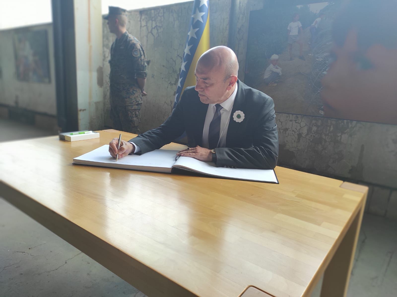 Soyer, anı defterinin ardından eski akü fabrikasında kurulan Dr. Paul Lowe'nin "Kuşatma", yazar Nermina Memic'in "Uyarı" ve küratörler Azir Osmanovic, Elma Hašimbegovic, Elma Hodzic'in "(Asla) Geçmemiş Olanların İzinde" adlı sergisini gezdi. Serginin ardından heyet birçok ülkeden temsilcinin katıldığı resmi anma törenine katıldı.