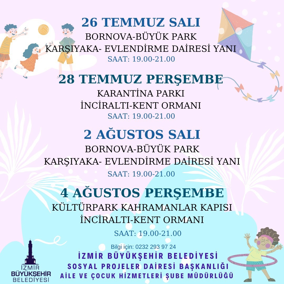 Sokak etkinlikleri 25 Temmuz-30 Eylül tarihleri arasında 10 haftalık süreyle 19.00-21.00 saatleri arasında düzenlenecek. Salı günleri Bornova Büyükpark ve Karşıyaka Evlendirme Dairesi’nin çevresinde, perşembe günleri ise İnciraltı Kent Ormanı’nda ve Karantina Meydanı’yla Kültürpak’ta dönüşümlü olarak yapılacak. Açık alandaki etkinliklere aynı ayna ortalama elli çocuk katılabilecek. Etkinliklerde yaş şartı aranmayacak.