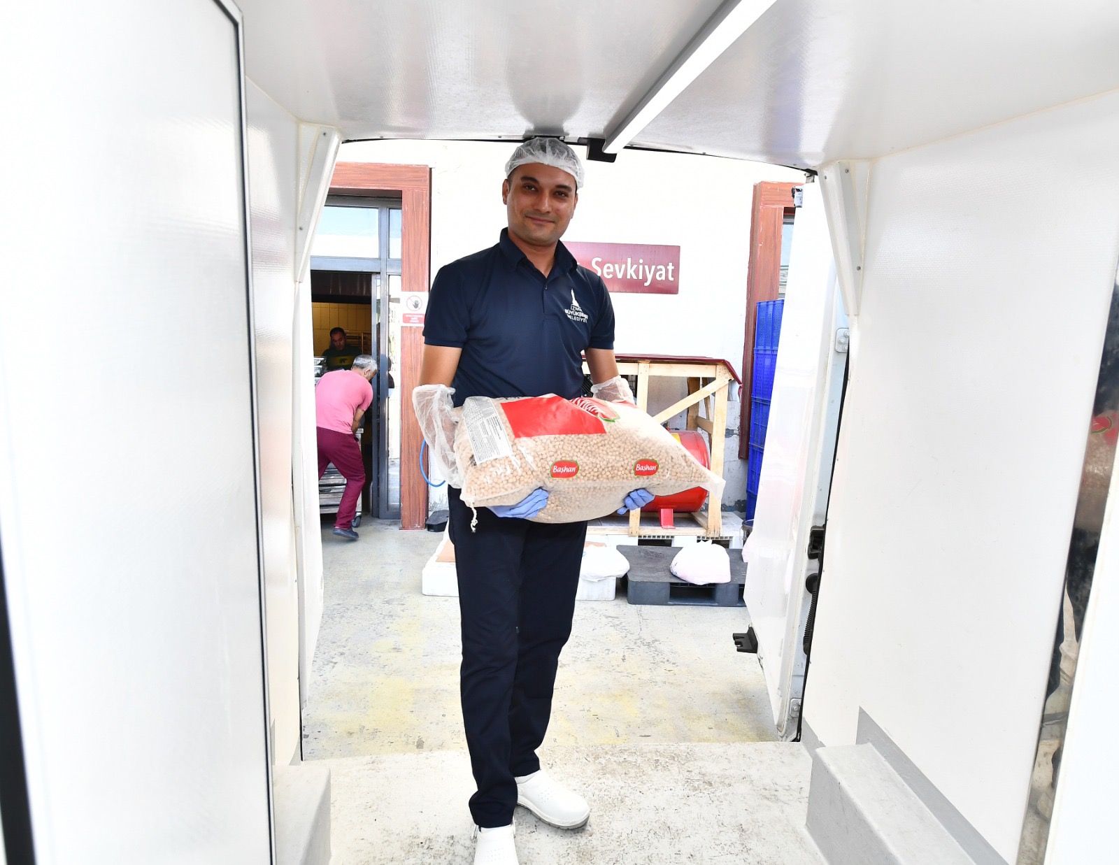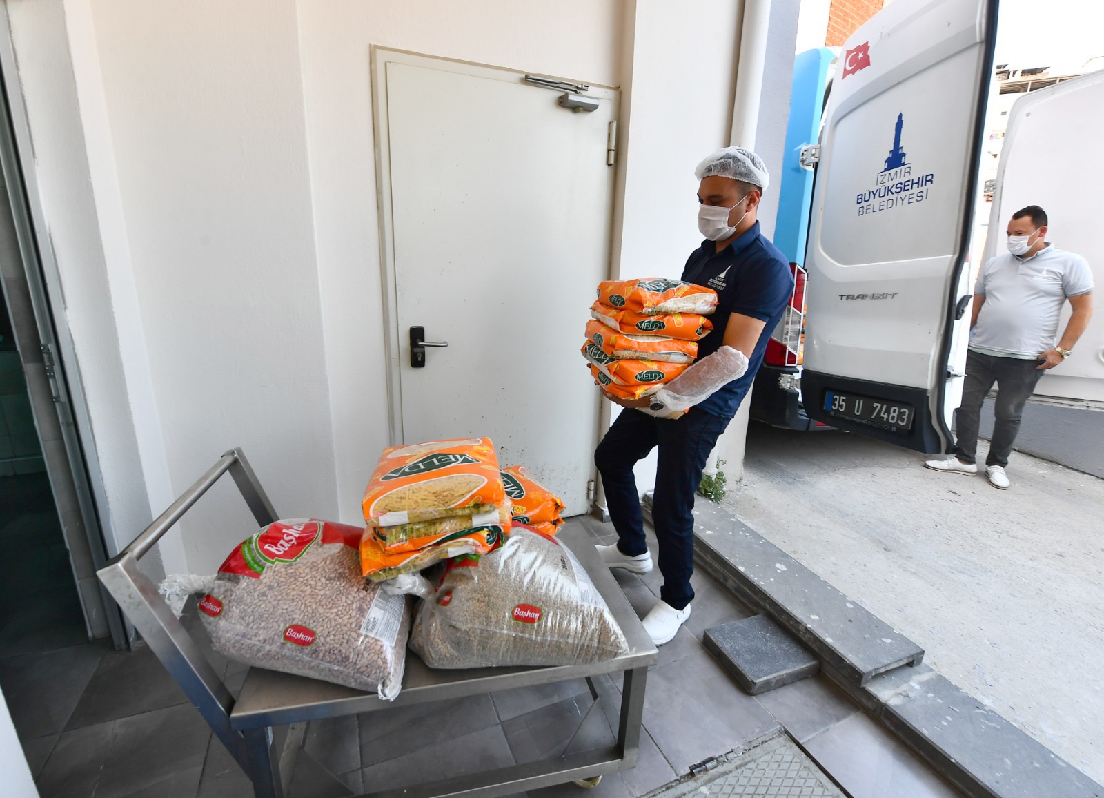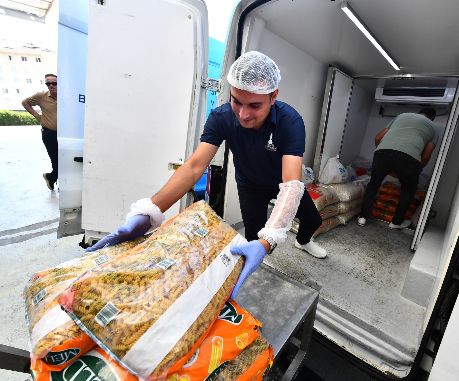 İzmir Büyükşehir Belediyesi Sosyal Hizmetler Dairesi Başkanlığı Aşevleri Şube Müdürlüğü ekiplerine ait araçlarla ulaştırılan kolilerde kuru fasulye, nohut, yeşil mercimek, barbunya, kırmızı mercimek, pirinç, bulgur, arpa şehriye, erişte ve makarna bulunuyor.
