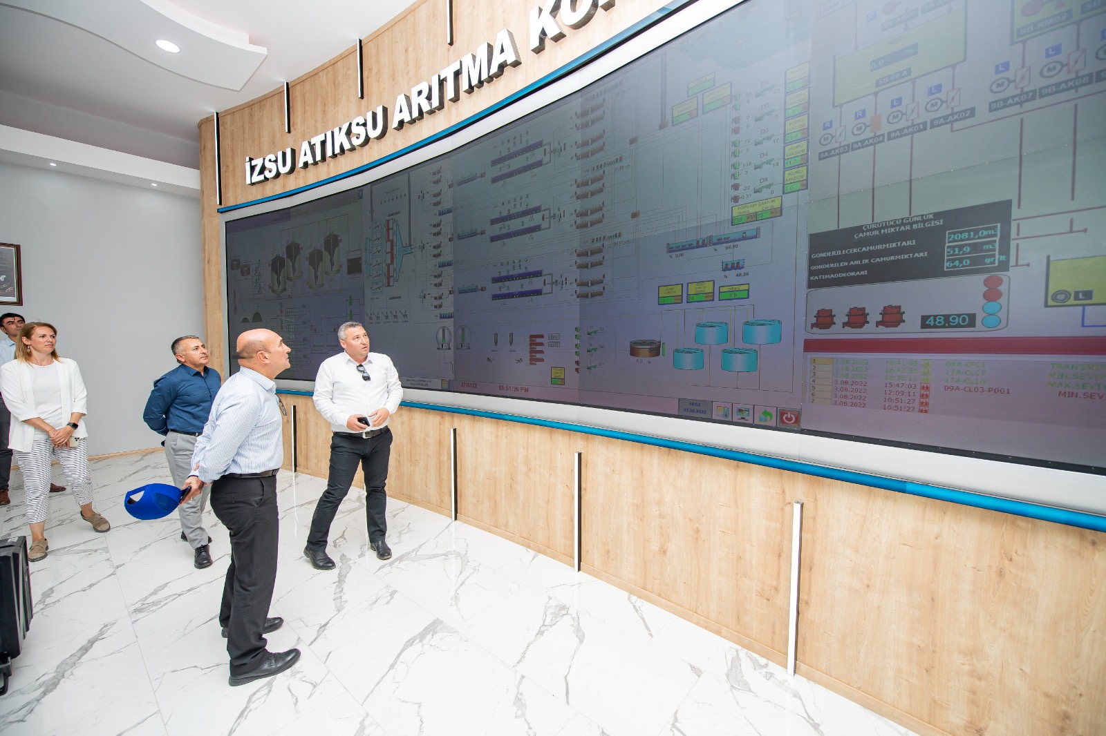 Tesisin arıtma kalitesini ve kapasitesini artıracak çalışmaları inceleyen Başkan Soyer, İZSU Genel Müdürü Ali Hıdır Köseoğlu ve İZSU bürokratlarından bilgi aldı.