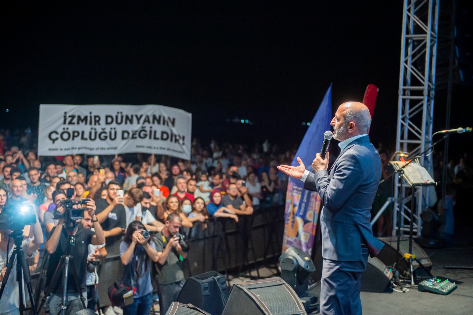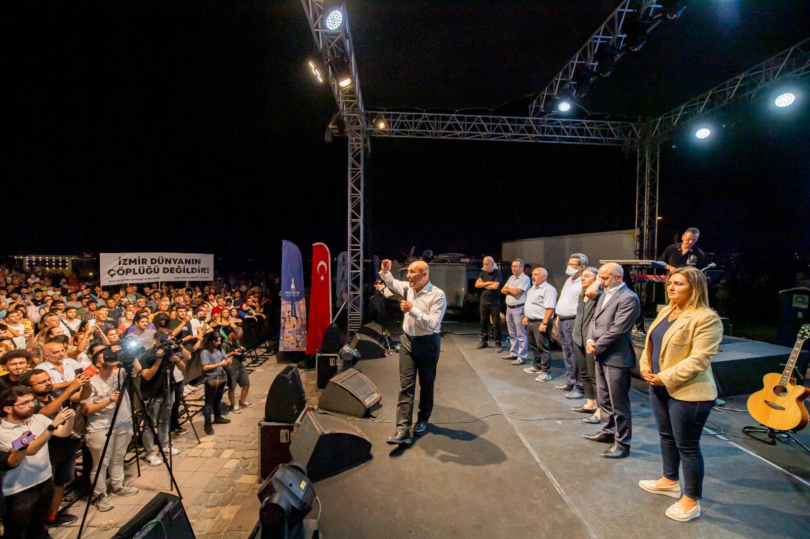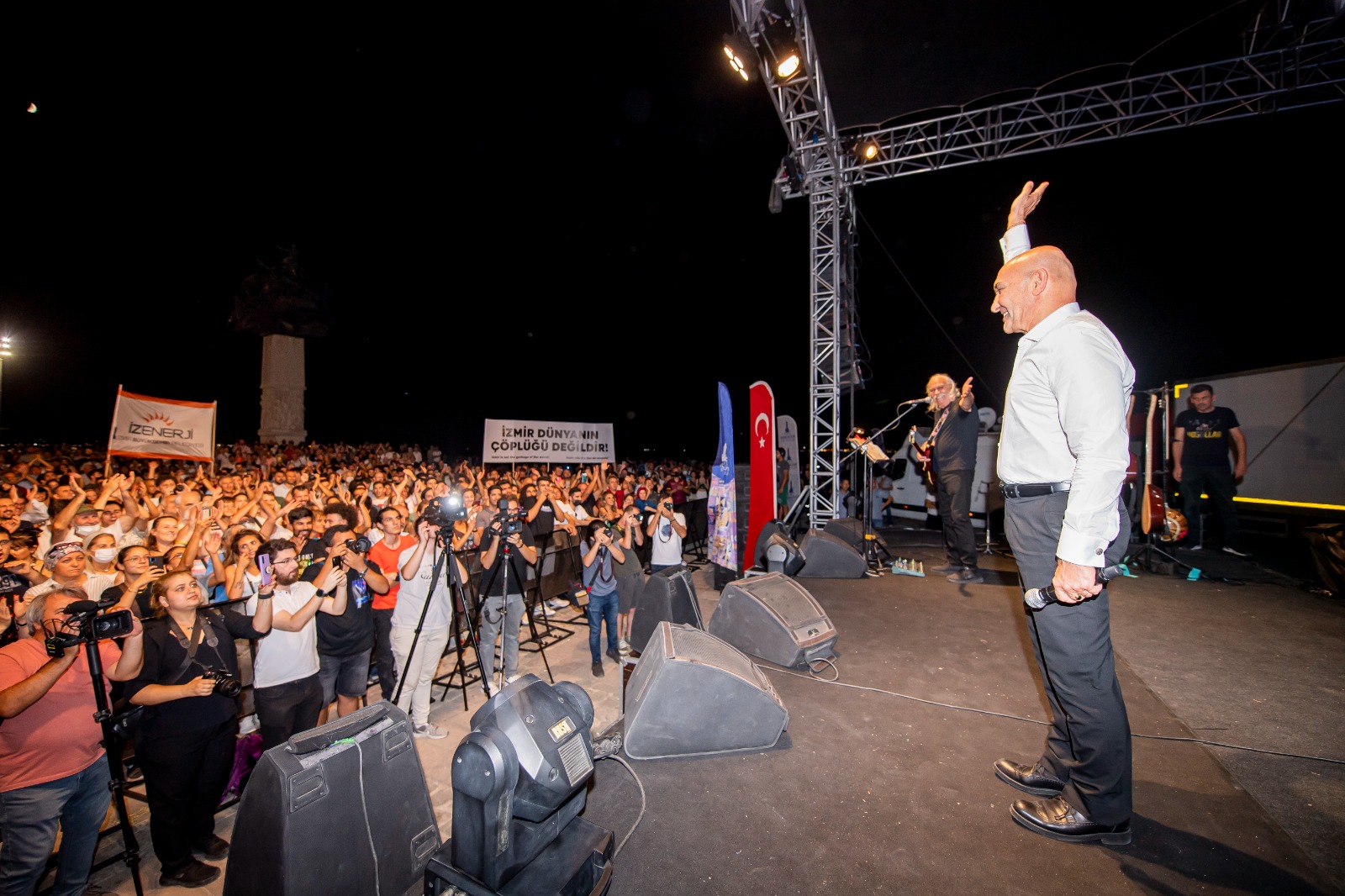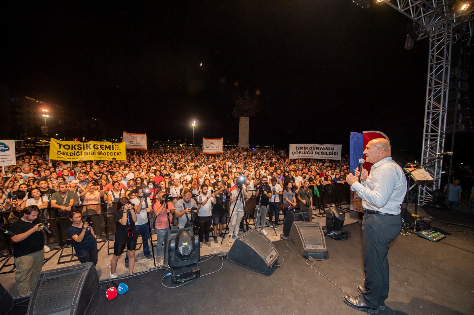 Moğollar, İzmir Büyükşehir Belediyesi ev sahipliğinde sevilen parçalarını bu kez insan ve çevre sağlığını korumak için seslendirdi. Alanı dolduran yurttaşlar, üzerinde “Toksik gemi geldiği gibi gidecek”, “İzmir dünyanın çöplüğü değil” yazılı pankartlar taşıdı.