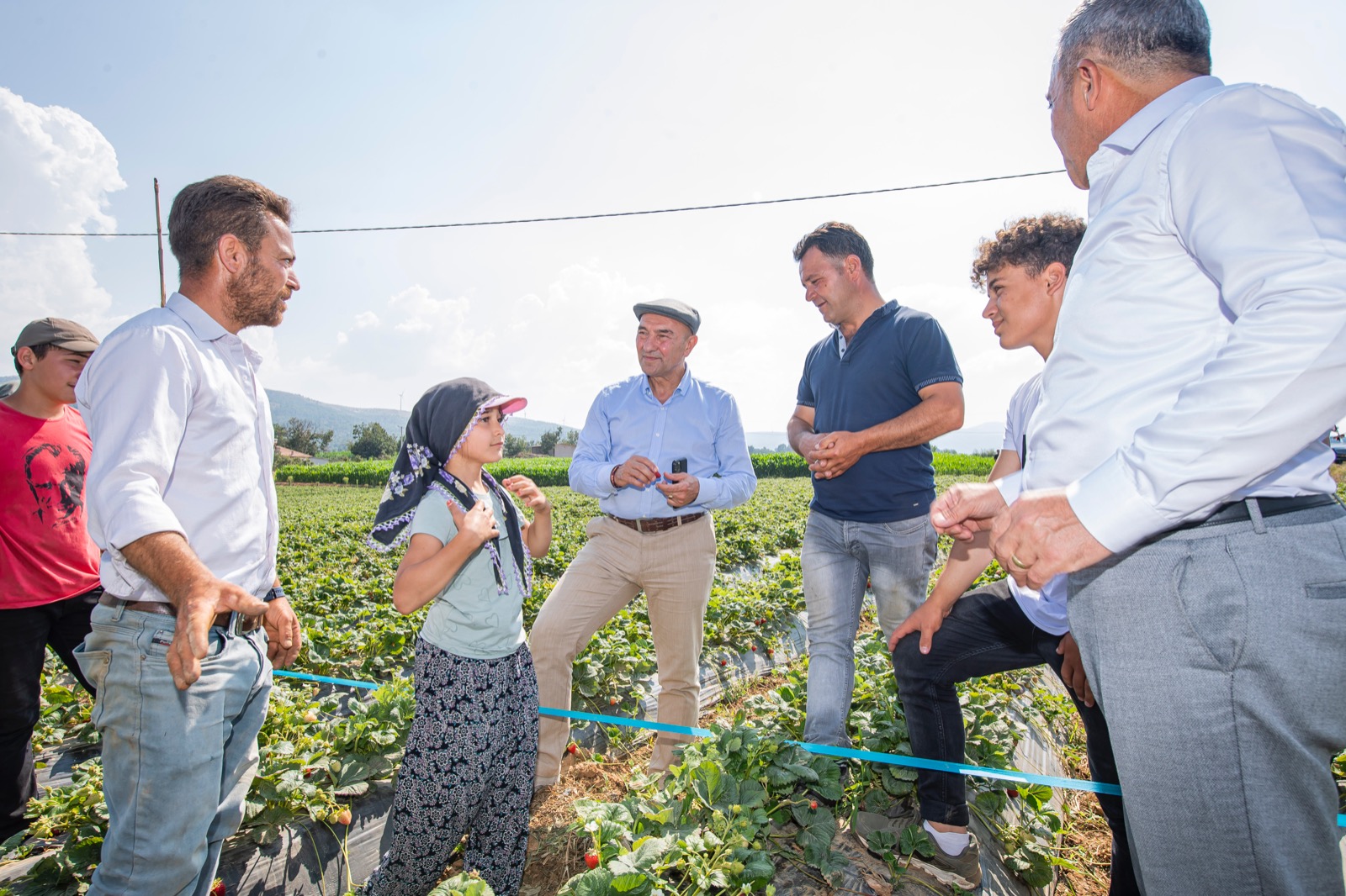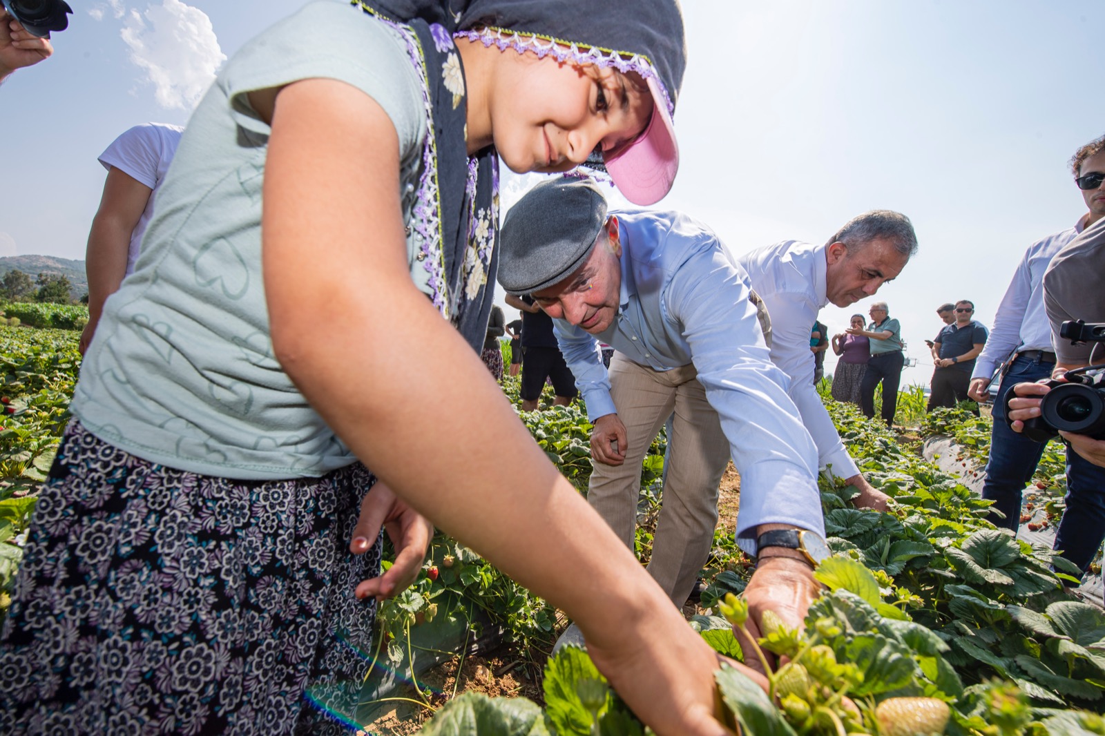 Başkan Tunç Soyer, Beydağ'da tarlaları ziyaret ederek küçük üreticilerle bir araya geldi. Sorunları dileyen Başkan Soyer, Ovacık Yaylası'nda 9 yaşındaki Gülden Koçak ile çilek topladı.