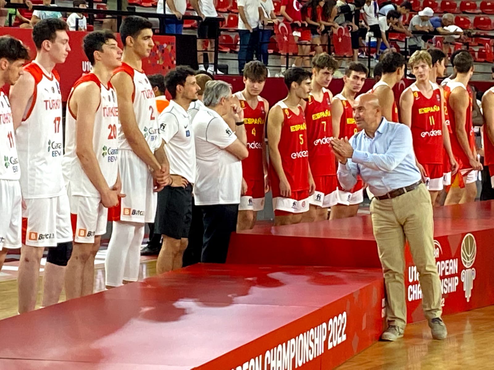 İzmir Büyükşehir Belediye Başkanı Tunç Soyer, Türkiye ile İspanya arasında Mustafa Kemal Atatürk Karşıyaka Spor Salonu’nda oynanan FIBA 18 Yaş Altı Erkekler Avrupa Şampiyonası final maçını tribünden izledi. Maçın ardından sosyal medya hesabından bir paylaşım yapan Başkan Tunç Soyer şu ifadeleri kullandı: “Teşekkürler gençler. FIBA 18 Yaş Altı Erkekler Avrupa Şampiyonası’nda, milli sporcularımız bizlere büyük heyecan ve gurur yaşattı. Avrupa ikincisi olan gençlerimizle iftihar ediyoruz. Gelecekte bir çok şampiyonluklara imza atacaklarına eminim.”