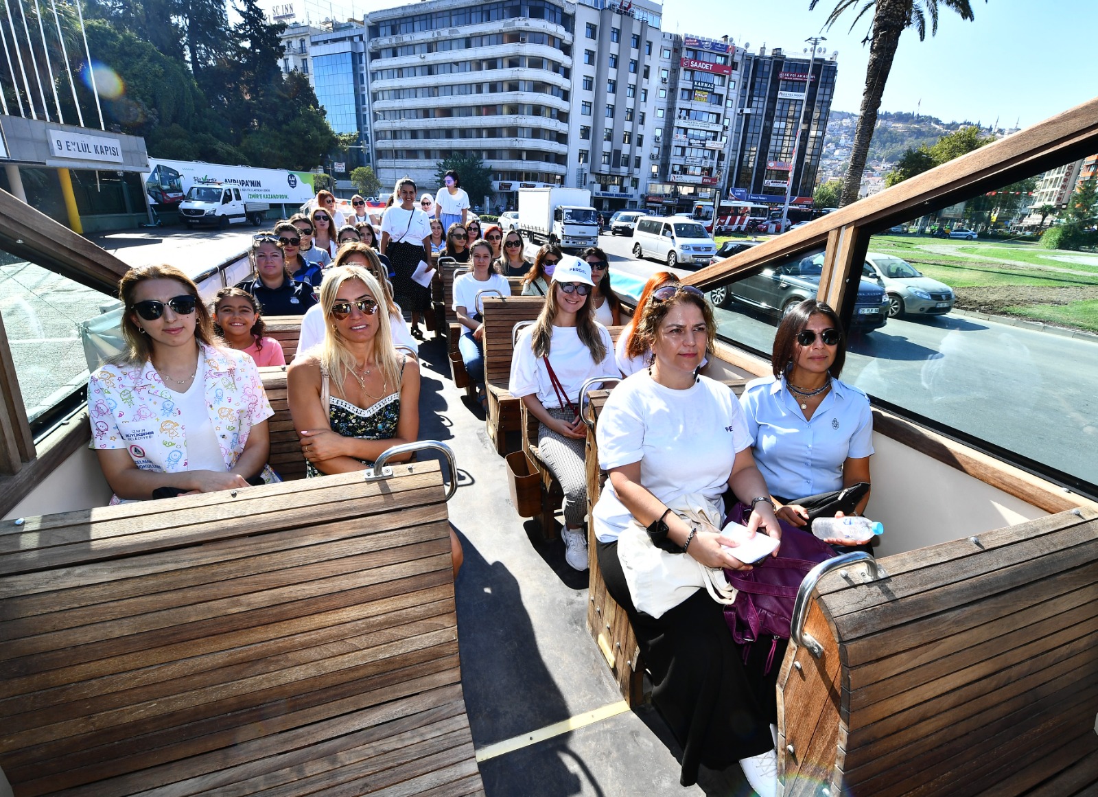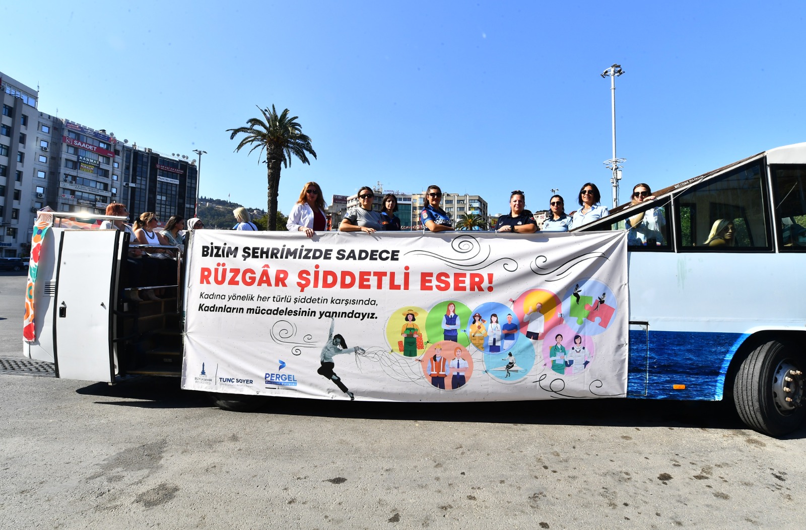 Basın açıklamasının ardından kadına yönelik şiddetin ve kadın cinayetlerinin son bulması için farkındalık turu atıldı. Kadınlar, “Bizim şehrimizde sadece rüzgar şiddetli eser” yazısıyla giydirdikleri üstü açık otobüsle Basmane’den çıktıkları turu, Konak, Fahrettin Altay, Alsancak ve Karşıyaka’dan geçerek tamamladı.