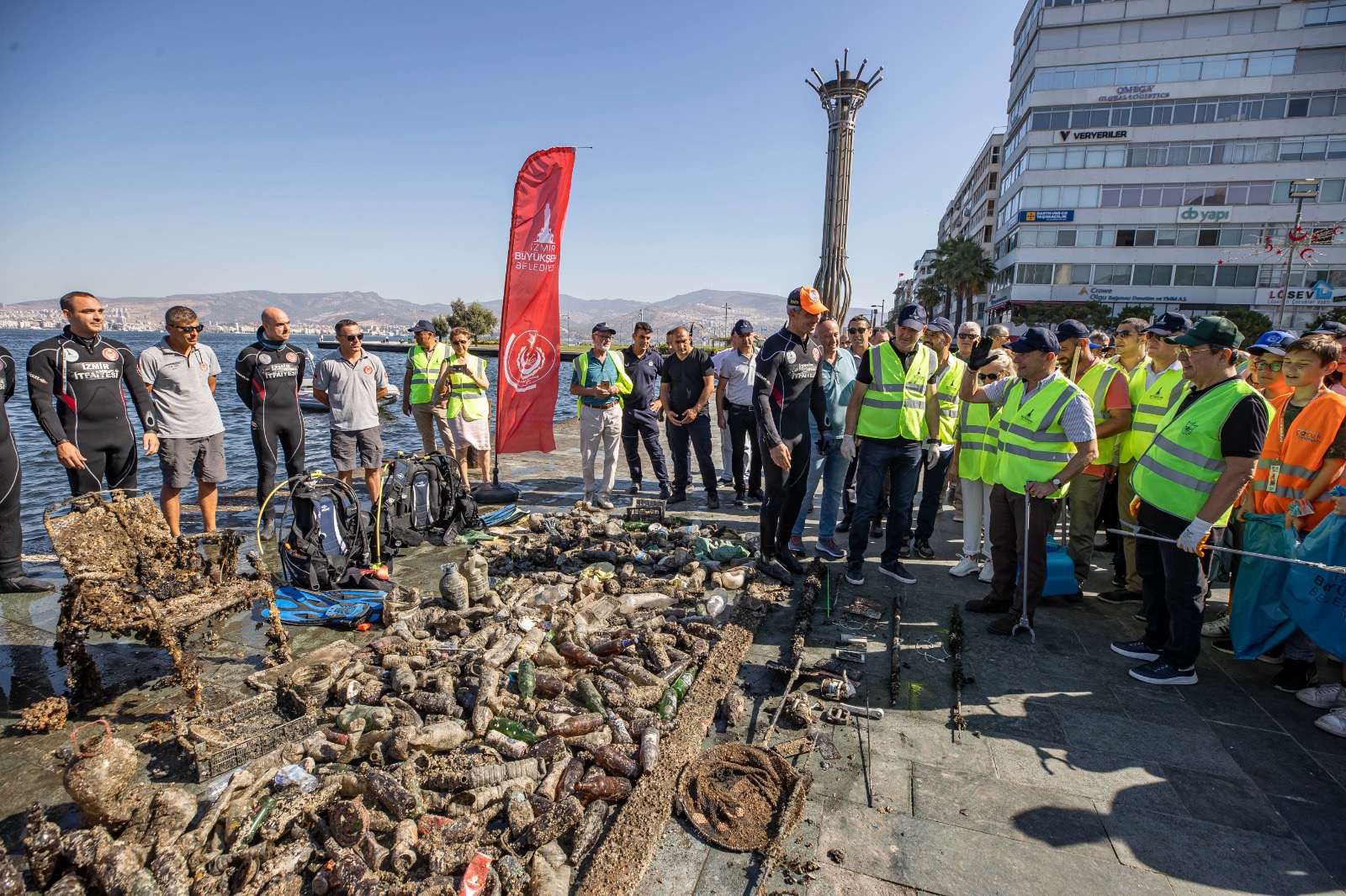 Cumhuriyet Meydanı’nda son bulan temizlik çalışması sonrasında İzmir Büyükşehir Belediyesi İtfaiyesi Arama Kurtarma Dalgıç Ekipleri de Başkan Tunç Soyer’i körfez temizliğinden çıkardıkları malzemelerle karşıladı. Temizlik harekatına denizden destek veren 6 itfaiye eri dalgıç, Cumhuriyet Meydanı önünden yaptıkları dalış sonrasında körfezden sandalye, cep telefonu, cüzdan, kredi kartı gibi gereçler çıkardı. İzmir Büyükşehir Belediyesi İtfaiyesi Arama Kurtarma Dalgıç Ekipleri her ay düzenli olarak kentin farklı güzergahlarında körfez dip temizliği yapıyor.