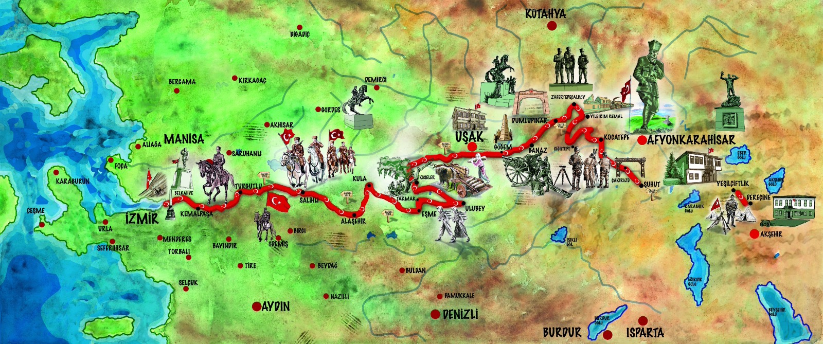Güzergâh üzerindeki Atatürk Evi, müze ve şehitlik ziyaretlerinin ardından Dumlupınar’a yürüyecek ekip, Mustafa Kemal Paşa’nın “Ordular İlk Hedefiniz Akdeniz’dir, İleri” emriyle ulusun zaferini müjdelediği Zafertepe’de düzenlenecek etkinliklere de katılacak. Banaz, Uşak, Ulubey, Eşme, Kula, Alaşehir, Salihli, Ahmetli, Turgutlu ve Kemalpaşa’nın kurtuluş günü kutlamalarına katıldıktan sonra İzmir’e doğru ilerlemeye devam edecek kafilenin son durağı ise 9 Eylül sabahı Cumhuriyet Meydanı’nda düzenlenecek İzmir’in kurtuluş törenleri olacak. Yürüyüş kafilesi, Kocatepe, Zafertepe ve Dumlupınar şehitliklerinden bayrağa sardıkları hatıra toprağını da Cumhuriyet Meydanı’nda yükselen Atatürk Anıtı’nın toprağına katacak.