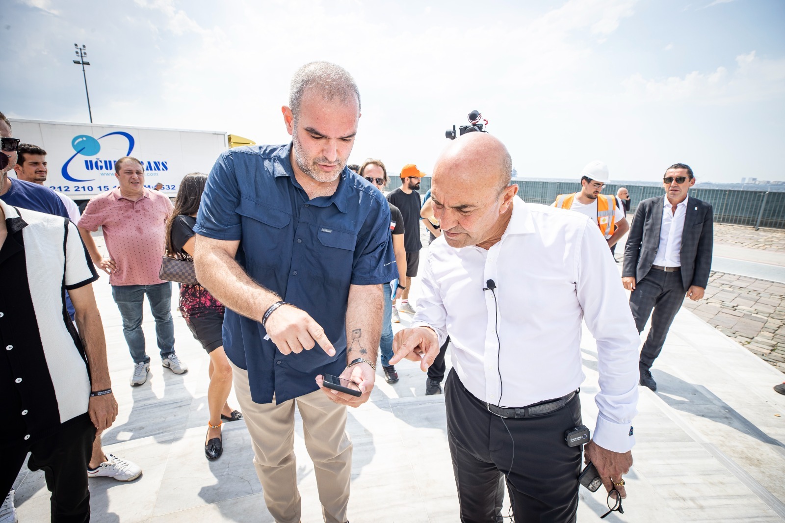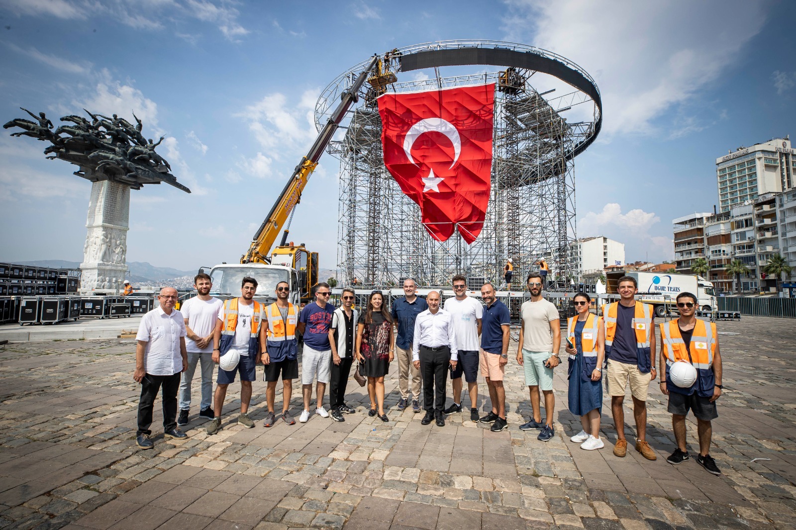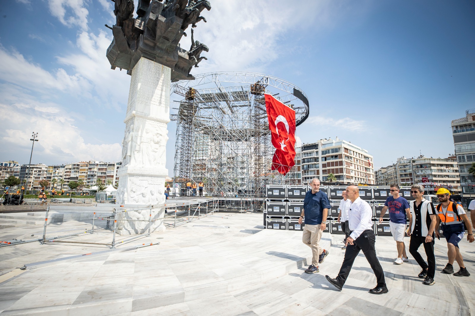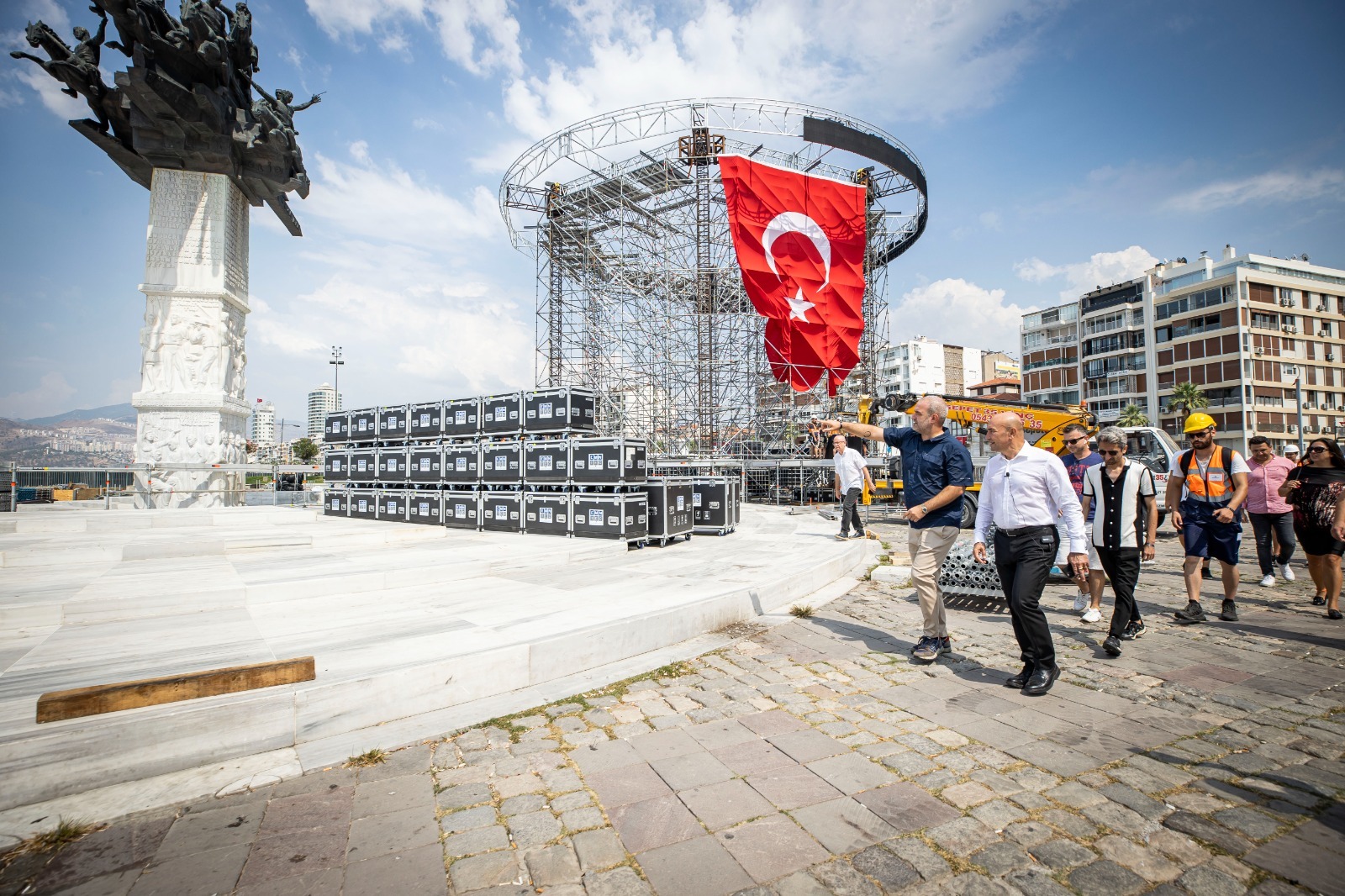 İzmir Büyükşehir Belediye Başkanı Tunç Soyer, İzmir’in kurtuluşunun 100’üncü yıl dönümü için tarihe geçecek etkinliklerin hazırlıklarını inceledi. İzmir Büyükşehir Belediyesi tarafından Türkiye’nin en görkemli 9 Eylül kutlamalarına ev sahipliği yapacak Gündoğdu Meydanı’na gelen Başkan Tunç Soyer, artırılmış gerçeklik destekli interaktif teatral şovun yapılacağı dev sahnenin yapım çalışmaları hakkında bilgi aldı.
