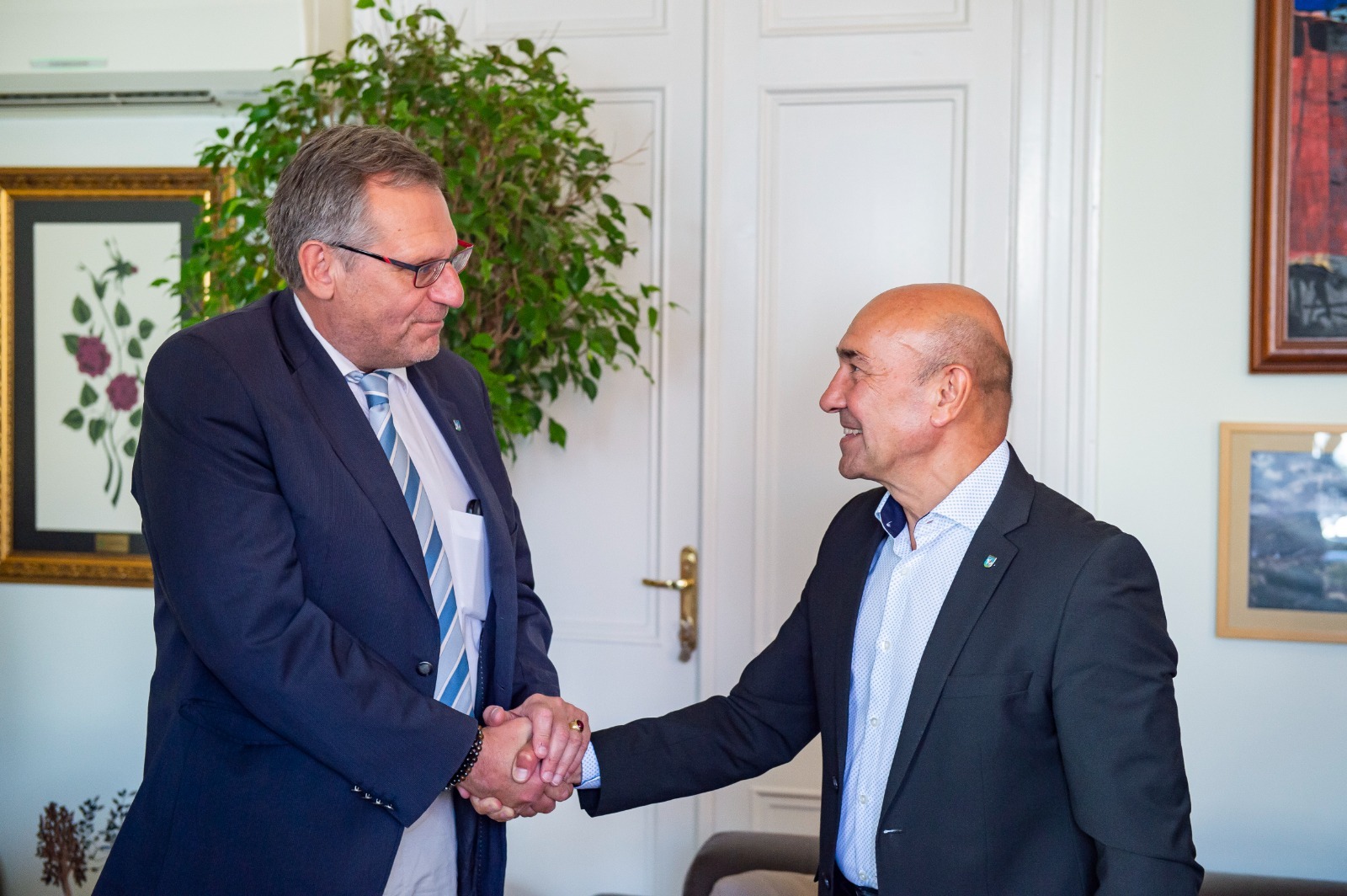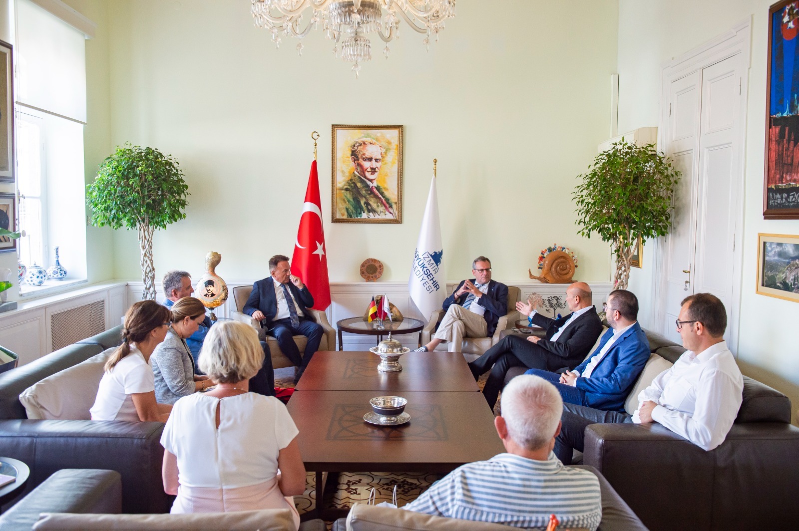 Almanya’nın Bingen am Rhein şehrinin Belediye Başkanı Thomas Feeser, İzmir Büyükşehir Belediye Başkanı Tunç Soyer'i ziyaret ederek Şubat 2023'te Almanya'da yapılacak Dünya Kardeş Şehirler Turizm Birliği buluşmasına konuşmacı olarak davet etti. 91. İEF ve Terra Madre Anadolu İzmir'i de ziyaret etmeyi planlayan Feeser’a Başkan Soyer, İzmir Tarımı'nı ve hedeflerini anlattı.