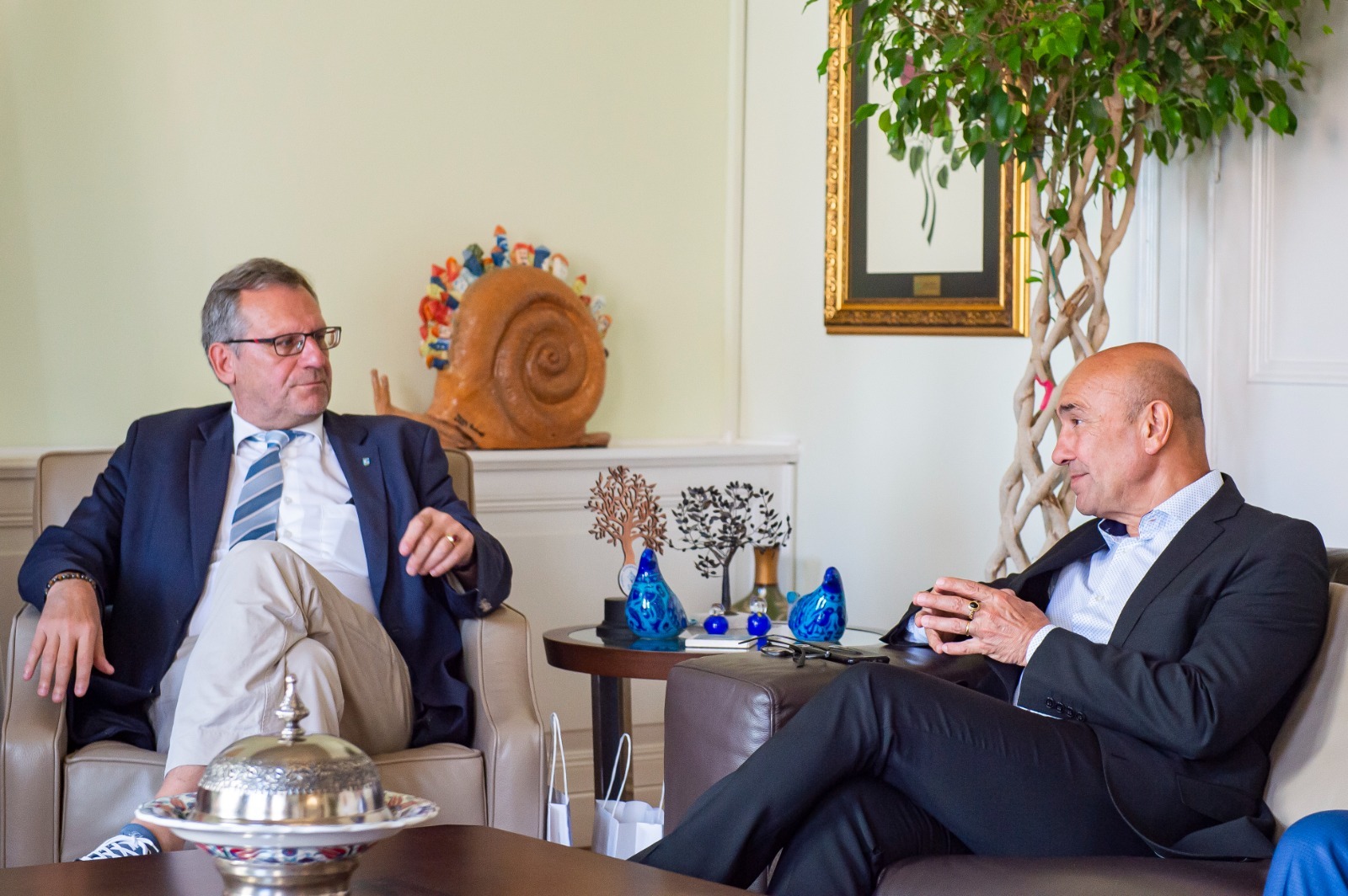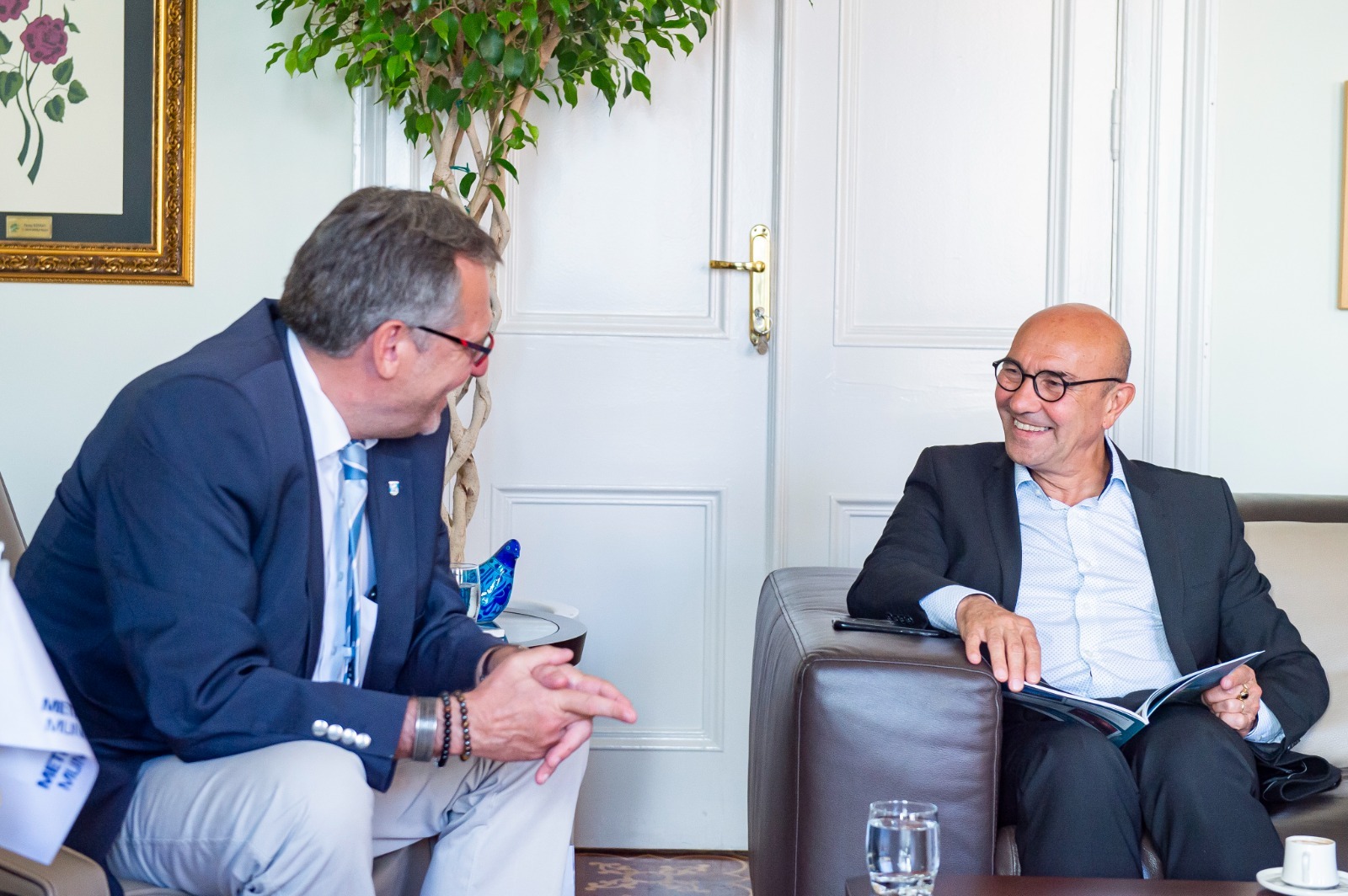 İzmir Büyükşehir Belediye Başkanı Tunç Soyer, Dünya Kardeş Şehirler Turizm Birliği Başkanı (TCWTA) ve Almanya’nın Bingen am Rhein Belediye Başkanı Thomas Feeser’i makamında ağırladı. Ziyarete TCWTA Başkan Yardımcısı Jürgen Port, TCWTA Genel Sekreteri Hüseyin Baraner yer aldı. 2-11 Eylül tarihlerinde 91. İEF kapsamında düzenlenecek uluslararası gastronomi fuarının heyecanı içerisinde olduğunu ifade eden Başkan Tunç Soyer, “Bu fuarı düzenlememizin bir temel nedeni var. Her vatandaşımızın yeterince ve sağlıklı gıdaya erişimini güvence altına almak. Gastronomi sadece lezzet değil. Sağlık, tarih, turizm, enerji her şey iç içe. Biz, yerelden ama tüm dünyaya ilham olabilecek güçte bir tarım politikası inşa etmek zorundayız” dedi.