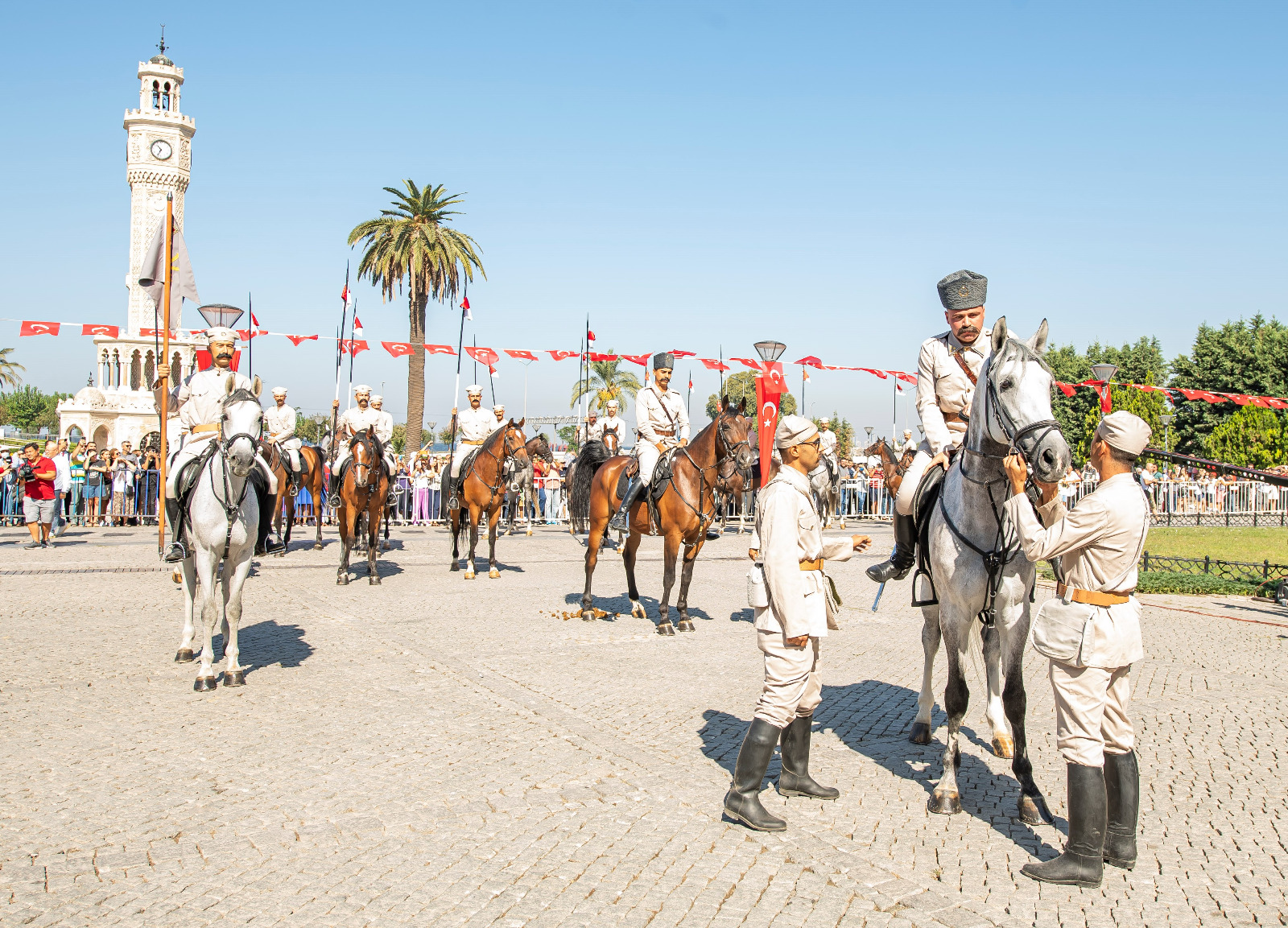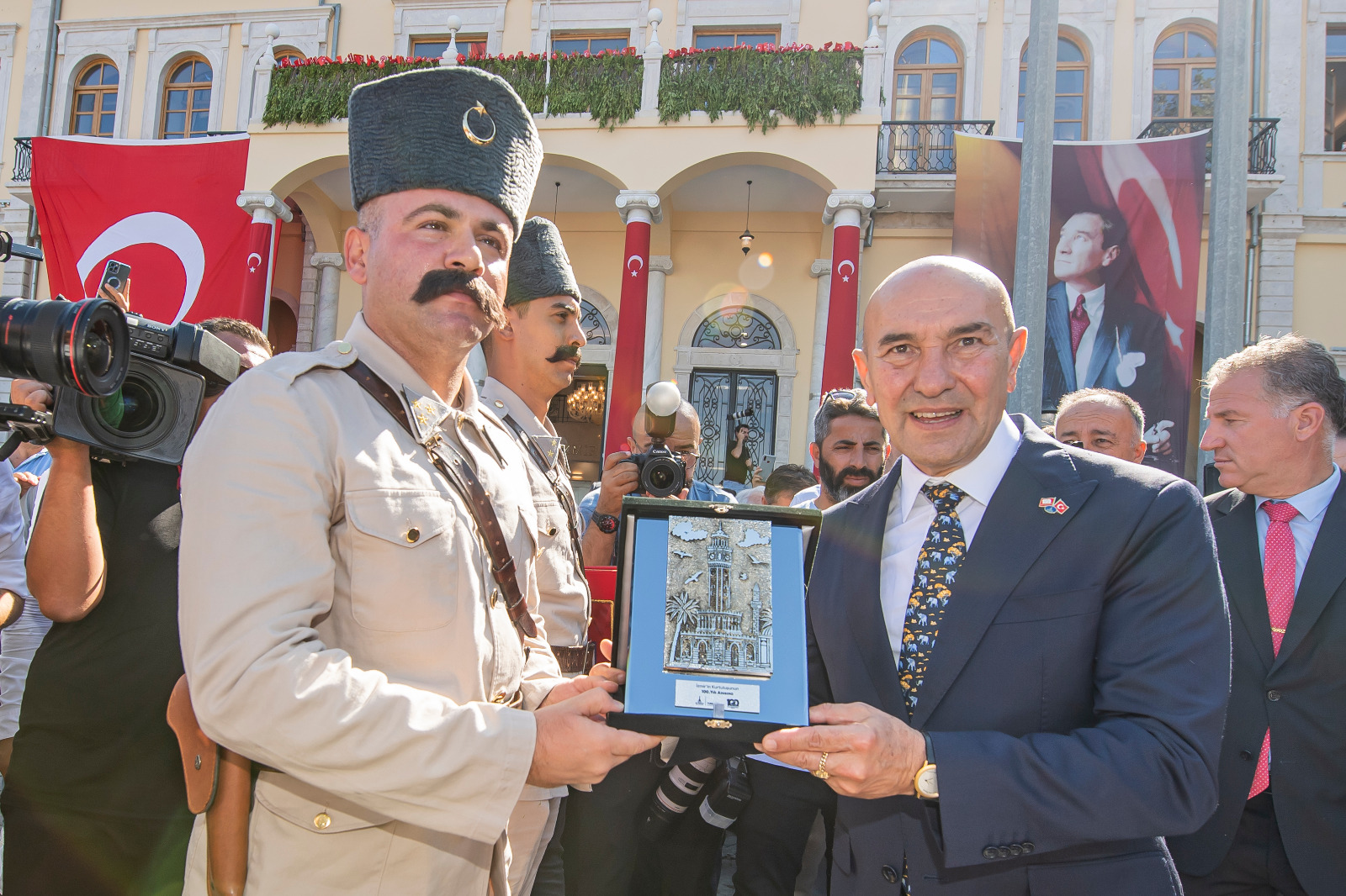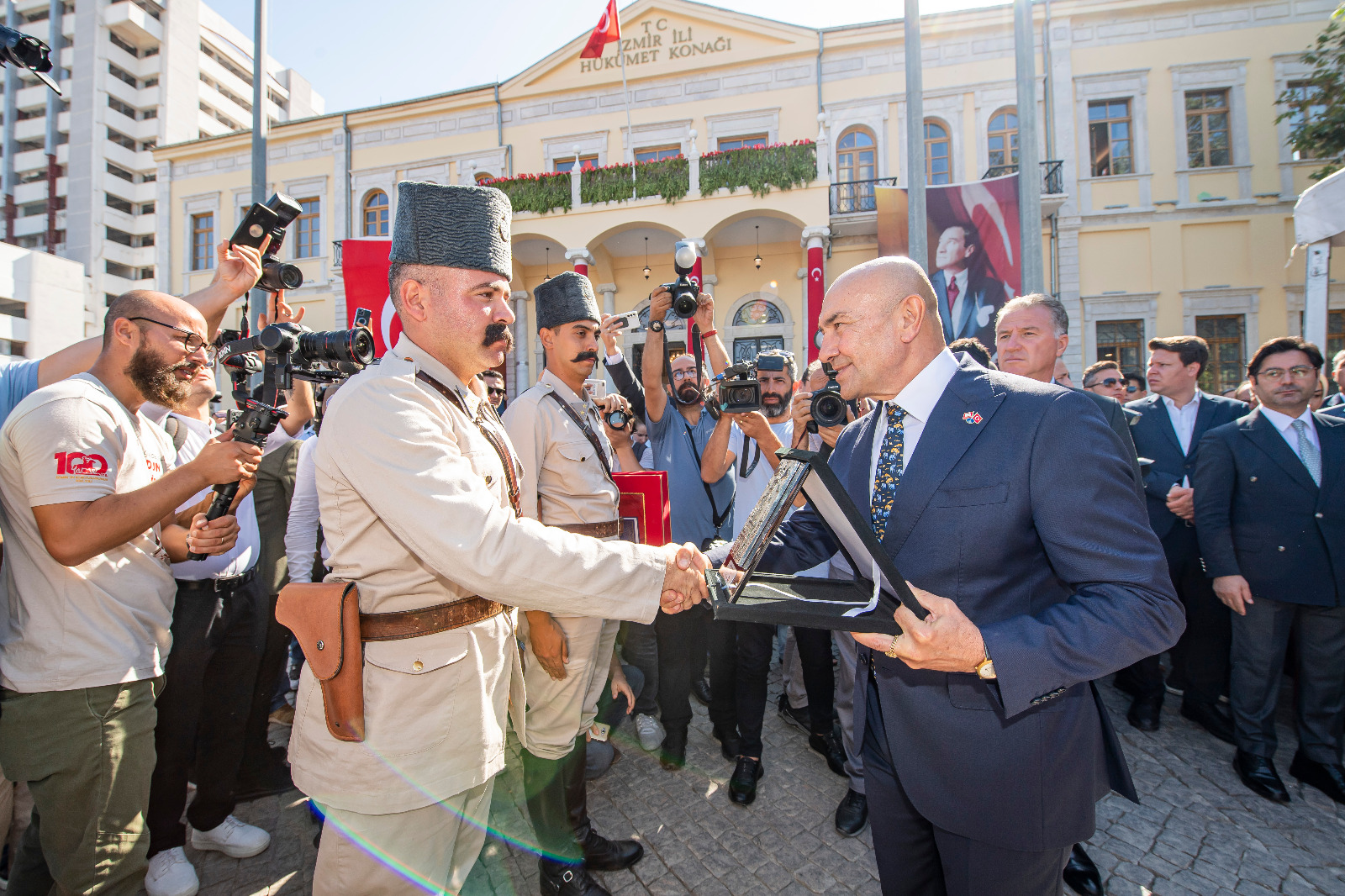 İzmir’in işgalden kurtuluşunun 100. yıldönümü kutlamaları kapsamında Konak Meydanı’nda temsili bayrak töreni yapıldı. Törende İzmir’in kurtuluşunu canlandıran süvari birlikleri İzmir Hükümet Konağı’nın önüne geldi ve Yüzbaşı Şerafettin’i temsil eden bir asker Hükümet Konağı’na Türk bayrağını çekti.