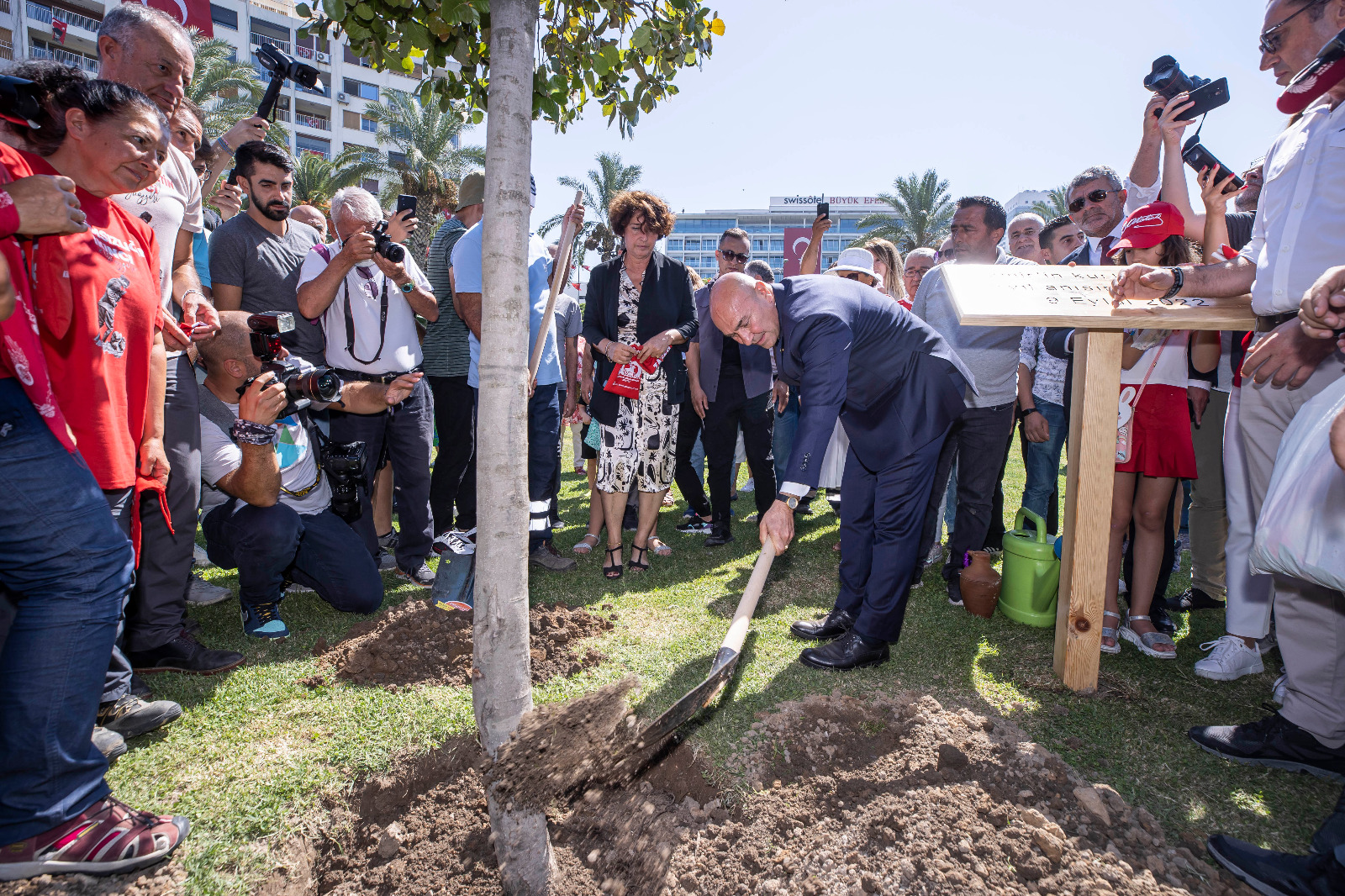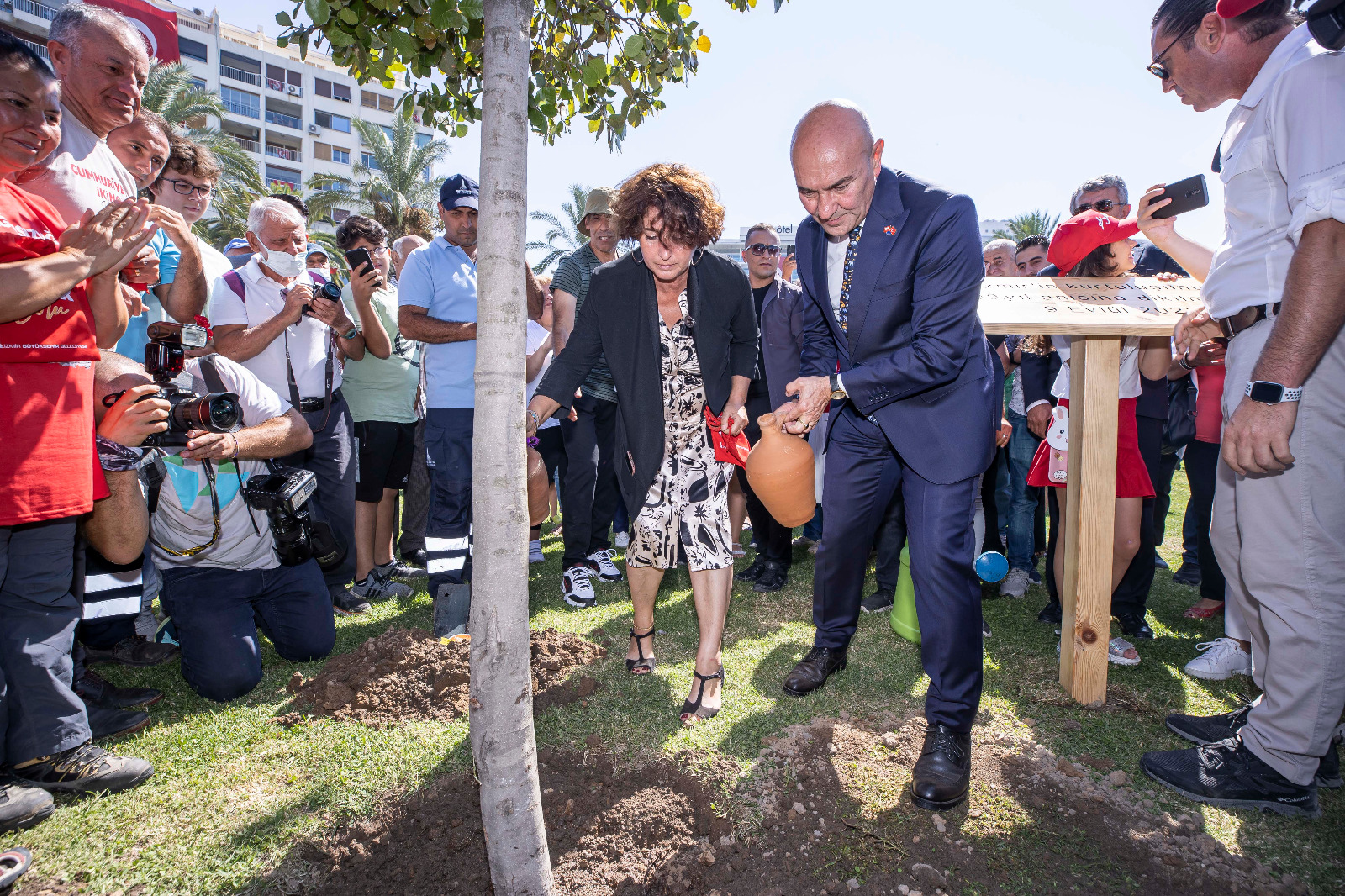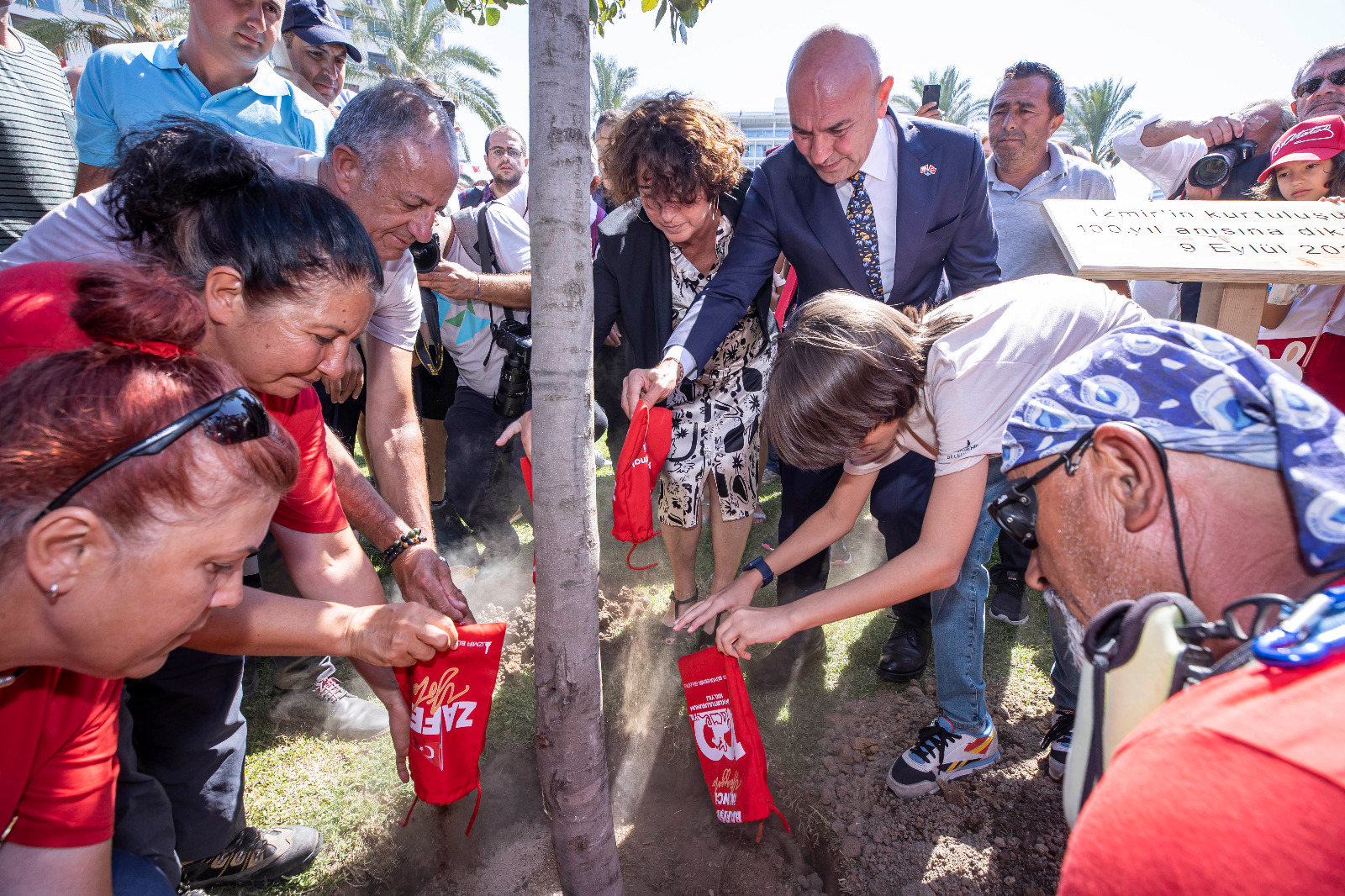 Törende Başkan Soyer ve eşi Neptün Soyer Cumhuriyet Meydanı’na İzmir’in kurtuluşunun 100’üncü yılı anısına meşe fidanı dikti. Fidan dikerken Afyon’dan İzmir’e gelen Zafer Yürüyüşü kafilesinin 400 kilometrelik güzergâhta şehitliklerden topladığı toprak, İzmir toprağıyda buluşturuldu. Törende İzmir Büyükşehir Belediyesi Dans ve Ritim Topluluğu’nun gösterileri renkli görüntülere sahne oldu.