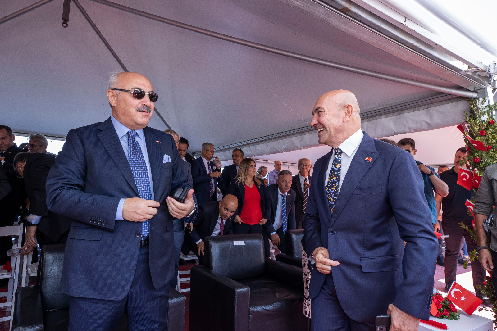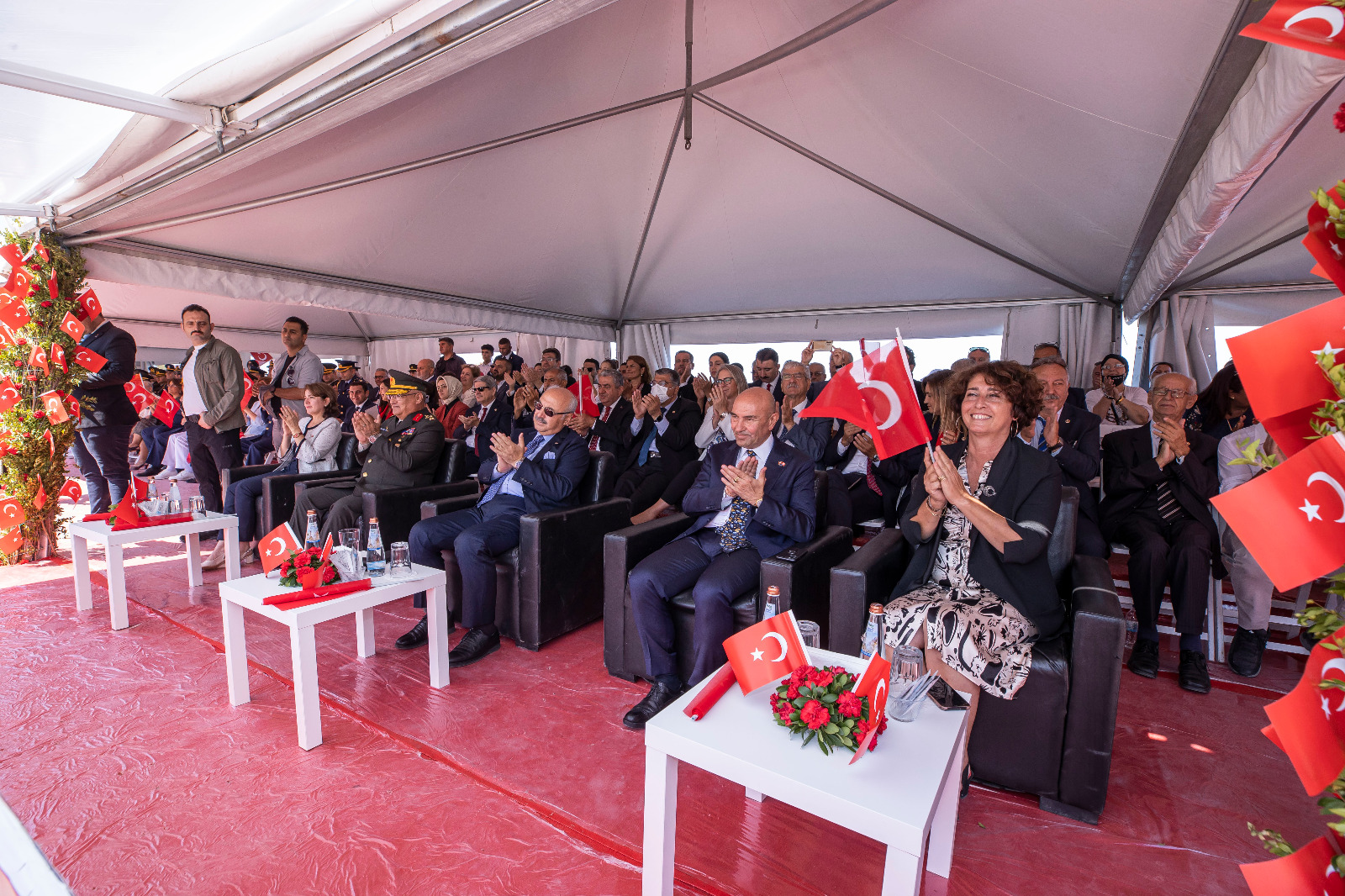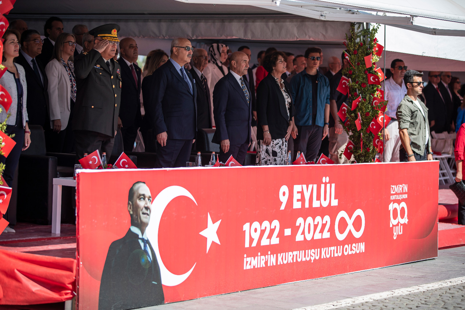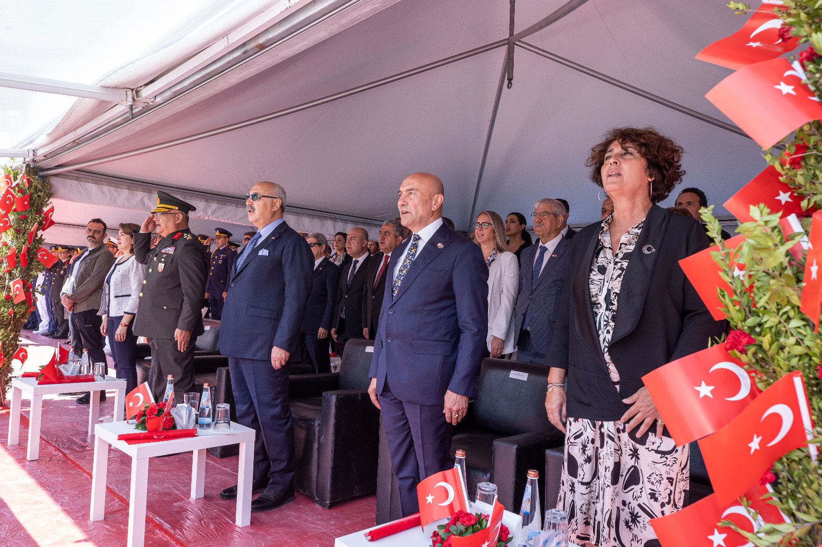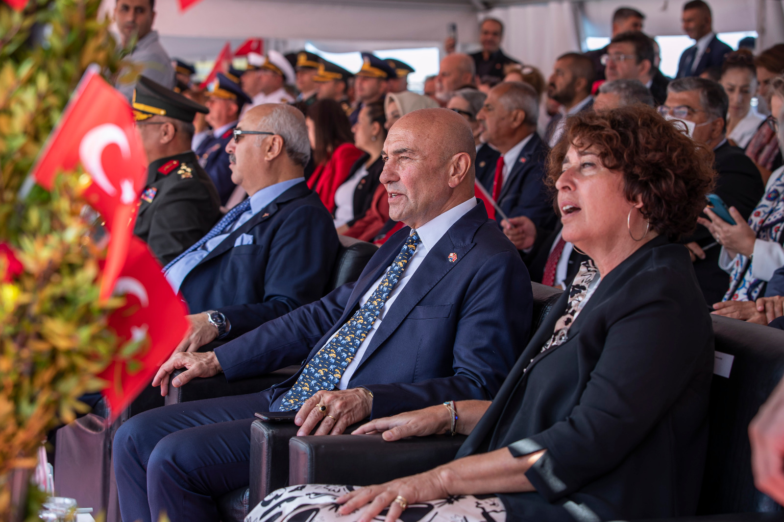 Törene İzmir Büyükşehir Belediye Başkanı Tunç Soyer’in yanı sıra eşi Neptün Soyer, İzmir Valisi Yavuz Selim Köşger, Ege Ordusu ve Garnizon Komutanı Korgeneral Kemal Yeni ve eşi Asuman Yeni, CHP İzmir milletvekilleri Kamil Okyay Sındır, Kani Beko, Mahir Polat, Tacettin Bayır, Sevda Erdan Kılıç, İYİ Parti İzmir Milletvekili Aytun Çıray, AK Parti İzmir Milletvekili Ceyda Bölünmez Çankırı, siyasi parti temsilcileri, büyükelçiler, rektörler, oda ve dernek başkanları ile yurttaşlar katıldı.