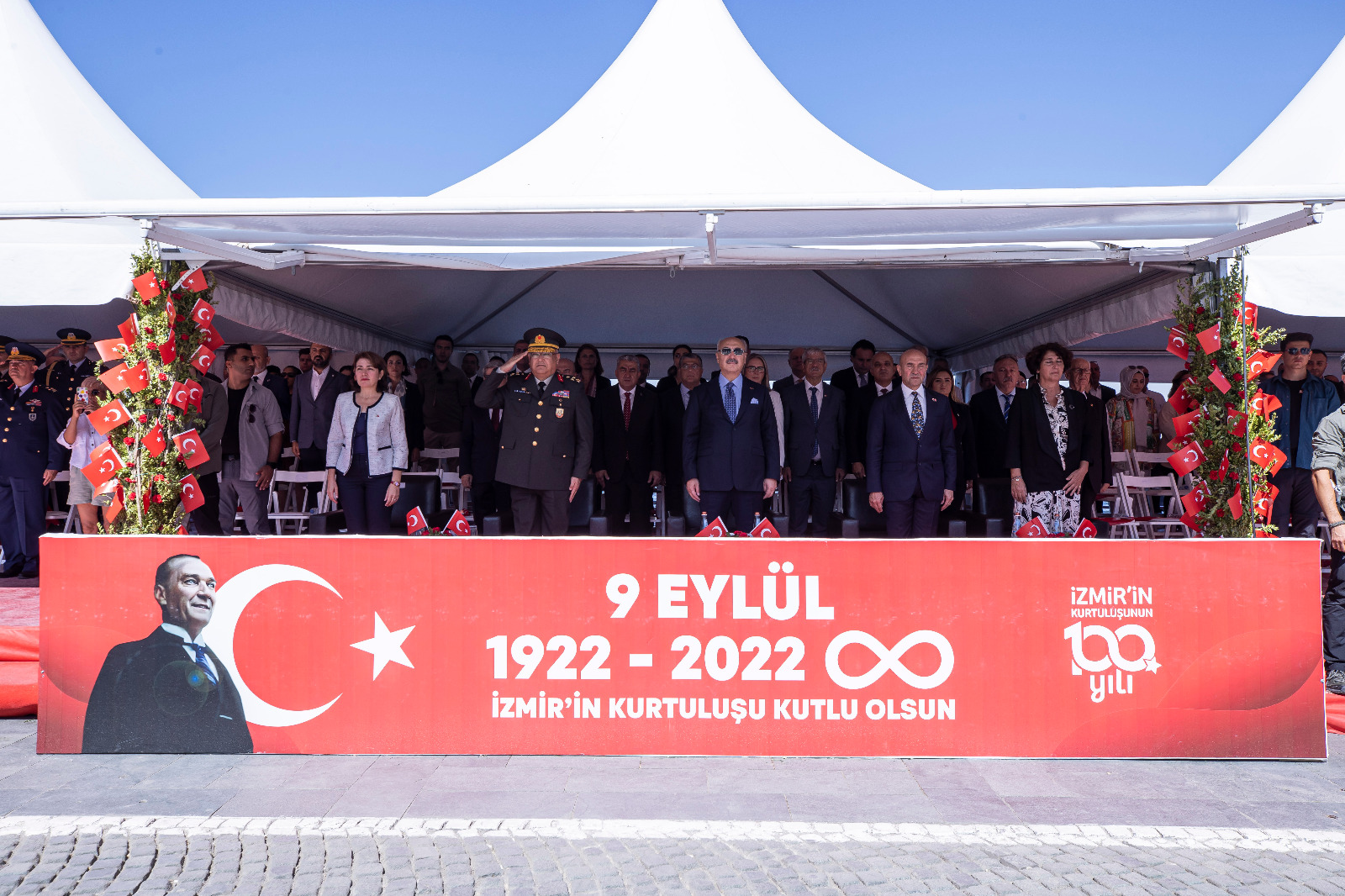 İzmir'in kurtuluşunun 100’üncü yıl kutlamaları büyük coşkuyla devam ediyor. Cumhuriyet Meydanı’nda düzenlenen törene katılan İzmir Büyükşehir Belediye Başkanı Tunç Soyer, “Her bir hücremize kadar İzmirli olmanın onurunu yaşadığımız 9 Eylül tarihi sadece bir şehrin kurtuluşu değildir. Aynı zamanda işgal edilmiş, kuşatılmış bir ülkenin hürriyetine ve bağımsızlığına kavuştuğu günün tarihidir. Bir milletin ayağa kalkışı ve Cumhuriyetimizin doğuşu, 100 yıl önce bugün gerçekleşti. Bu nedenle hep ‘İzmir, umudun yüzüdür’ diyorum” diye konuştu.