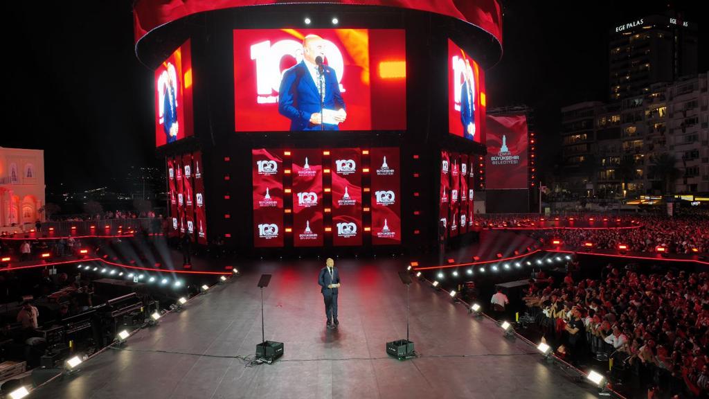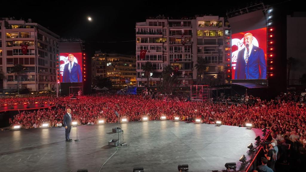 İzmir'in kurtuluşunun yüzüncü yılında, destek veren herkese teşekkür ederek konuşmasına başlayan İzmir Büyükşehir Belediye Başkanı Tunç Soyer, “İzmir’in kurtuluşunun yüzüncü yılında, tarihin akışının değiştiği bu meydanda birlikte olmanın büyük coşku ve heyecanını yaşıyorum. Cumhuriyet Halk Partimizin değerli Genel Başkanı Sayın Kemal Kılıçdaroğlu İzmir’e hoş geldiniz. Cumhuriyetimizin ikinci yüzyılına girerken bizleri onurlandırdınız. Rehberliğiniz, liderliğiniz için minnettarız. Bu tarihi gecenin yaşanmasında emeği geçen tüm ekip arkadaşlarım… Belediyemizin değerli çalışanları… Hepinize sonsuz teşekkür ediyorum. Ve Tarkan… Megastarımız. Dostumuz. Ülkemizin her karış toprağının, her ağacının ve tüm mazlumlarının üzerine titreyen değerli yol arkadaşımız. Bu tarihi akşamda gösterdiğin vefayı İzmir asla unutmayacak” dedi.